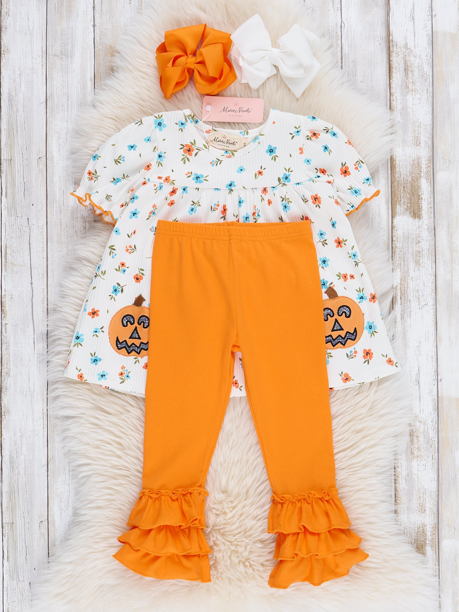 Spice up your little one's wardrobe with our Embroidered Jack-O-Lantern Garden Outfit! The floral top features playful embroidered jack-o-lanterns, while the orange ruffle leggings add a pop of color. Perfect for spooky season, this sister set is a fun and unique addition to any girl's outfit collection.
