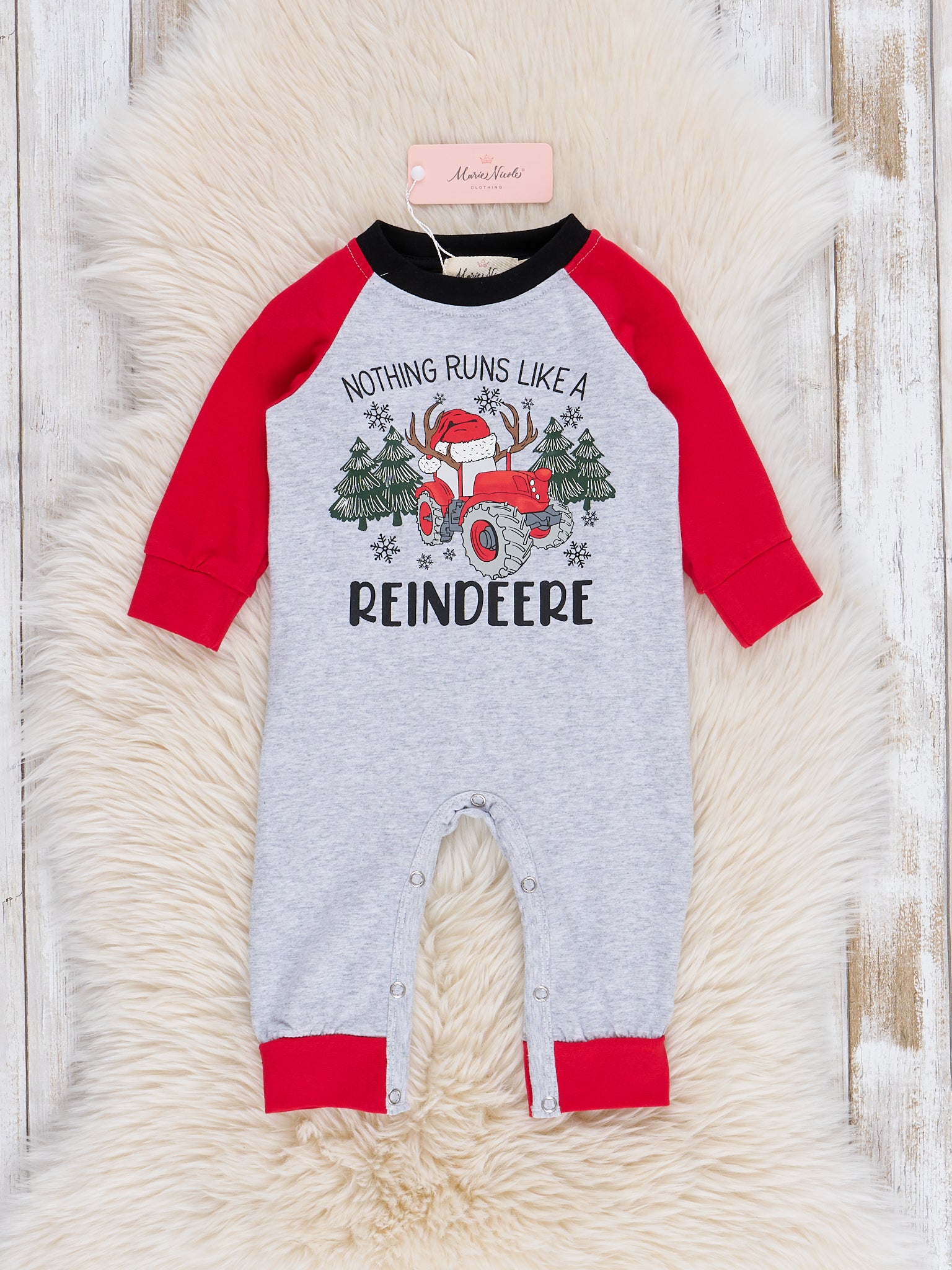 This brother set features a playful grey romper for boys with "Nothing Runs Like a Reindeere" sloga & red raglan sleeves. Because nothing runs like a reindeer, your little one will be ready for any adventure in this quirky and fun outfit.