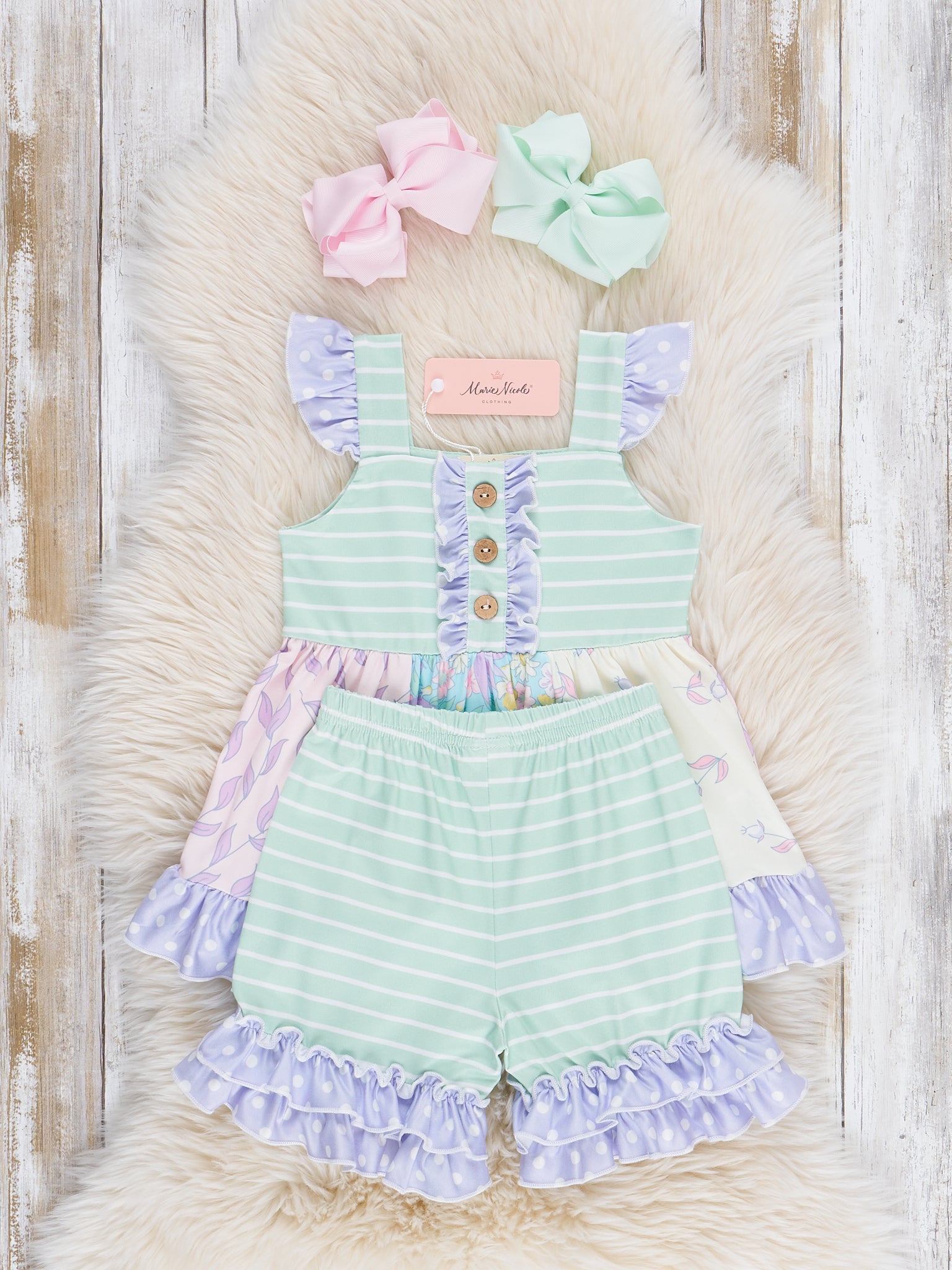 Get ready for a fun day at the beach in our Pastel Buds & Blooms Ruffle Outfit! This playful girls shorts set from Marie Nicole Clothing features a dainty combination of mixed floral prints, mint stripes, and lavender polka dots. Perfect for summer and even better as a sister set!