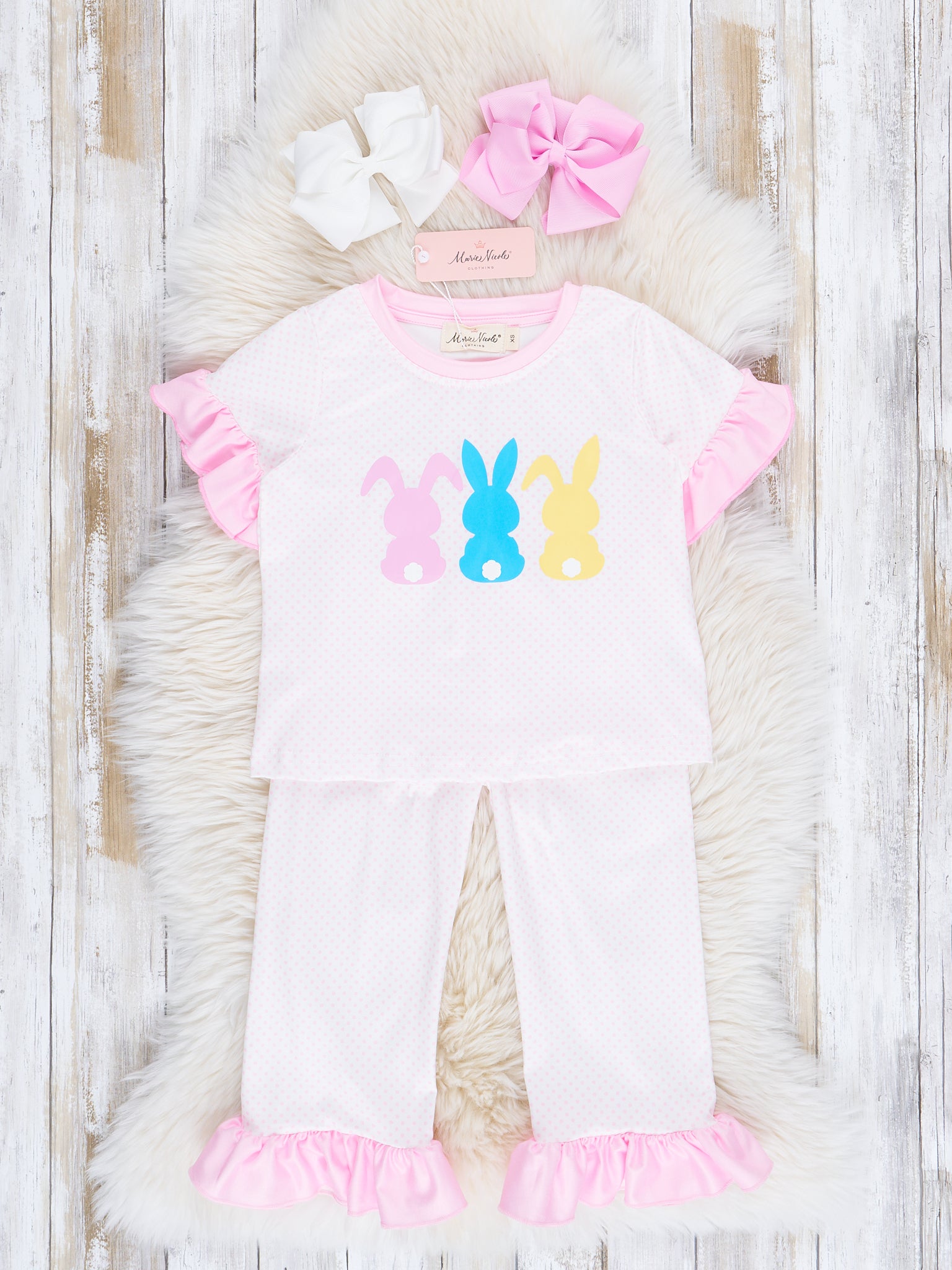 Get ready for a hoppy Easter with our Pink Cottontail Ruffle Pajamas. This bunny-themed sibling set will make bedtime a little more playful. The ruffled details & classic pink polka dots add a touch of sweetness to these comfortable pajamas. Perfect for egg hunts and snuggle sessions!