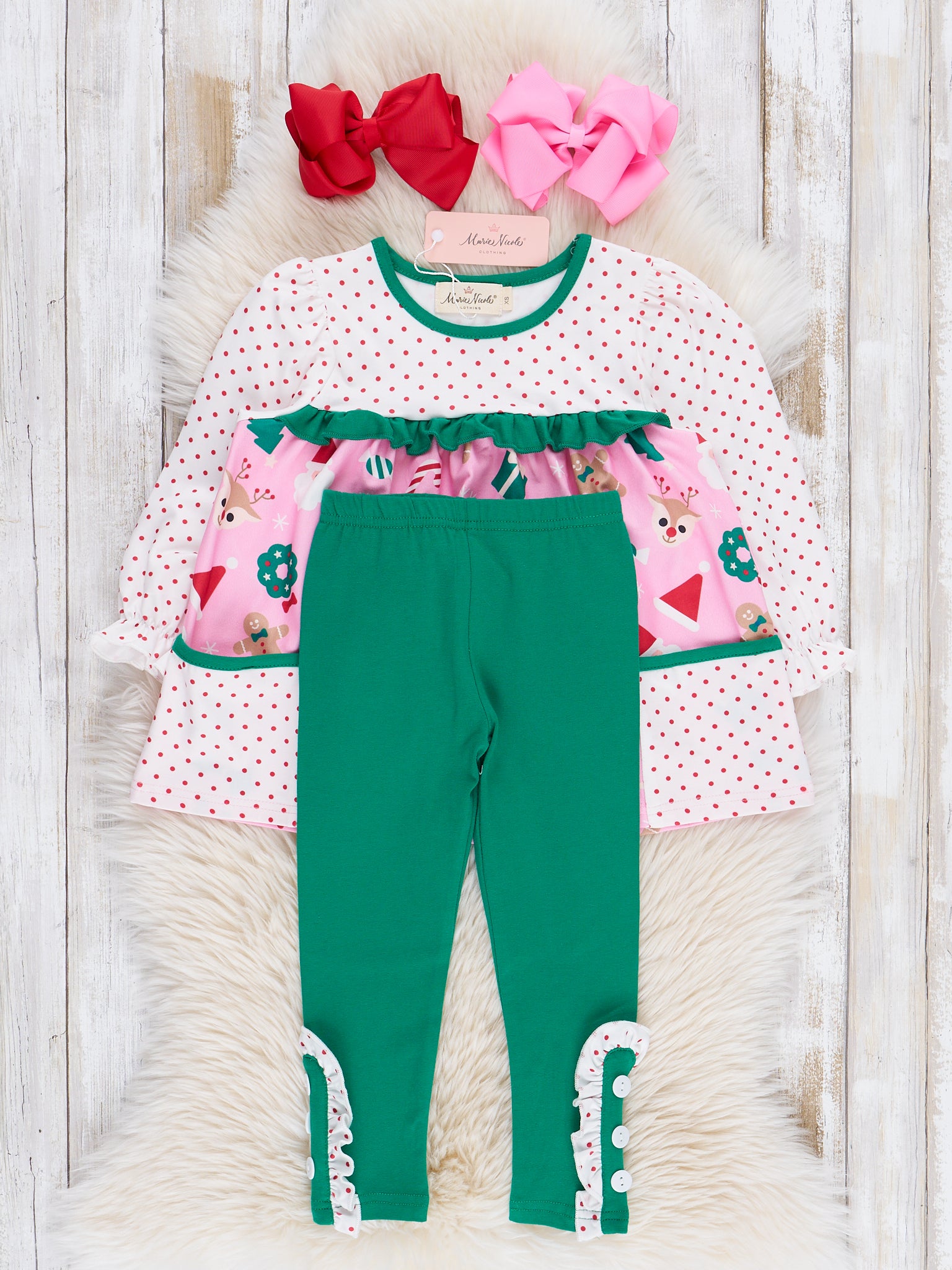 This holiday season, let your little girl sparkle in our Pink & Green Holiday Magic Outfit. With a festive Christmas print and charming pink polka dot detailing, this girls' outfit is perfect for creating magical memories. Complete the look with the adorable green ruffle leggings, and don't forget to check out our matching sister set!