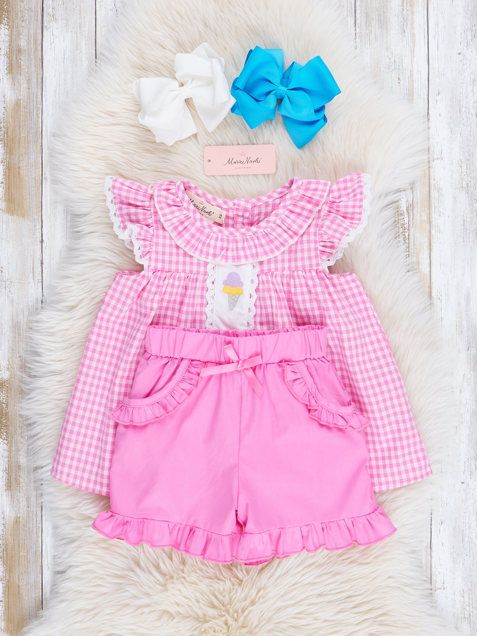 Add a sprinkle of sweetness to your little one's wardrobe with our Rose Sweet Treats Embroidered Plaid Bubble! This cute and fun sister set features a charming pink plaid design adorned with delicate embroidered summer treats. The bright pink shorts make this outfit even sweeter! Perfect for all their summer adventures!!