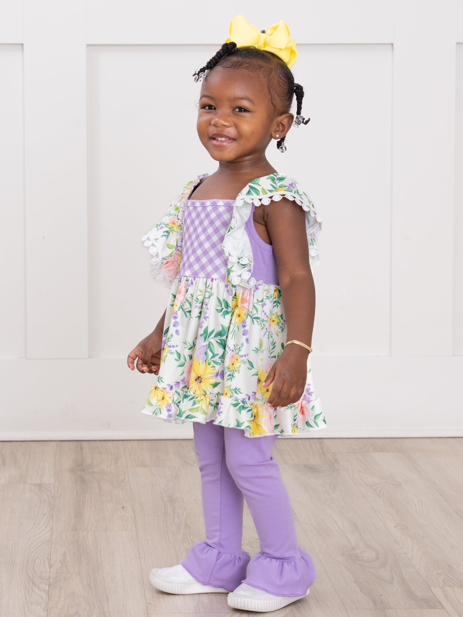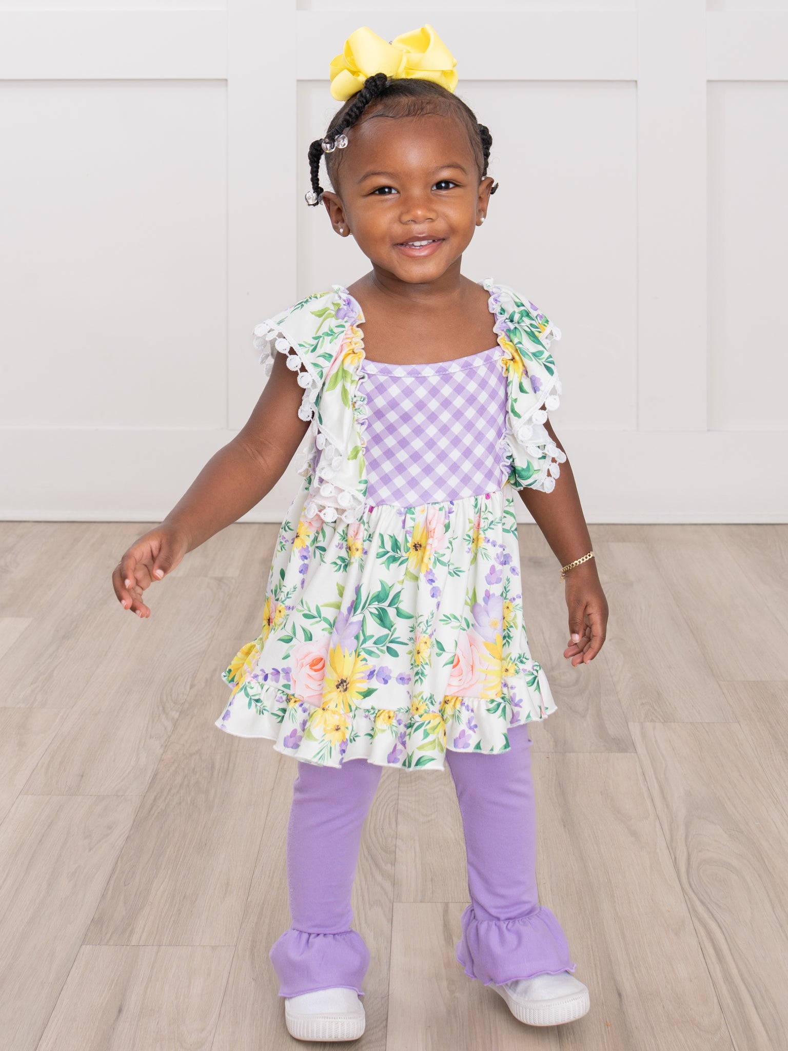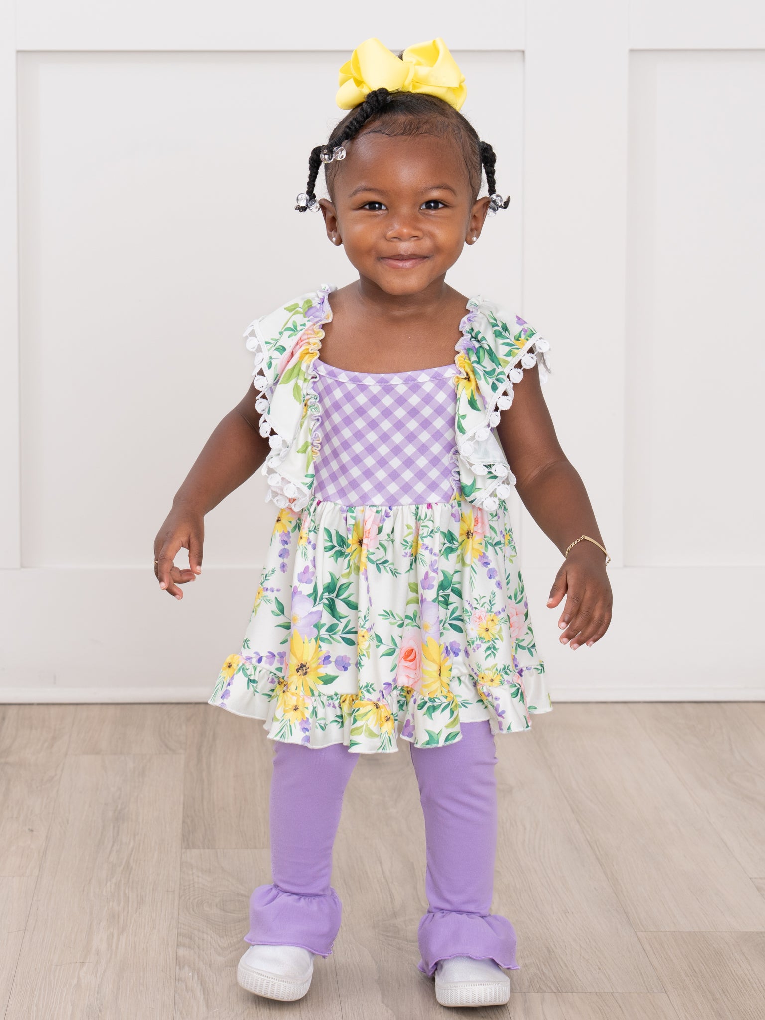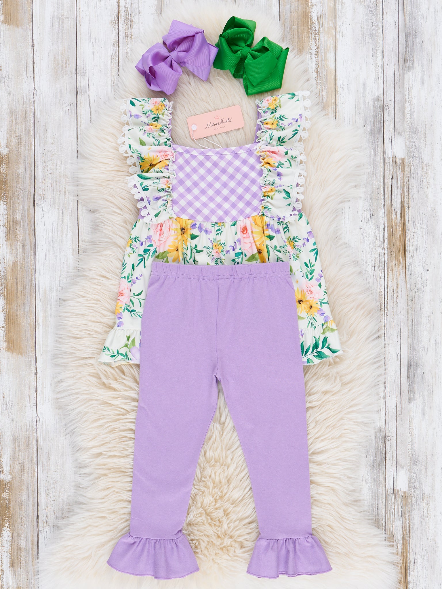 Get ready for spring with this adorable Spring Floral Gingham Ruffle Outfit from Marie Nicole Clothing! This girls outfit is perfect for sisters and features a playful mix of floral and gingham patterns. The ruffle swing top and matching leggings will have your little one looking cute and comfortable all day long!