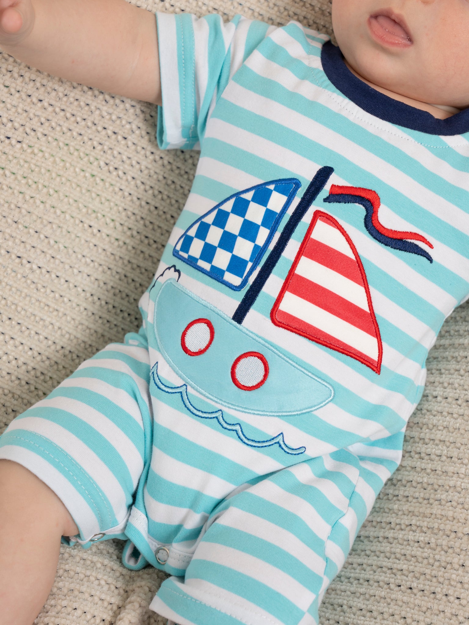 Set sail in style with this Teal Stripes Sailboat Romper! Its unique combination of stripes and a navy collar give a bold yet classic look, perfect for any adventure. A brother set option also allows for matching looks.