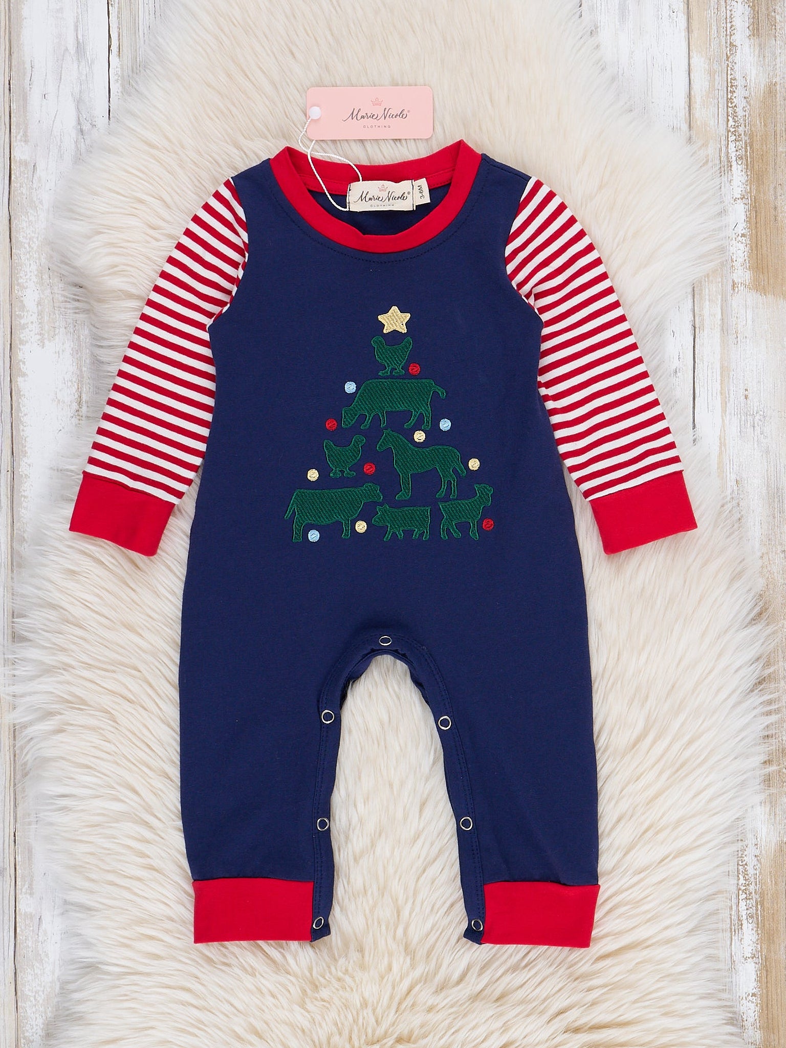 Navy & Red Stripe Embroidered Tree Romper