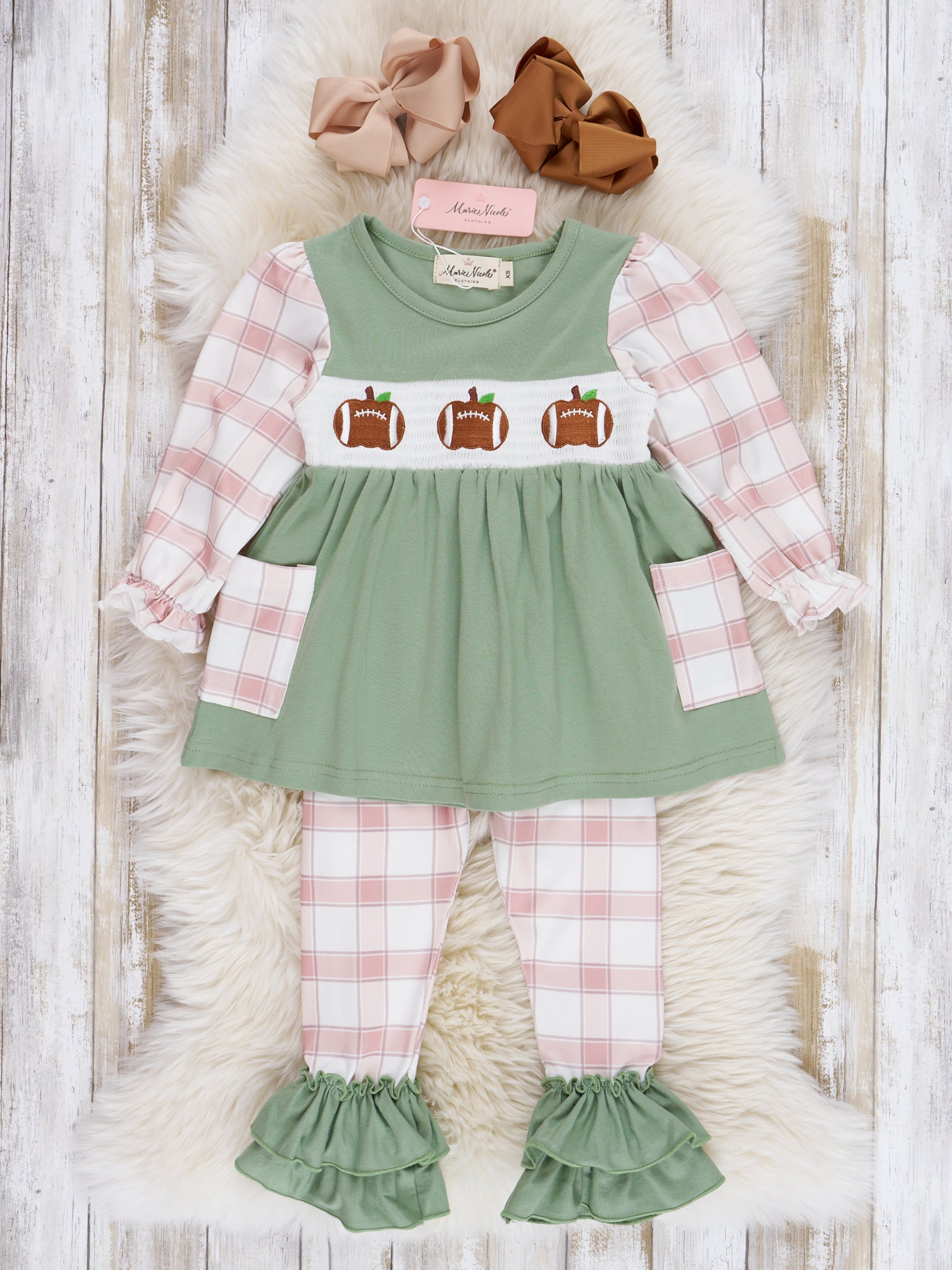 Tan & Olive Plaid Smocked Football Sibling Set