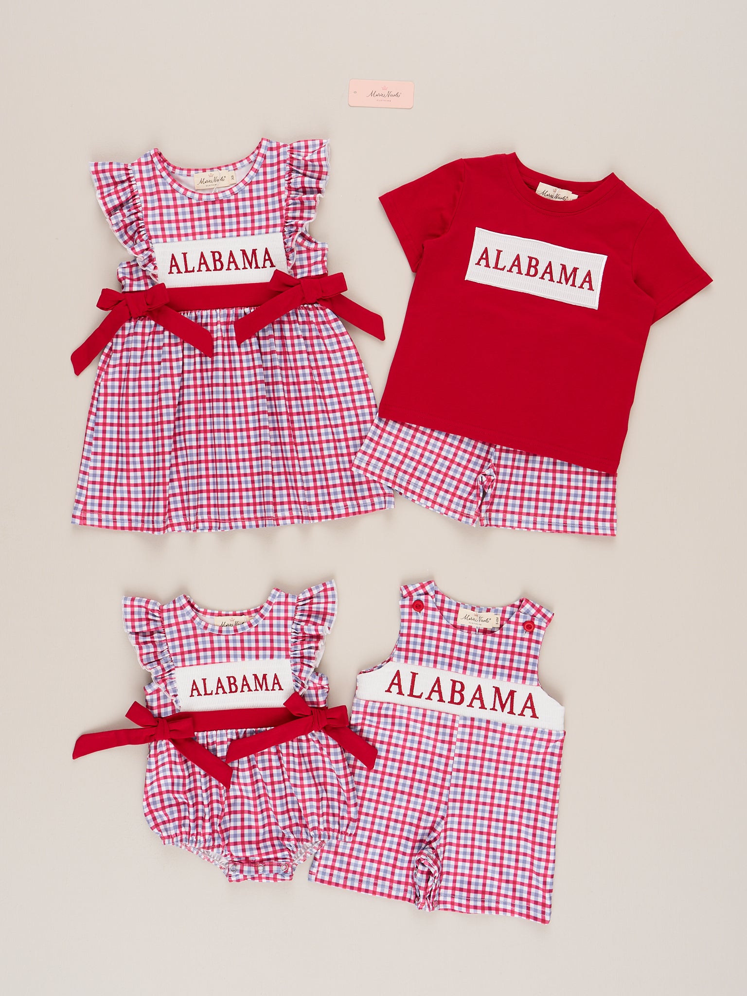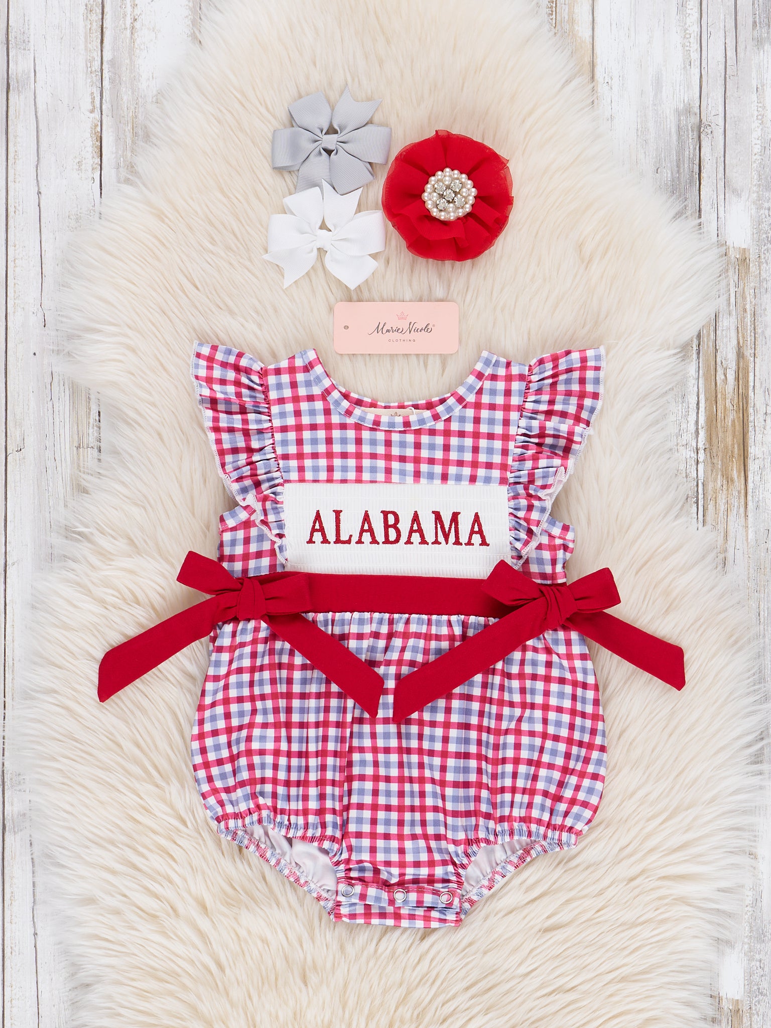 The Alabama Smocked Gingham Bubble is the perfect blend of playful charm and team spirit for your tiniest fan. This adorable one-piece features a classic red and gray gingham print, flutter sleeves, and a smocked panel embroidered with “Alabama.” Soft, lightweight, and designed with snaps for easy changes, this bubble from Marie Nicole Clothing is a game day must-have. Finished with sweet red side bows, it’s a spirited look made for cheering in comfort and style.