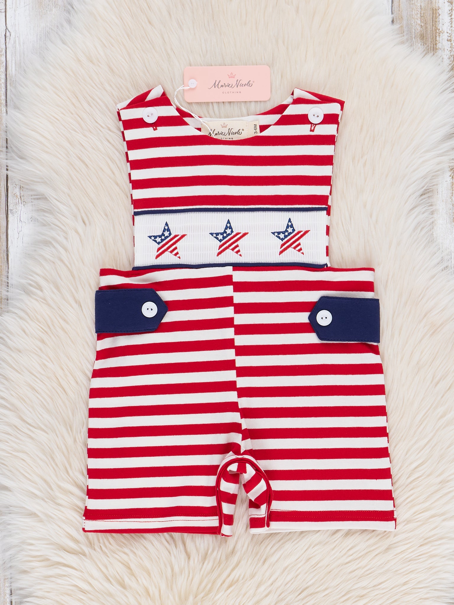 Get ready for some serious star-spangled cuteness with our American Stars Smocked Johnny! Perfect for the 4th of July, this boys romper features embroidered flag stars over smocking and red stripe bodice. Also great as a sibling set from Marie Nicole Clothing. USA, all the way! 🇺🇸