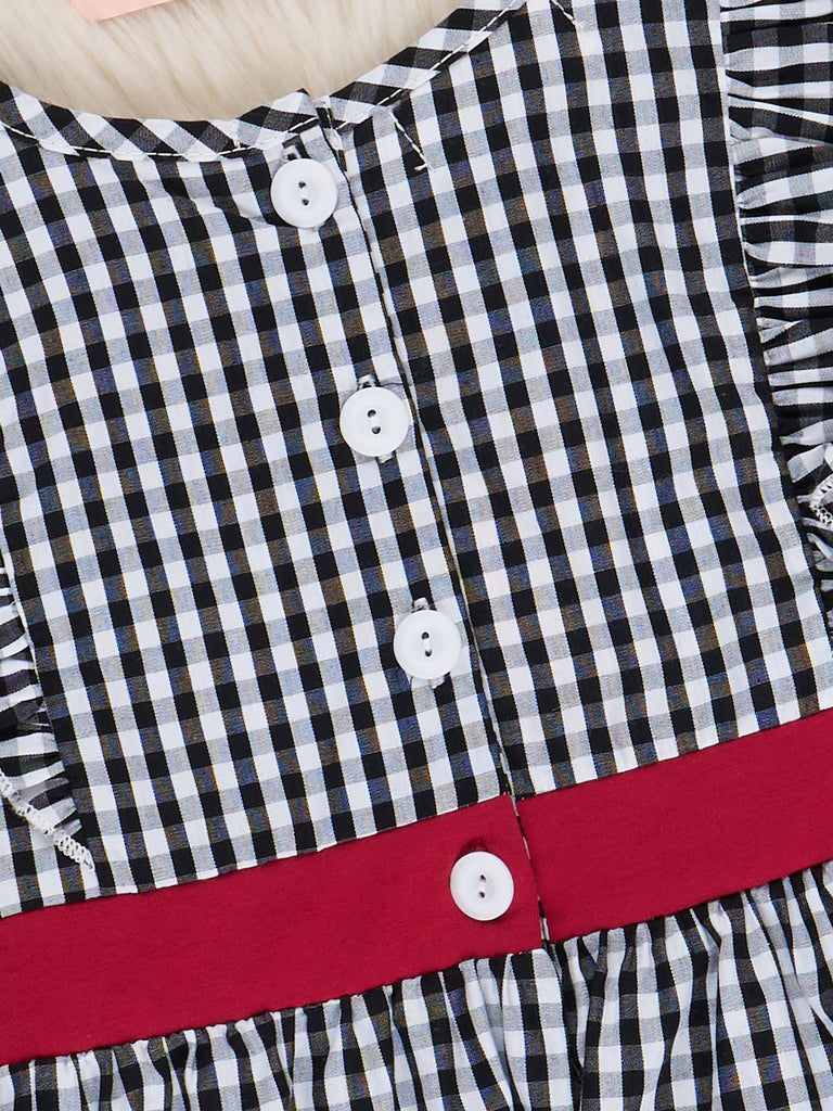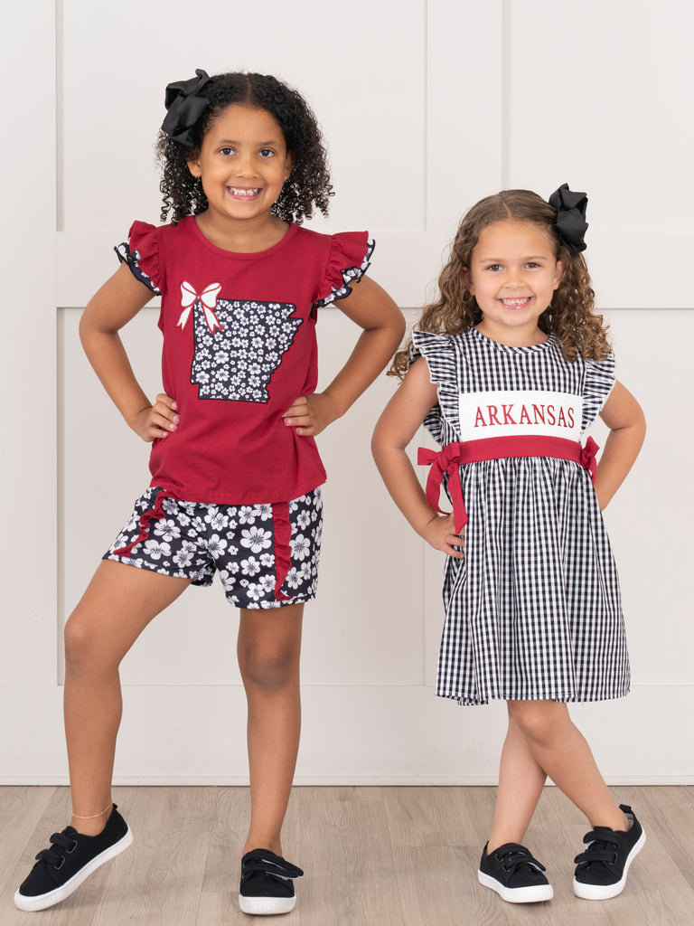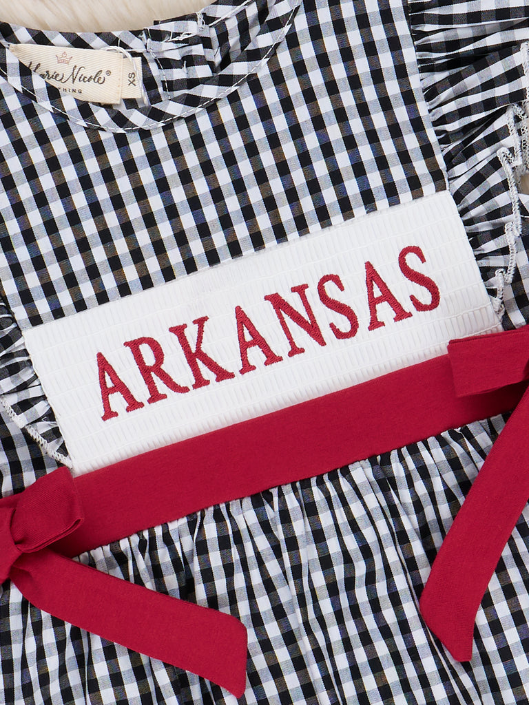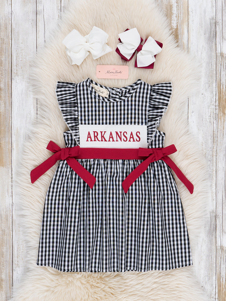The Arkansas Smocked Gingham Dress is a darling combination of Southern charm and team spirit. Featuring a classic black and white gingham pattern, sweet ruffle sleeves, and a smocked panel embroidered with “Arkansas,” this dress from Marie Nicole Clothing is perfect for game days, family gatherings, or sunny day adventures. Finished with bold red waist ties for a polished look, it’s a spirited style your little fan will love to twirl in.