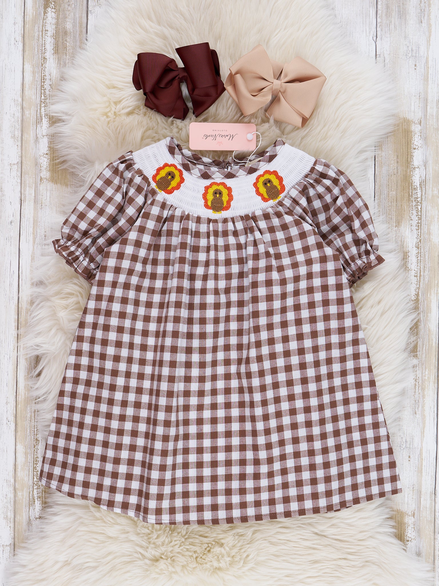 Your little one will be the life of the Thanksgiving party in our Autumn Gingham Turkey sibling set! The brown & white gingham fabric is classic and timeless, while the embroidered turkey makes this dress a playful, fun statement piece. Plus, this sibling set is perfect for twinning! Gobble gobble!