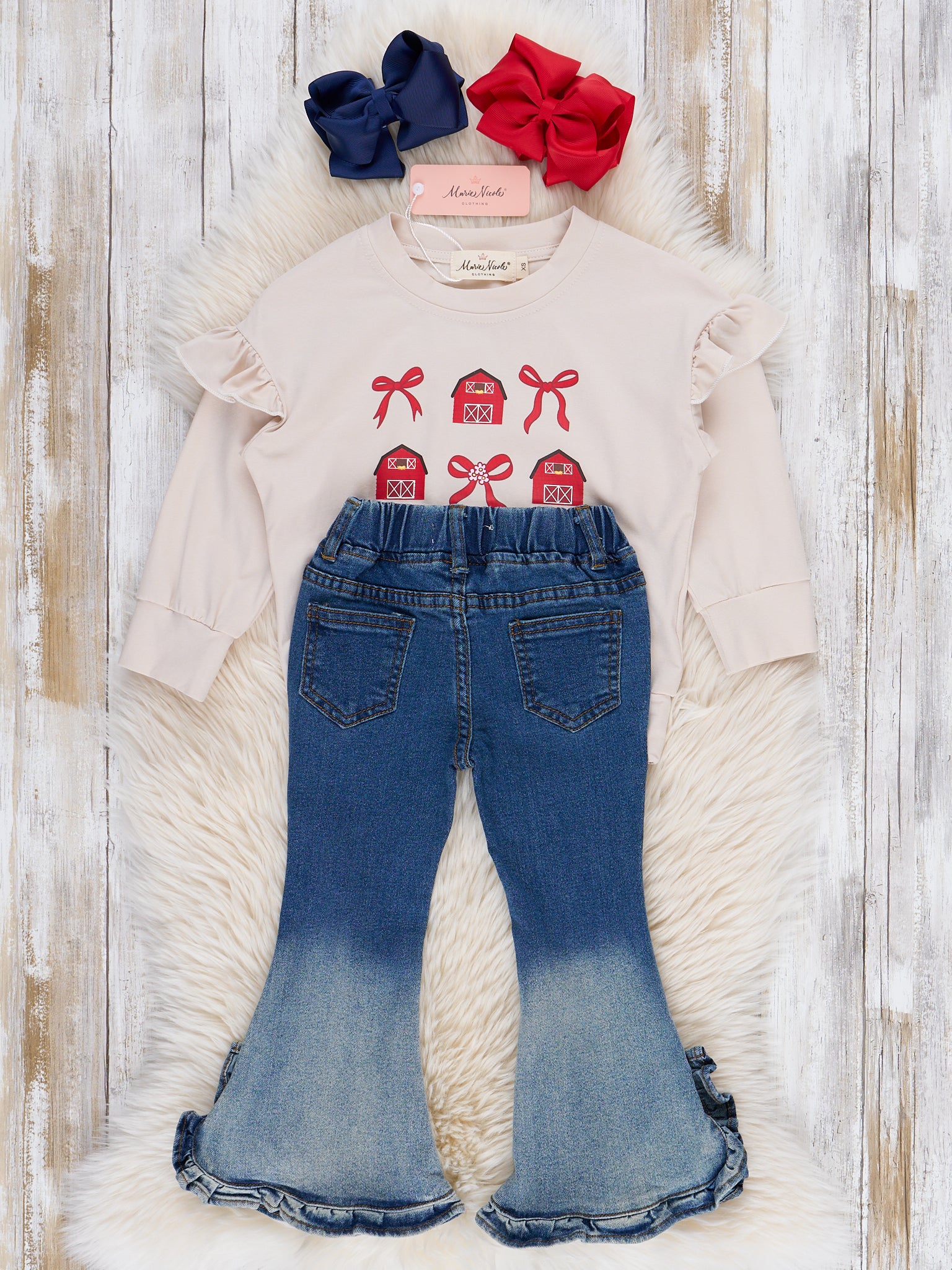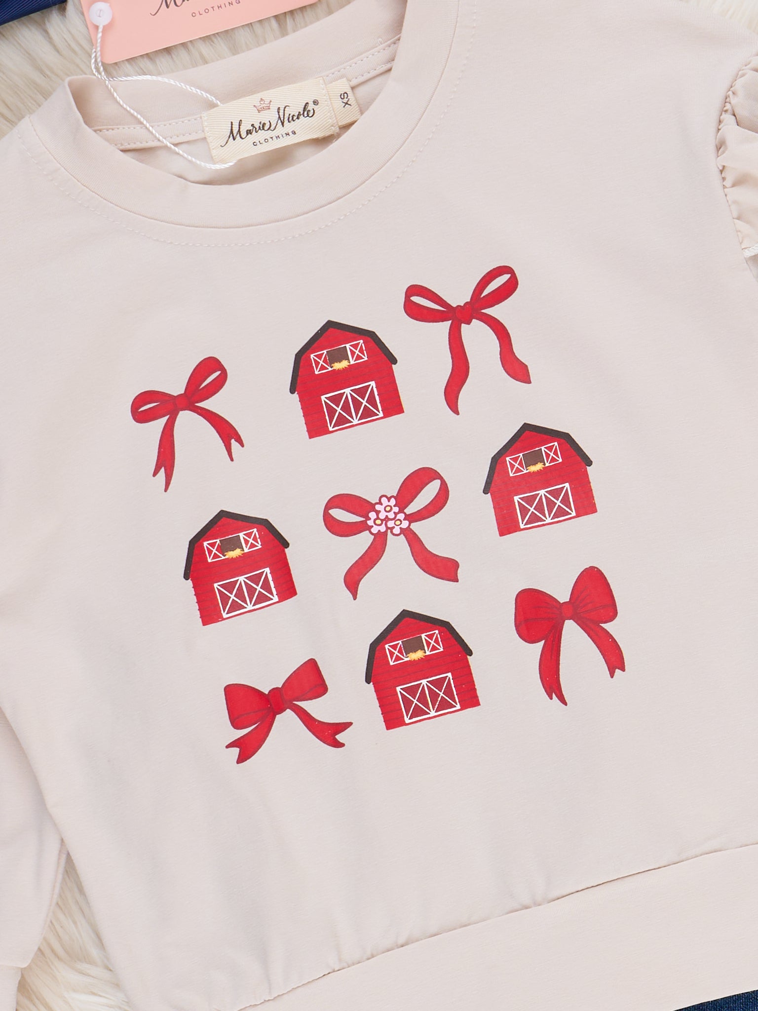 The Barns & Bows Ruffle Denim Outfit is a playful and rustic choice that’s perfect for farm days and fall adventures. Featuring charming barnyard prints, sweet bow details, and soft ruffle accents, this outfit from Marie Nicole Clothing blends country charm with everyday comfort. Paired with classic denim for a stylish twist, it’s ideal for hayrides, harvest festivals, and picture-perfect moments.