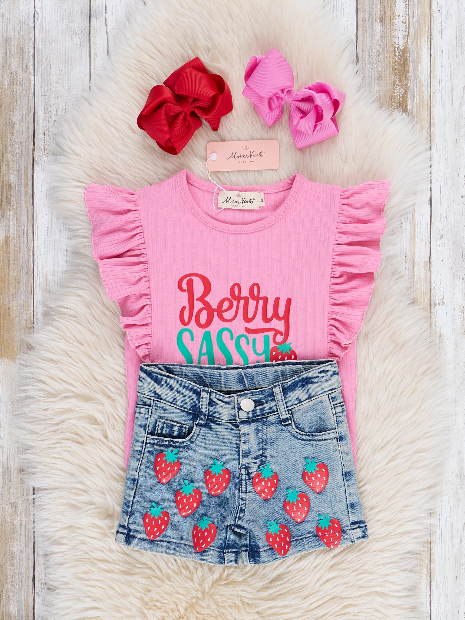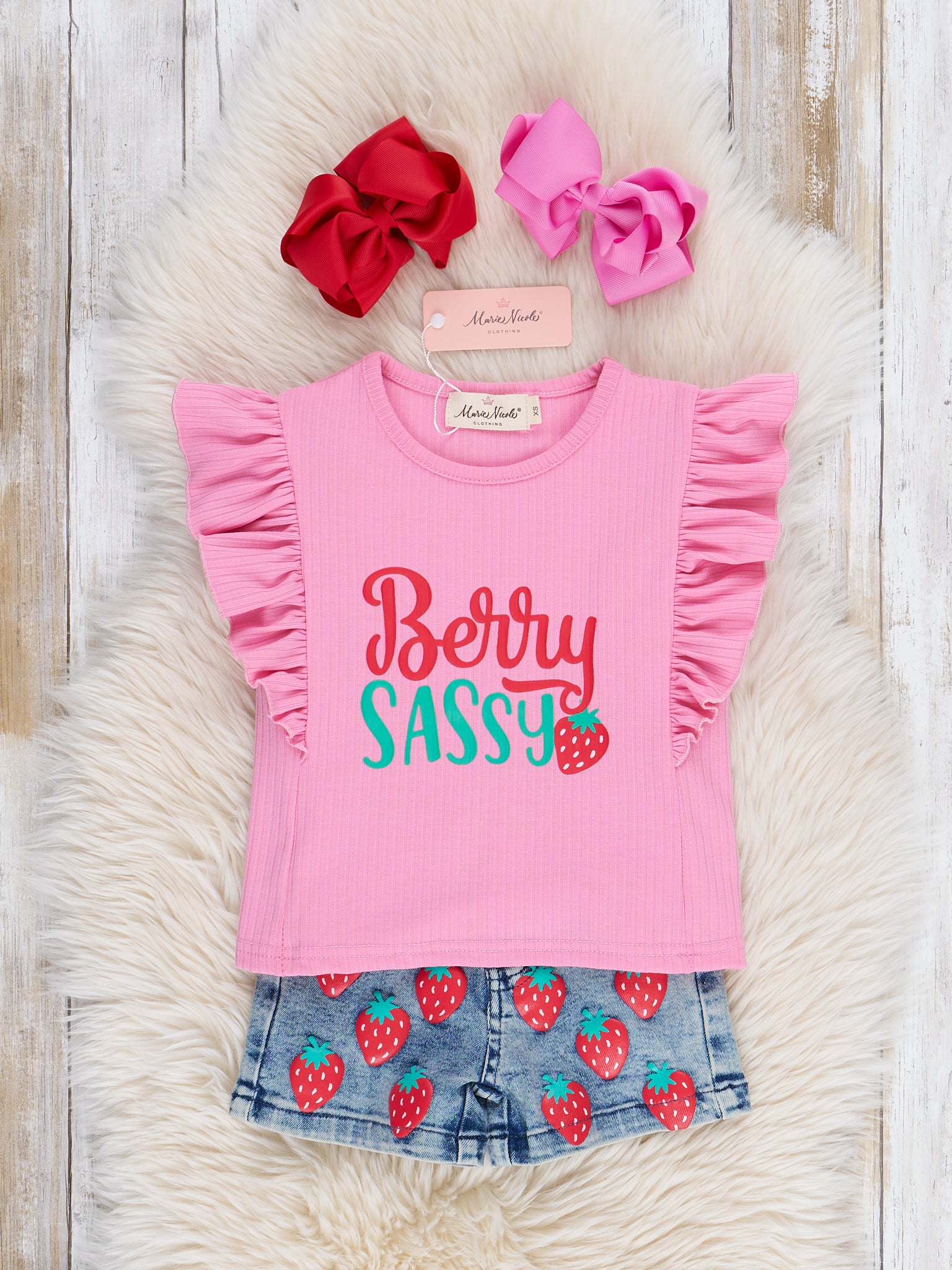 Get your little one ready for summer with the Berry Sassy Denim Outfit! This girls' outfit features a pink ribbed ruffle top with a playfully punny "Berry Sassy" graphic, and vinyl strawberries on the denim shorts. Perfect for warm weather adventures, courtesy of Marie Nicole Clothing.