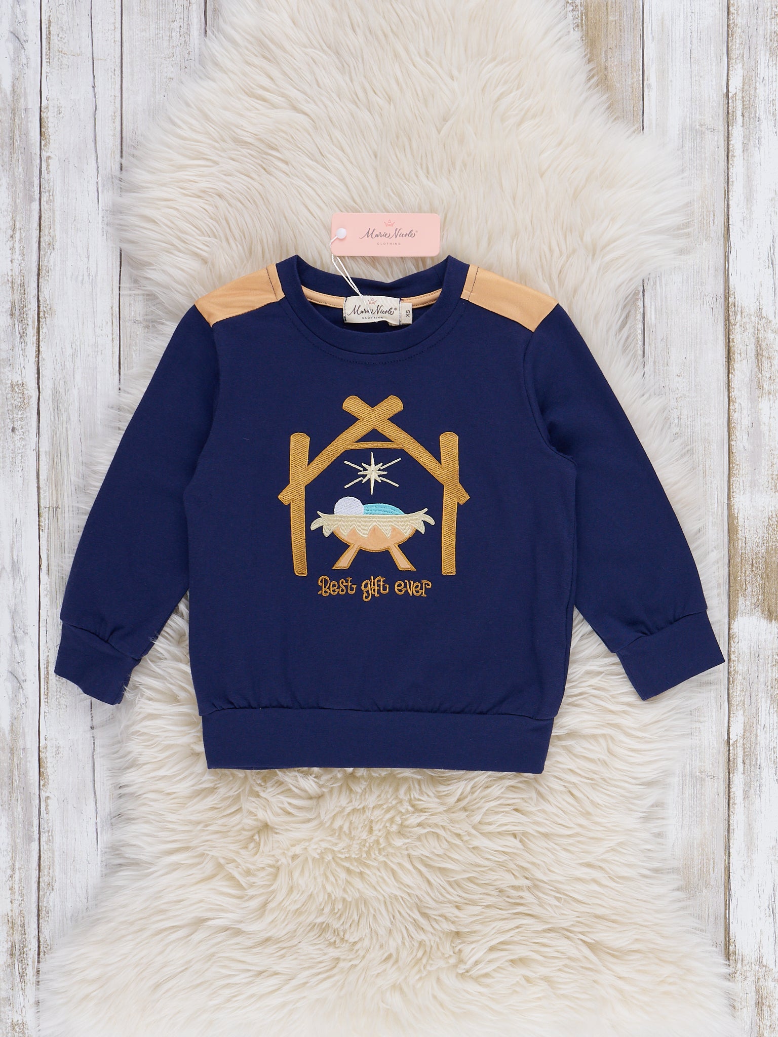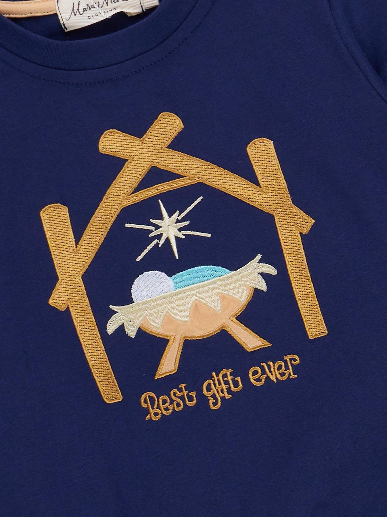 Celebrate Christmas in style with our "Best Gift Ever" Nativity Shirt. This adorable boys top features an embroidered Nativity designed bodice with gold patch shoulders. Perfect for celebrating the "best gift ever" of the holiday season. Shop the full sibling set!