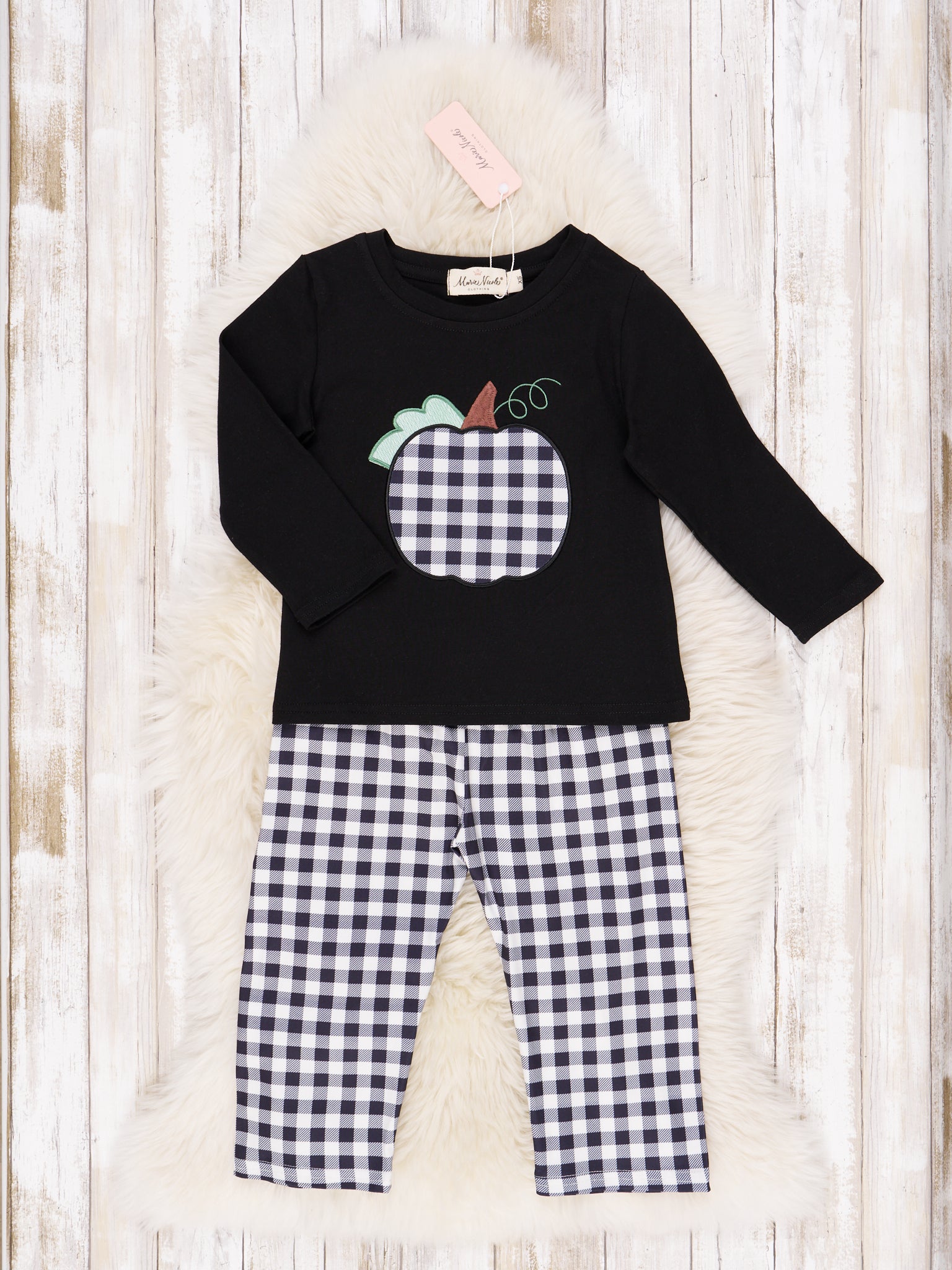 This charming brother set is perfect for a trip to the pumpkin patch! This outfit features a black long-sleeve shirt with the cutest embroidered pumpkin, & black gingham pants.