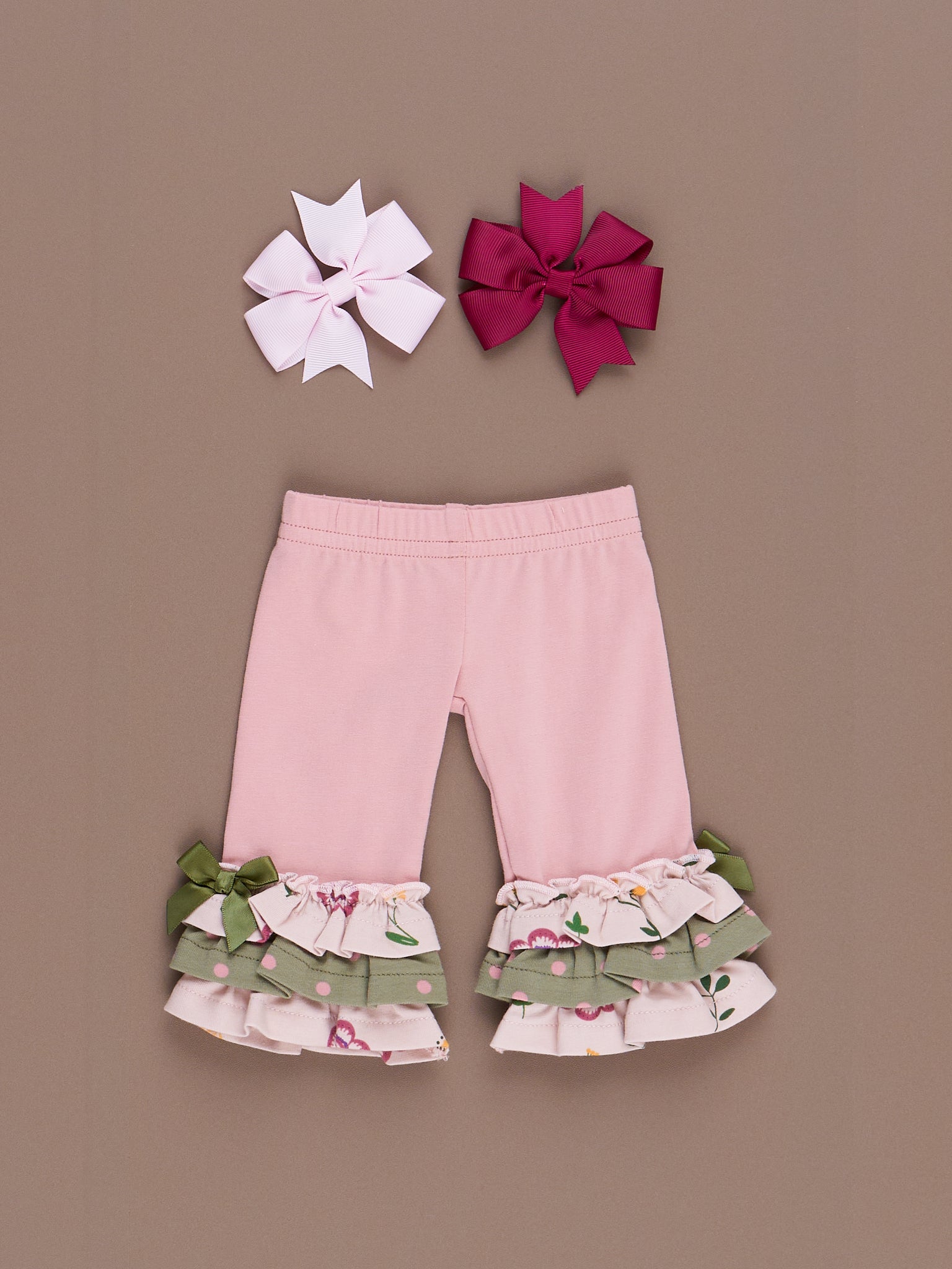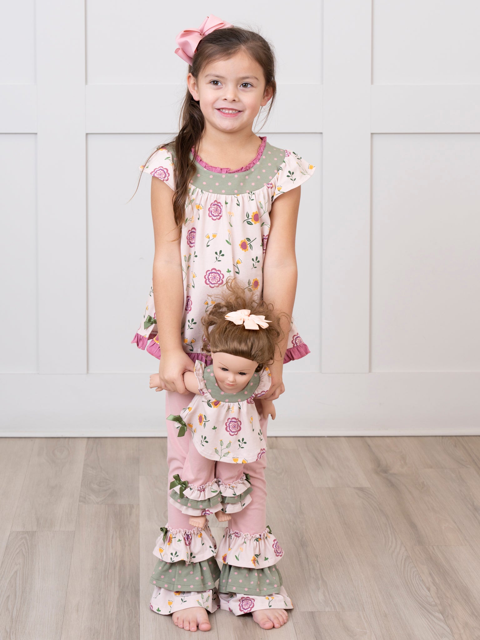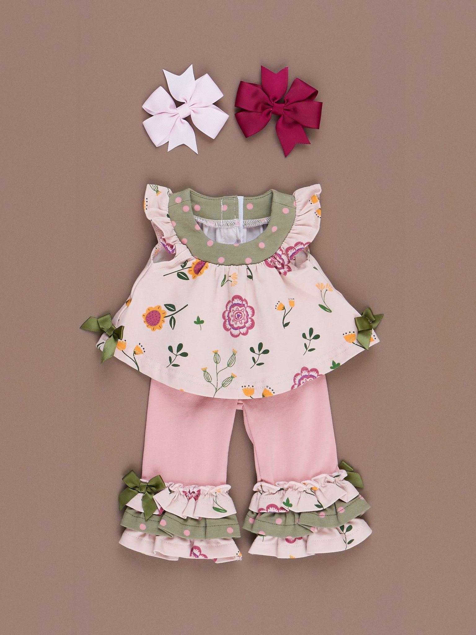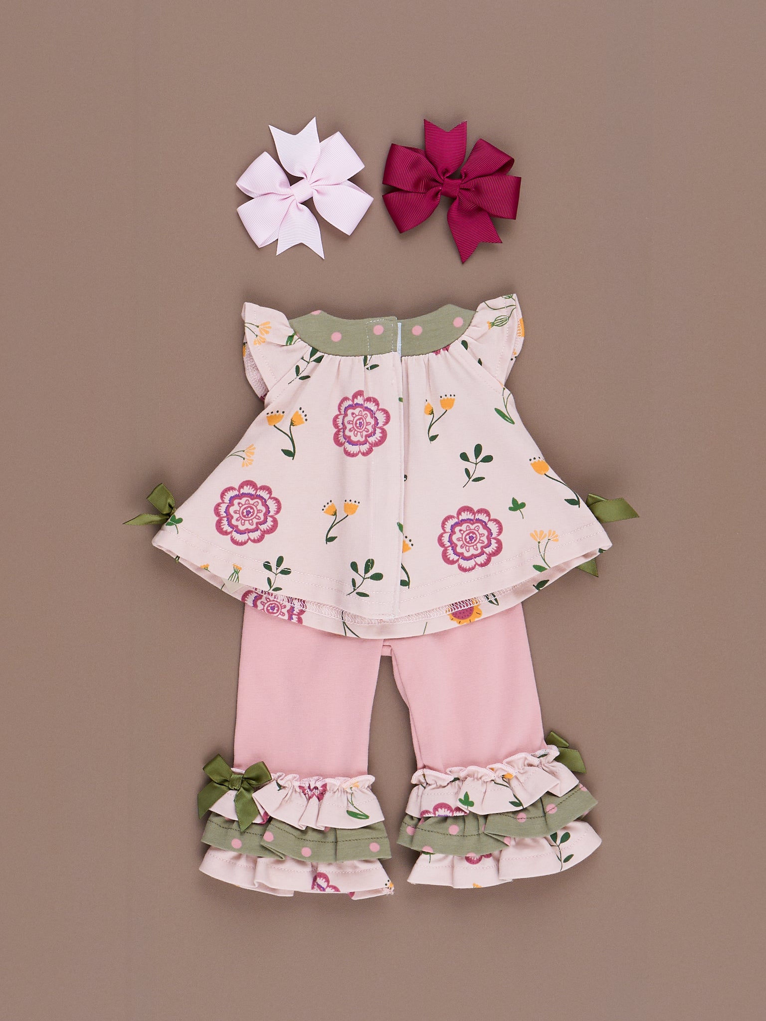 These doll outfits feature our Bloomberry Fields print, ruffle trim, & velcro backs for easy changing.