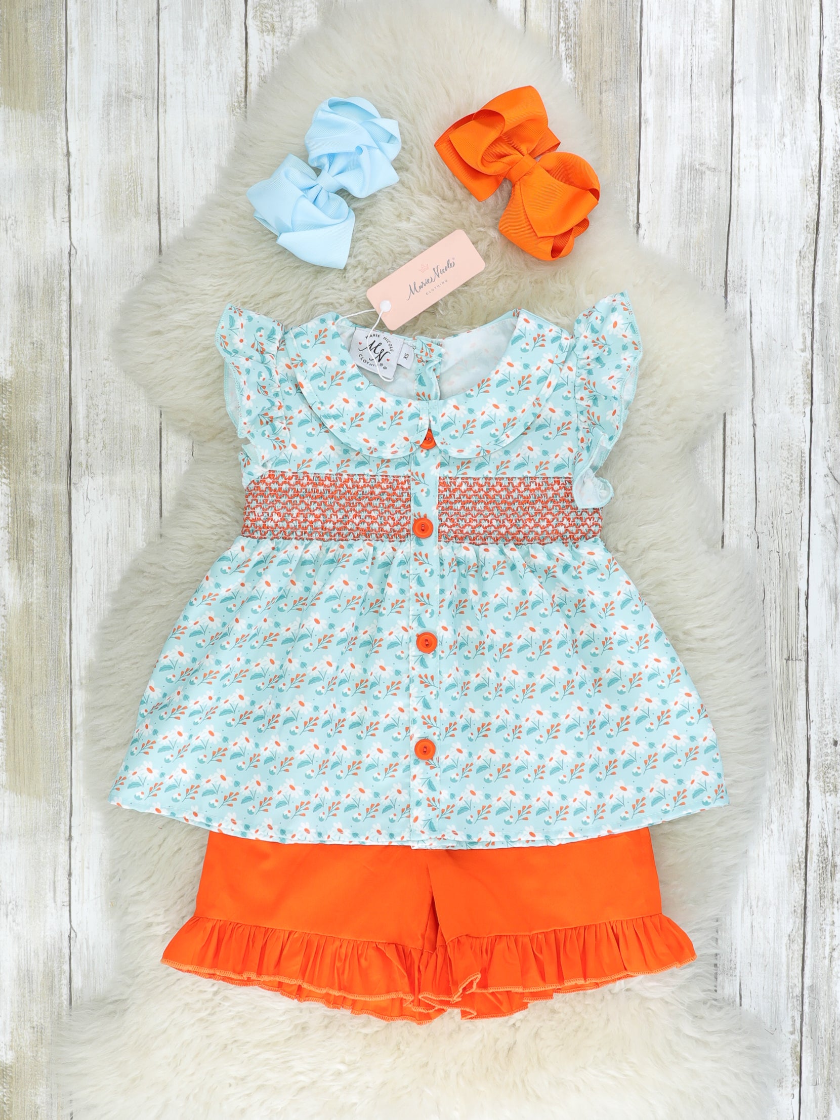 A stunning sister set for your gorgeous daisies! This outfit features a blue tunic with smocking, a peter pan collar, darling daisies, decorative buttons, flutter sleeves, & orange shorts with an elastic waistband.