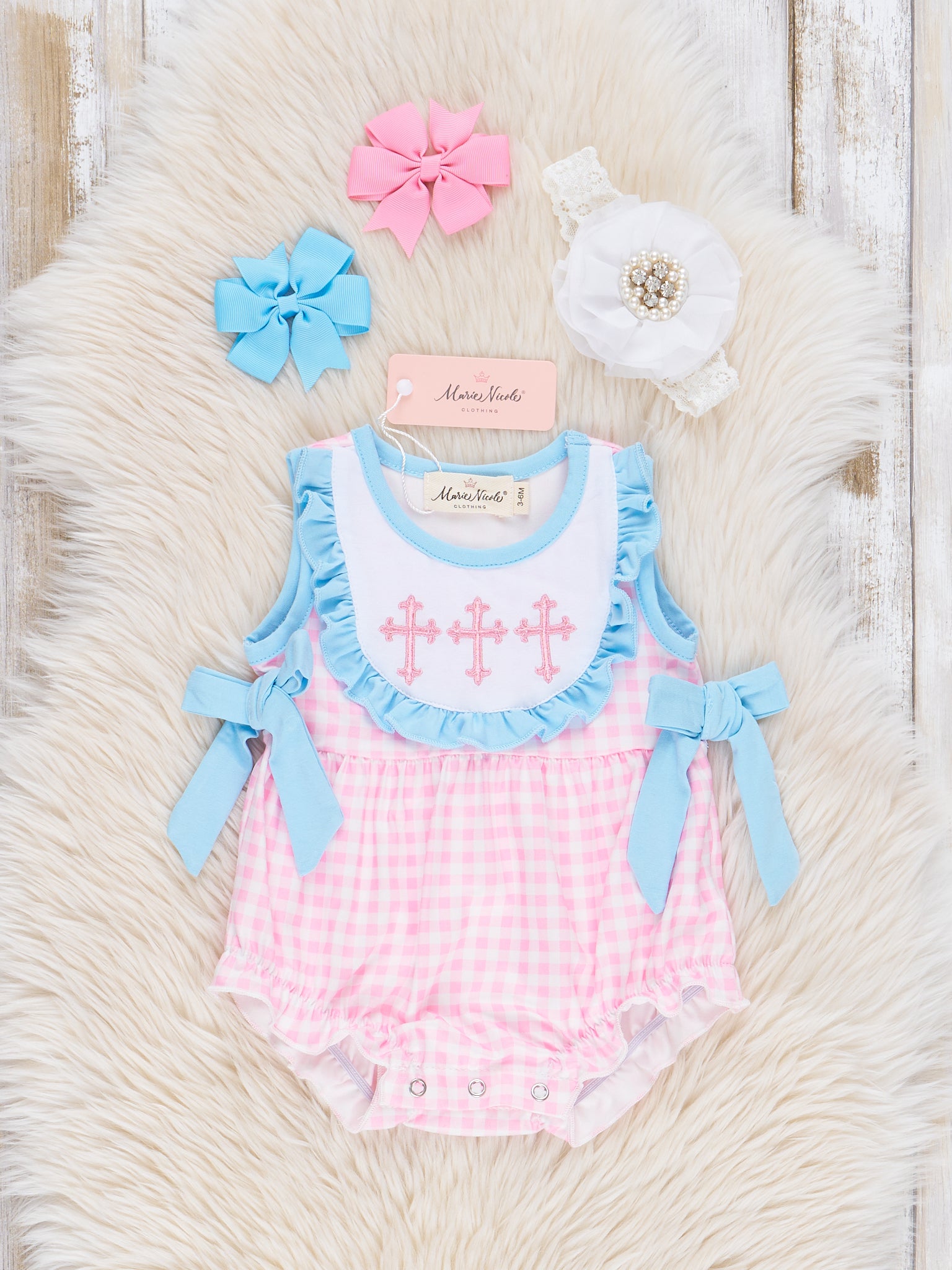 The perfect sister set for church on Easter Sunday! This bubble by Marie Nicole Clothing features pink gingham, blue ruffle trim, bow details, & embroidered cross details.