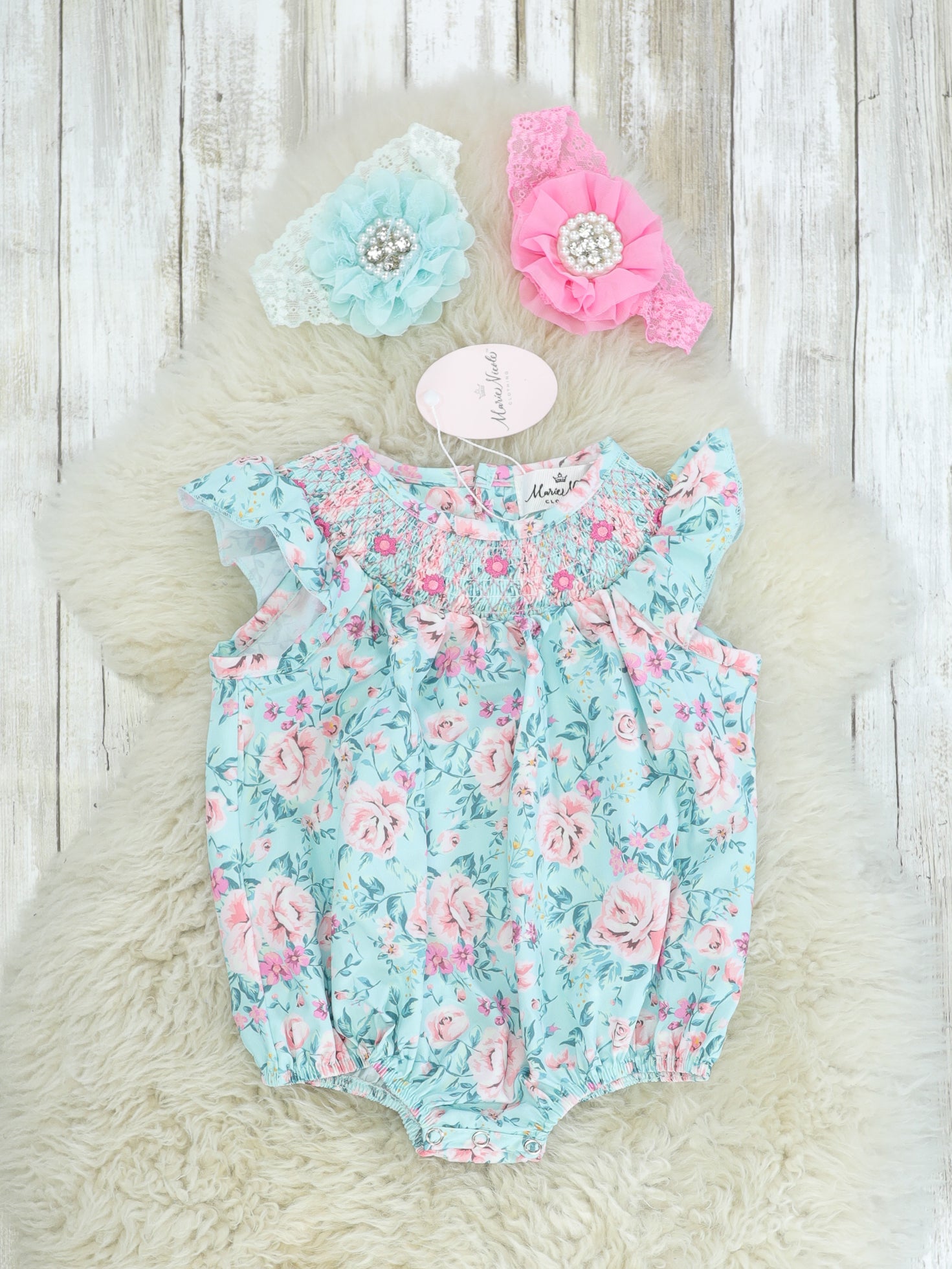 This gorgeous smocked floral bubble is a must have! Featuring a smocked neckline with ruffle sleeves and snap buttons for easy on and off.