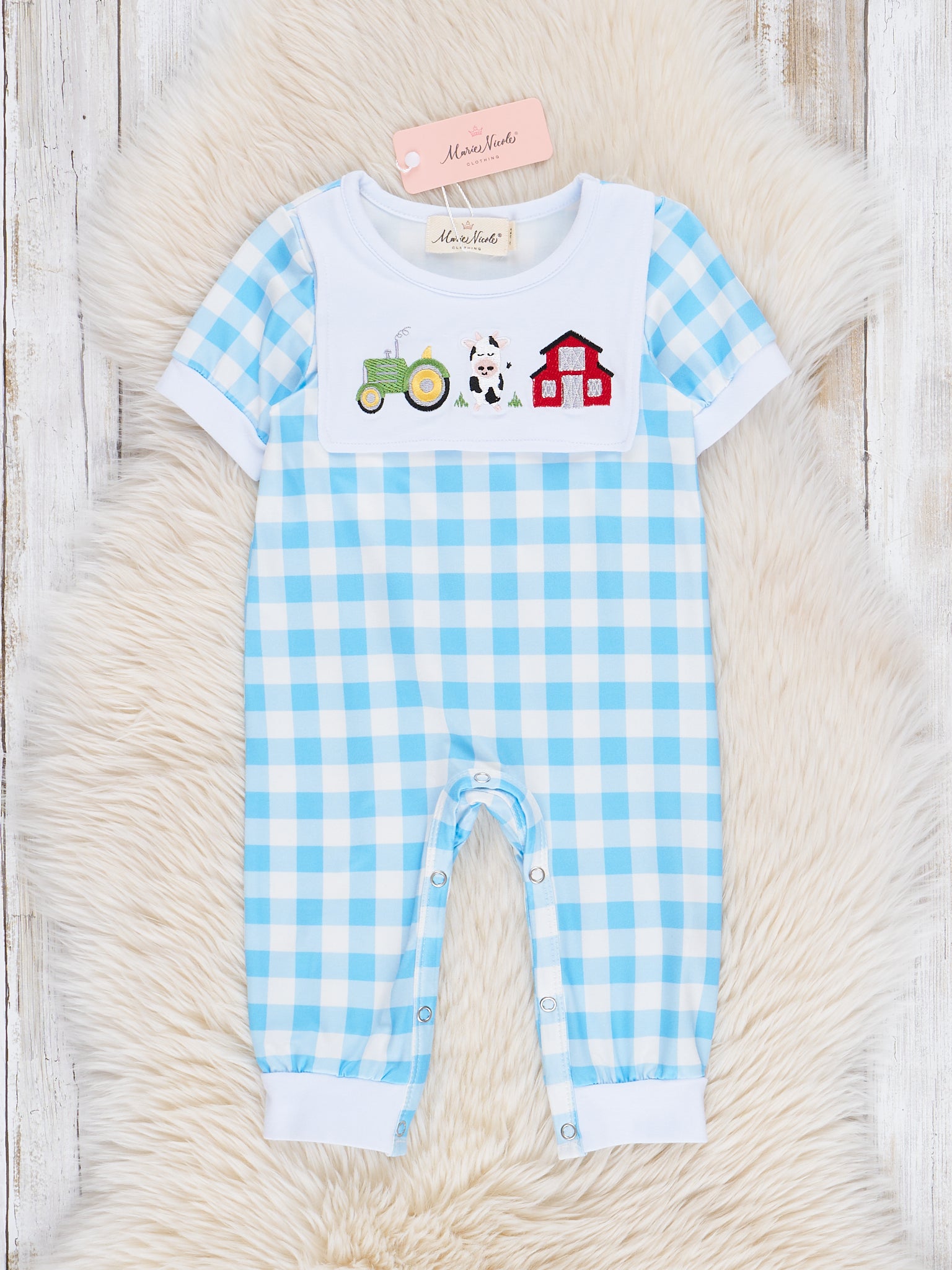 Get ready for a wild adventure in our Blue Gingham Farm Life Romper! Perfect for your little boy, this romper features a classic blue gingham print with crisp white trimming. Ready, set, mooove! Shop the full sibling set by Marie Nicole Clothing!