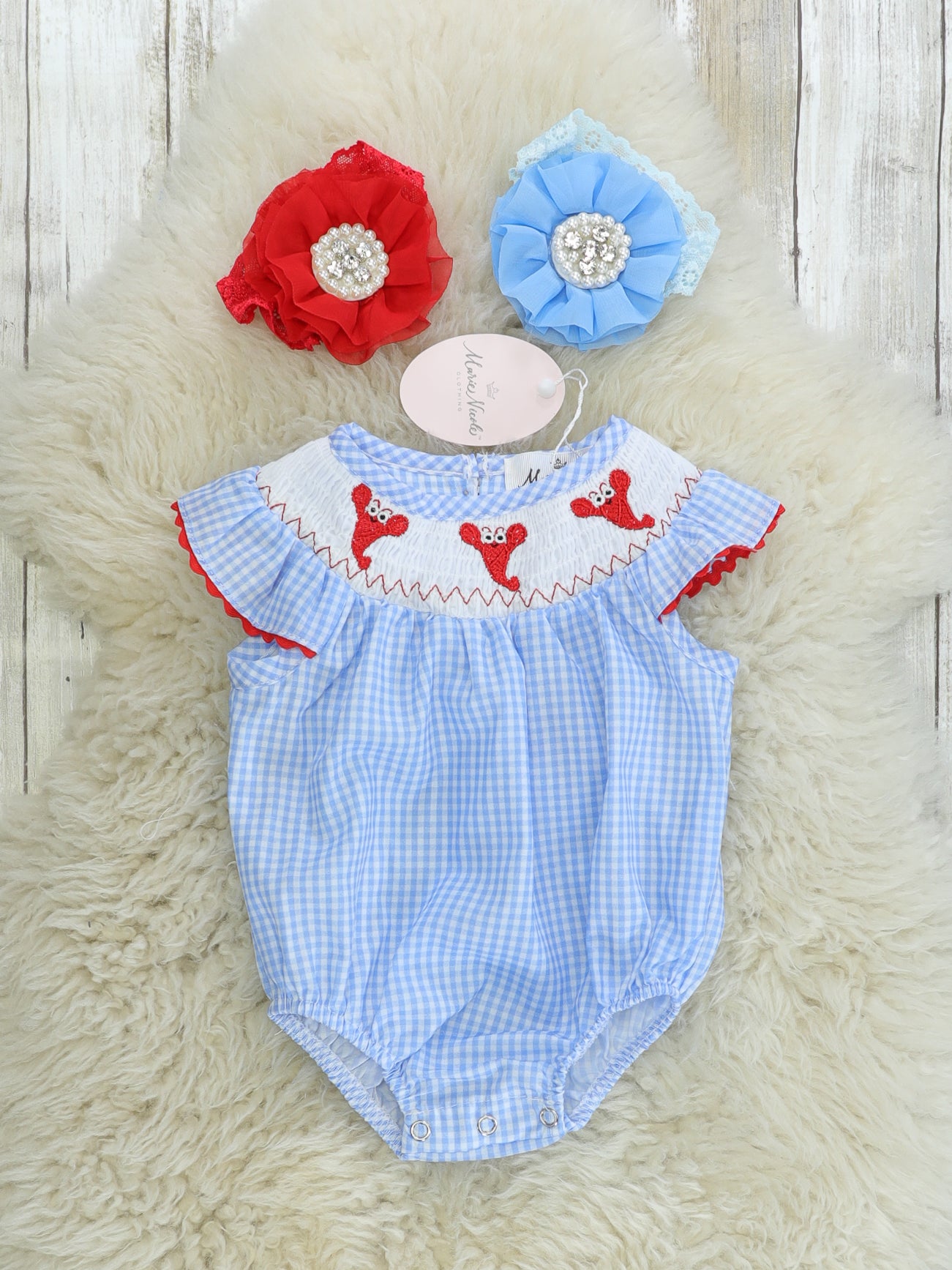Lobsters don't share because they're SHELLFISH! Everyone in your group can wear one of these lobster smocked outfits. This sweet romper is blue gingham with embroidered lobsters on the smocked neckline.