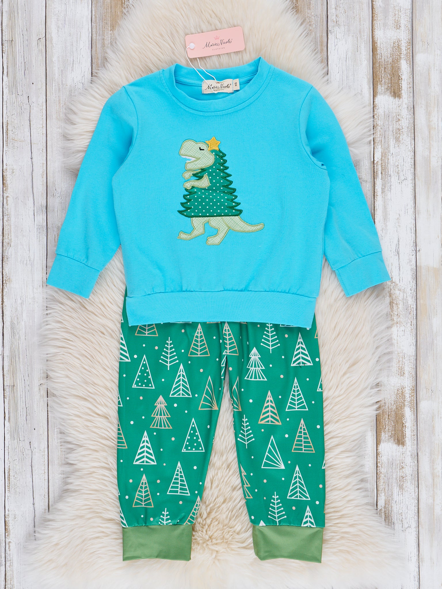 Get your little dinosaur ready for the holidays with our Blue & Green Christmas Tree-Saurus Outfit! This boys set features a playful t-rex in a festive Christmas tree costume, embroidered on a blue top. The coordinating pull on pants in green Christmas tree print add a fun touch to this top. Don't miss out on this unique and quirky brother set!