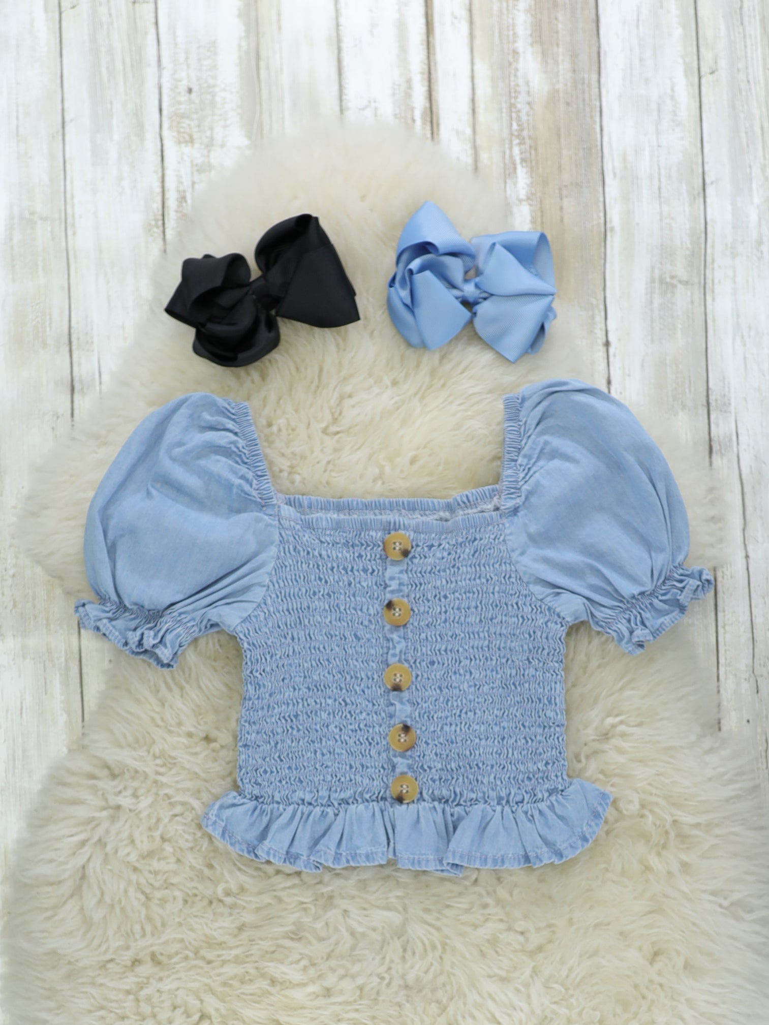 This cute smocked top would pair perfectly with your little's favorite white shorts! We love the bubble sleeves & ruffle trim.