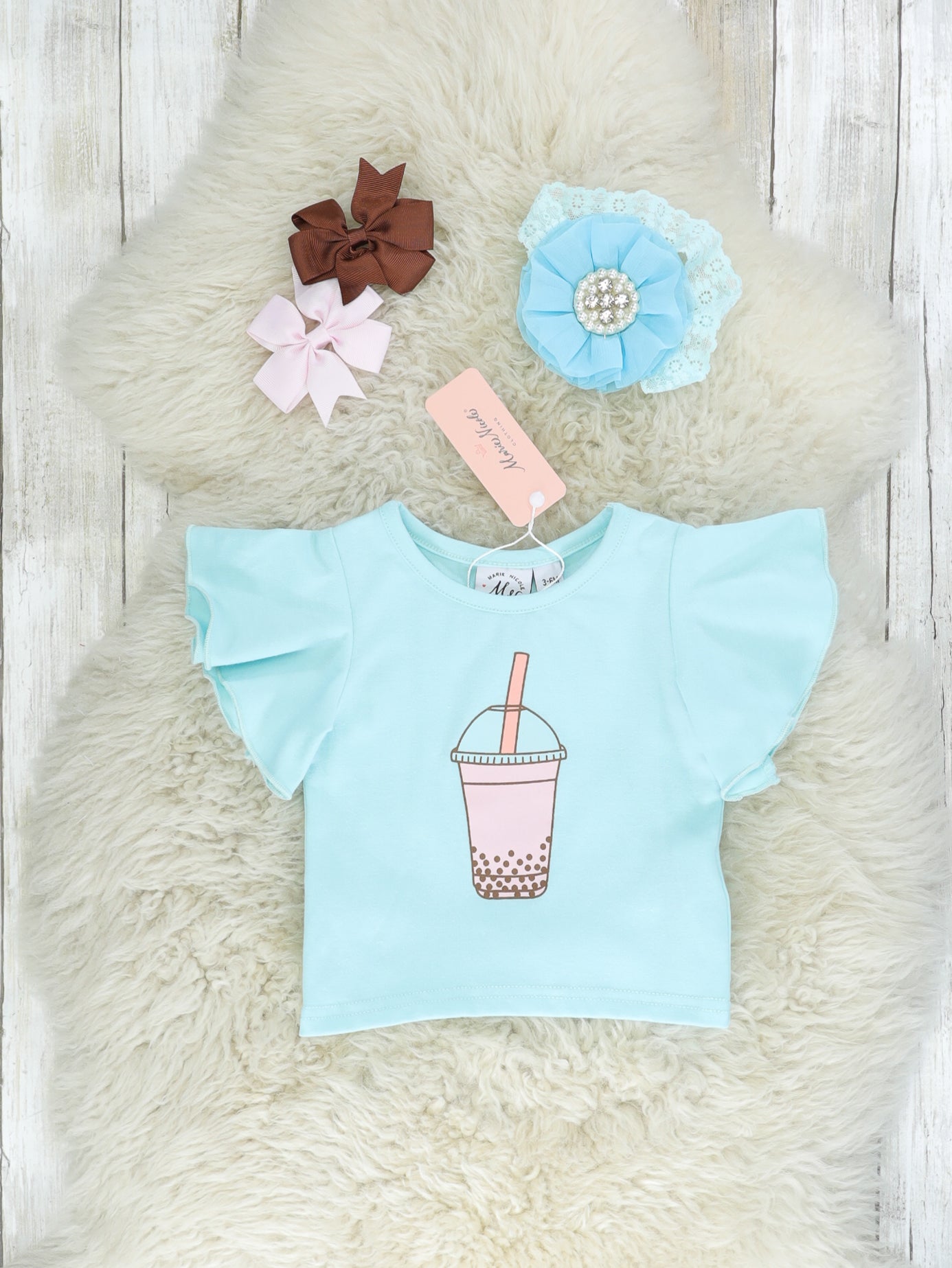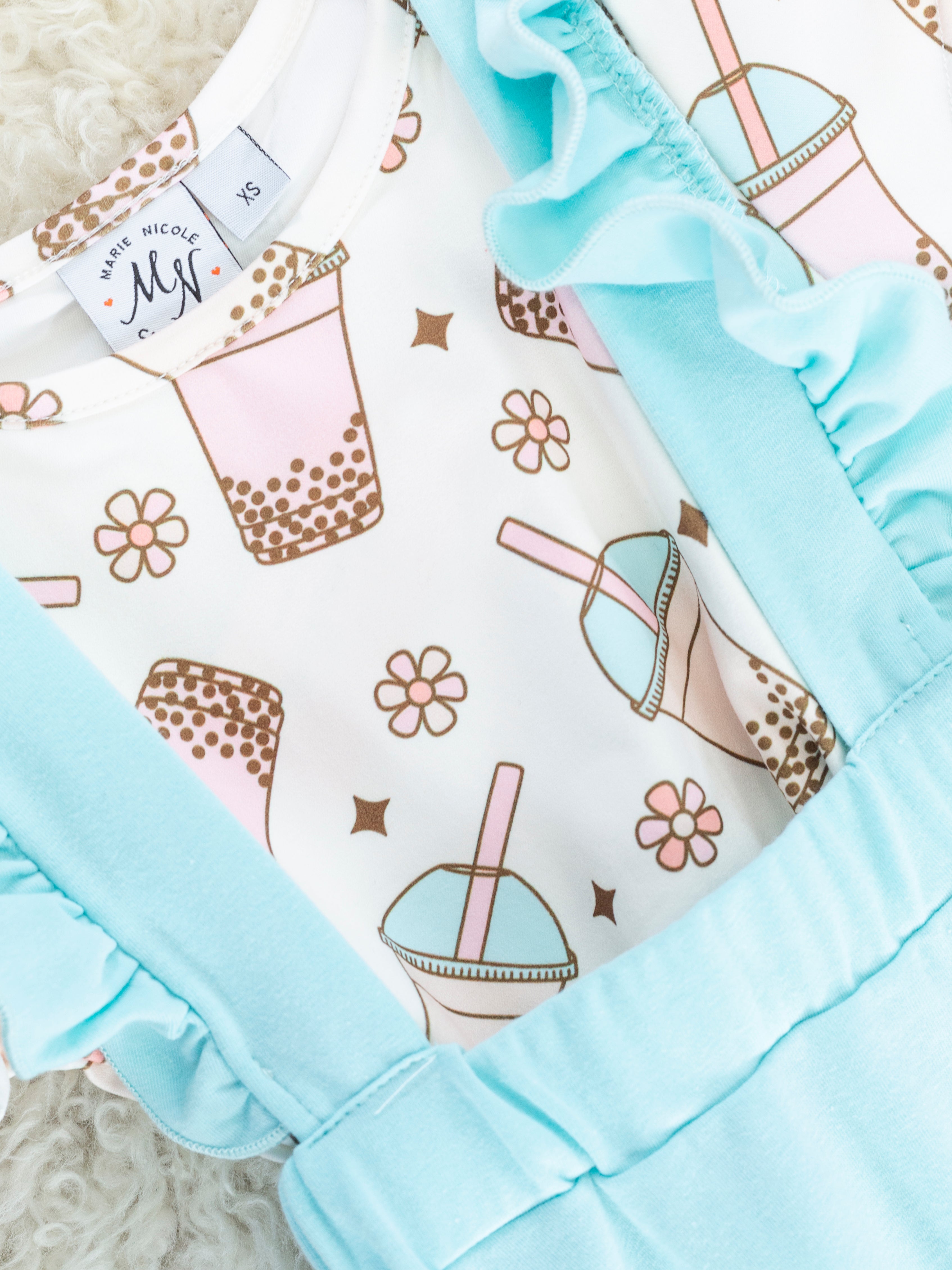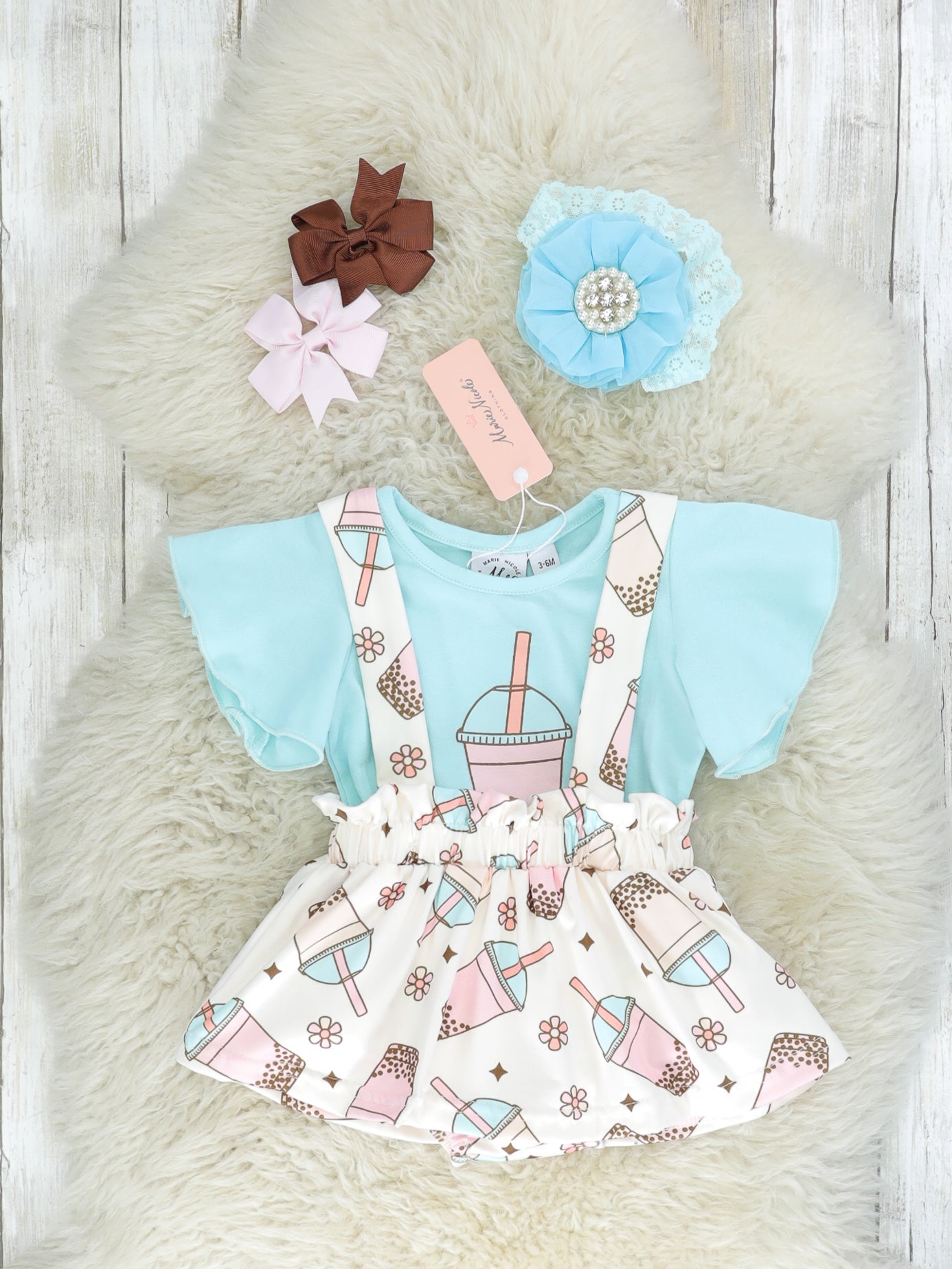 A perfect sister set for your cuTEAs! This set features a top with the cutest boba design. The suspender skirt has ruffle trim, an elastic waistband, & adjustable straps.