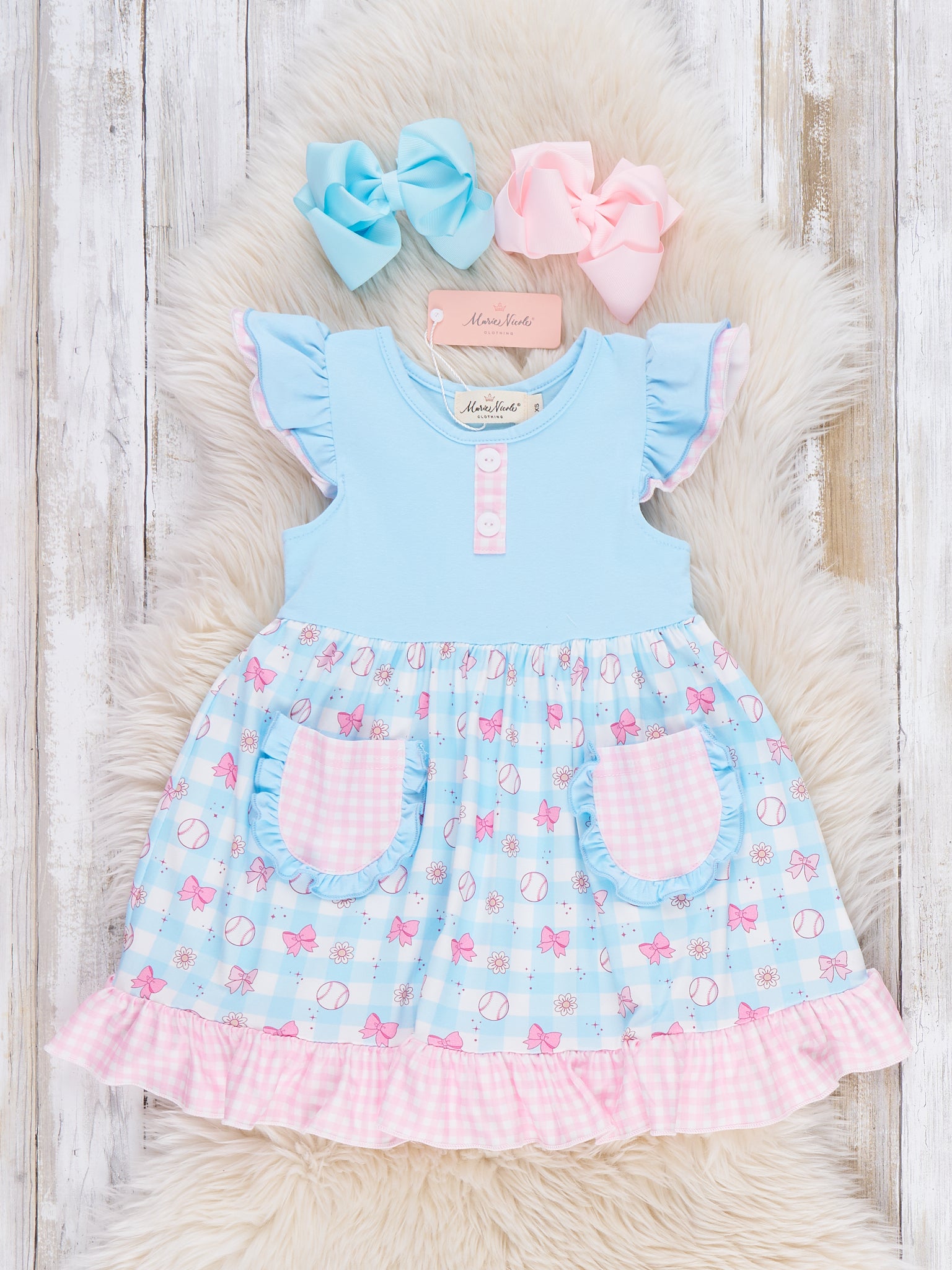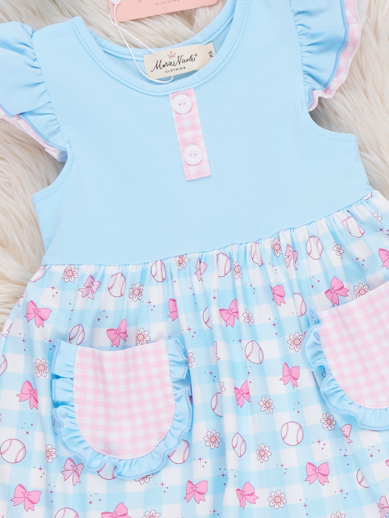 Bowtie Ballpark Ruffle Dress by Marie Nicole Clothing serves up sweet vintage game-day charm with flutter sleeves, a soft knit bodice, and a twirly skirt sprinkled in playful ballpark motifs. From Marie Nicole, front pockets and a frilly hem invite twirls, giggles, and all-day adventures, perfect for cheering, celebrating, and capturing keepsake photos.
