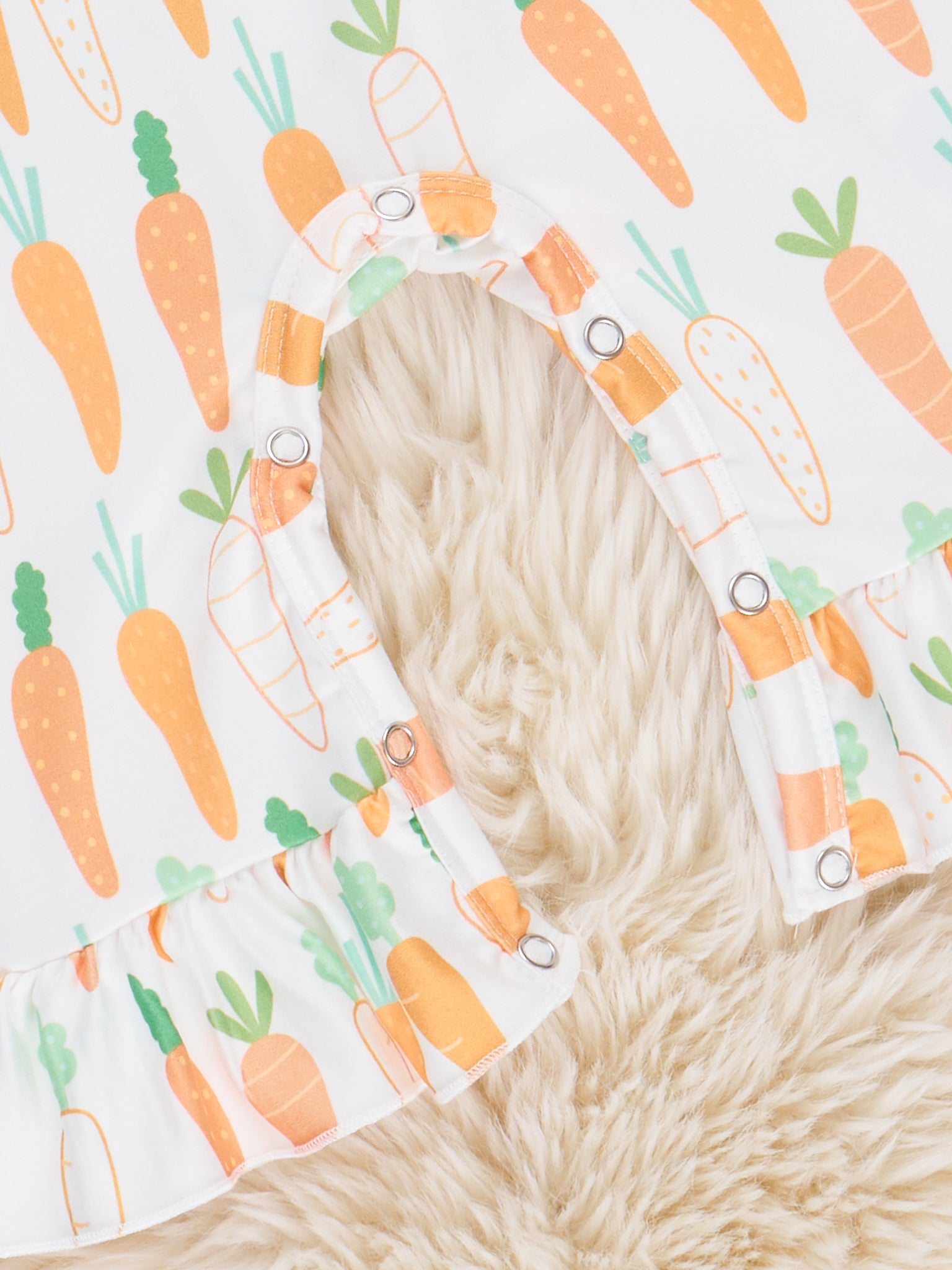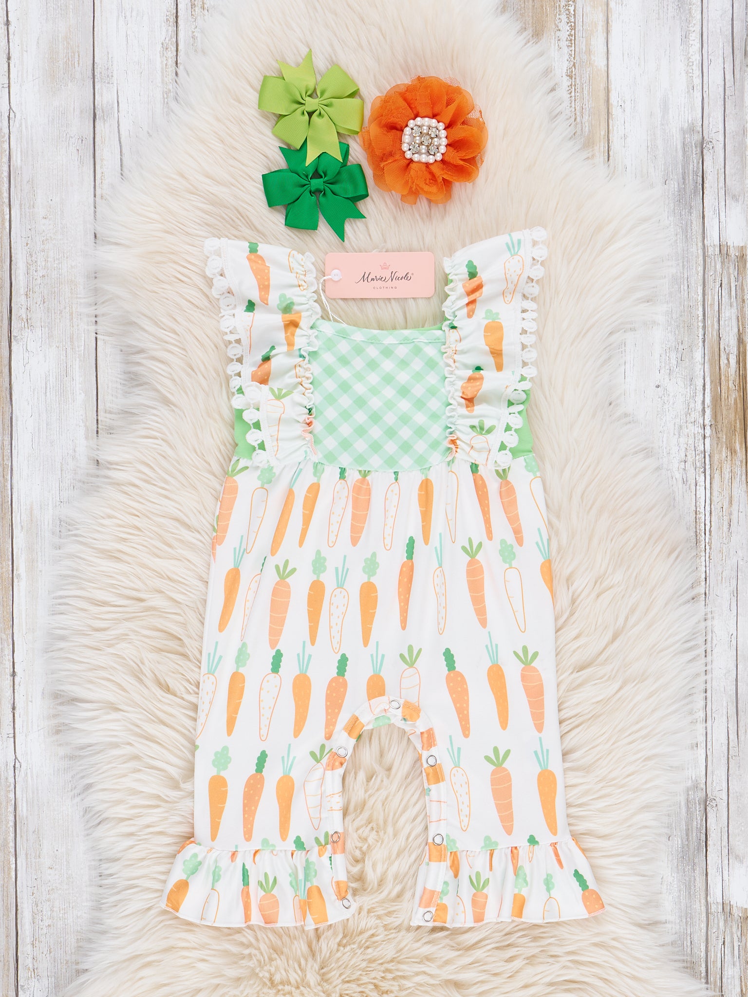 Dress your little ones in this playful and trendy Bright Carrots & Gingham Ruffle Romper by Marie Nicole Clothing. Perfect for Easter, the romper features a mix of green gingham and carrot print, with a ruffle details. Get the sister set for an extra dose of cuteness!