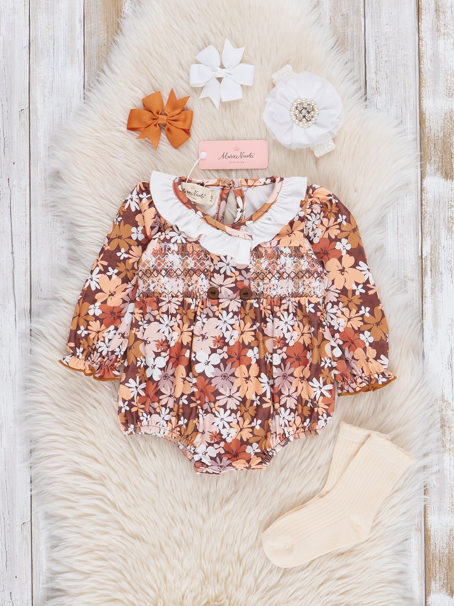 Introducing the Brown Autumn Florals Ruffle Bubble - for the playful and stylish little girl! This girls bubble features a smocked bodice and a unique autumn florals print, paired with a charming white ruffle collar. Complete the look with the matching sister set. By Marie Nicole Clothing.