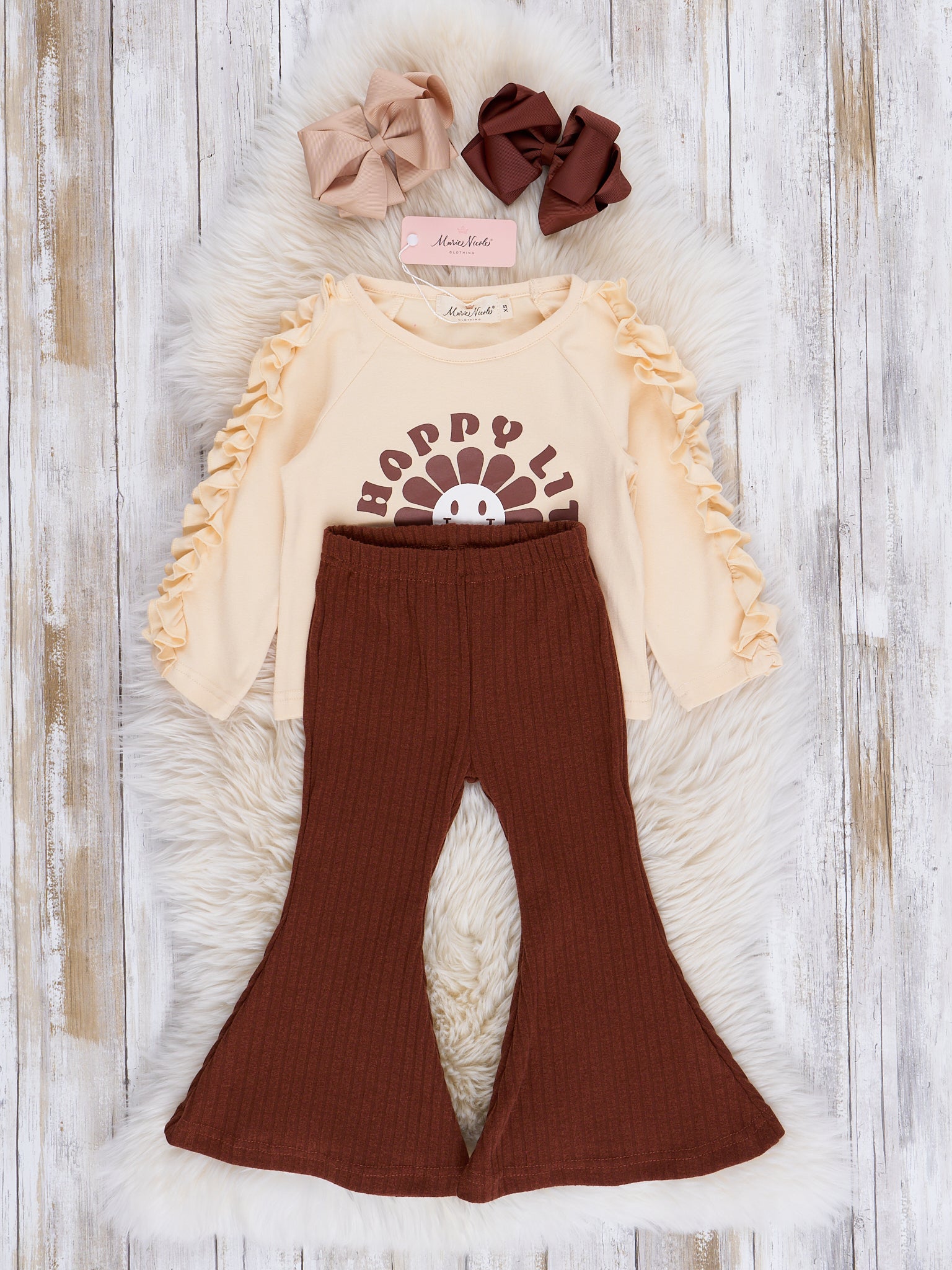 Be free-spirited and fashion-forward with our Brown Happy Soul Ribbed Bell Bottoms Outfit. This girls' ensemble includes a cream ruffle sleeve top and cozy brown ribbed bell bottoms, perfect for the fall season. Embrace your happy soul in style!