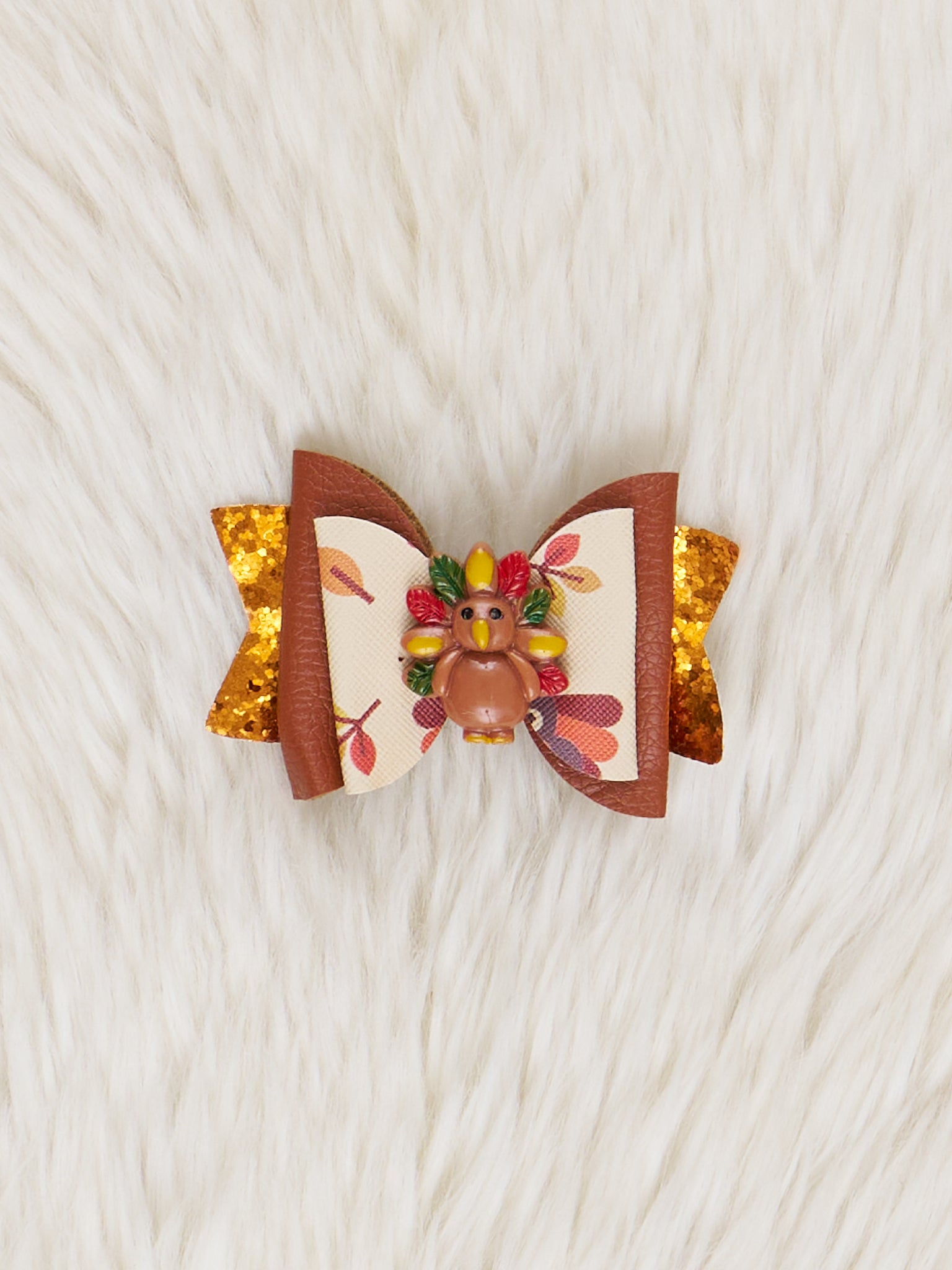 This luxurious bow is the perfect way to strut your style and strut your stuff in style! Crafted with brown and tan leather and a turkey charm, this Brown Leather & Gold Sparkle Turkey Bow is sure to get your feathers flying.