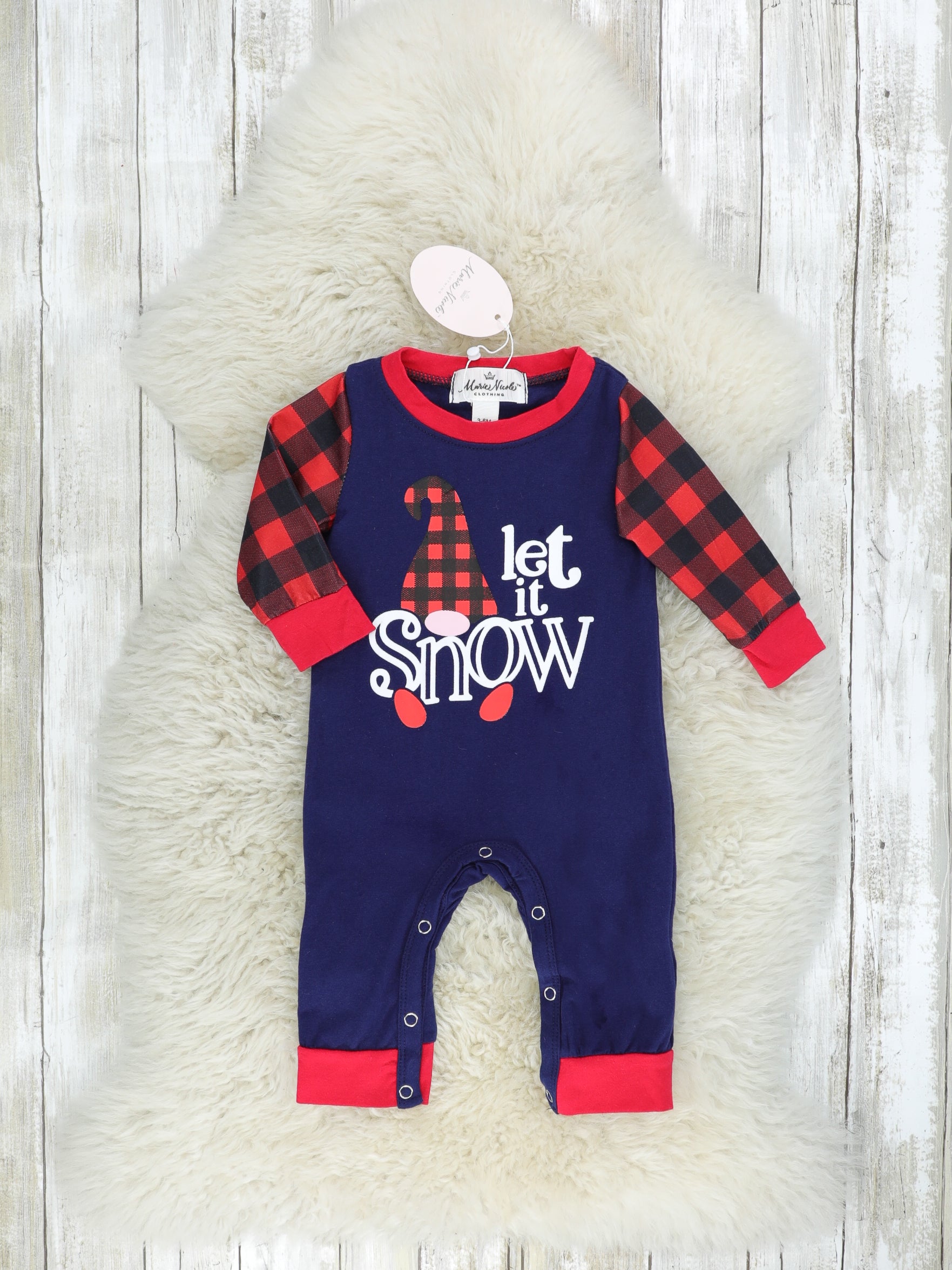 The sweetest romper to watch your little one have snow much fun! This navy romper features buffalo plaid raglan sleeves, red trim, & a darling gnome detail.