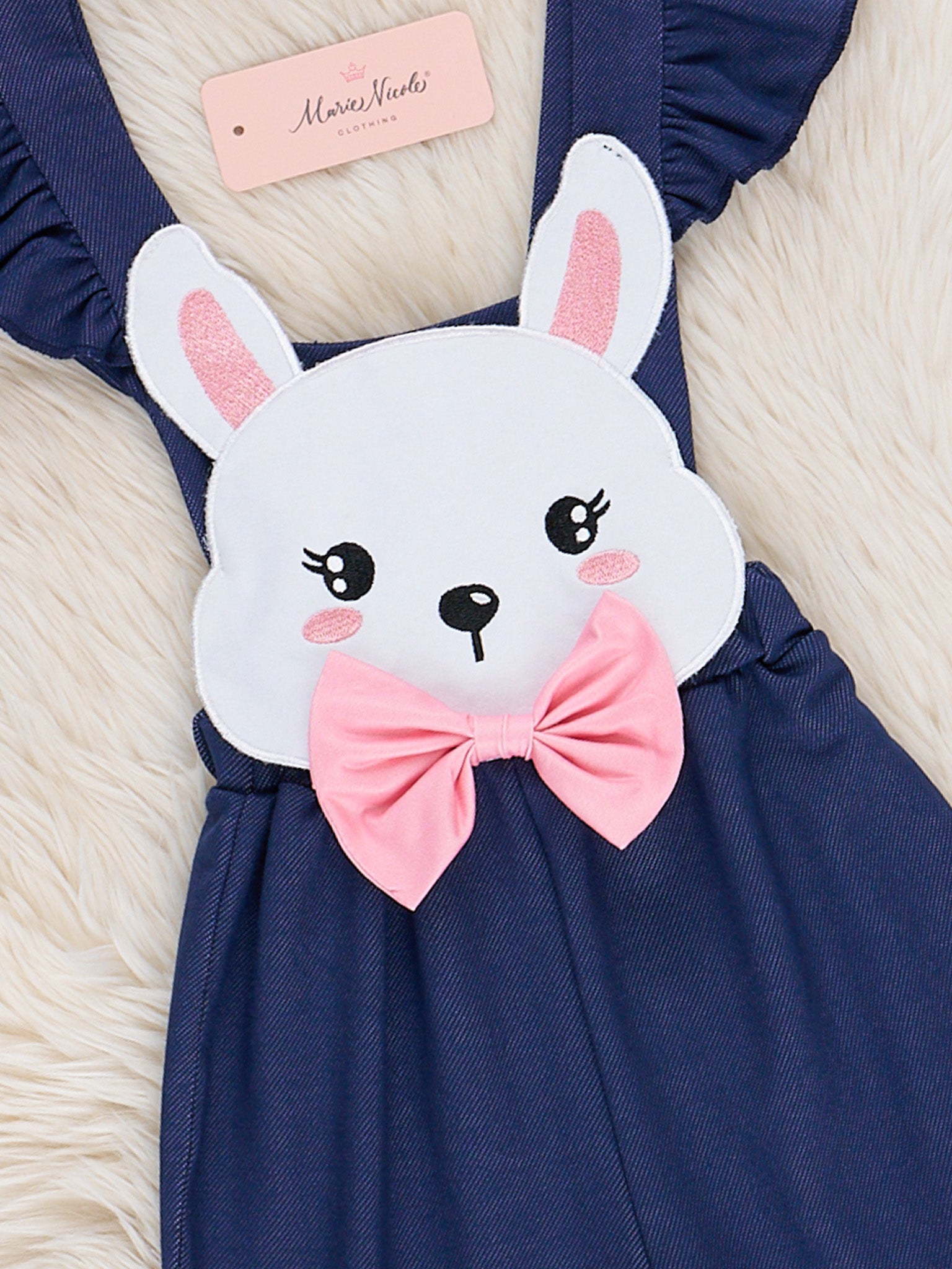 Dress your little one in hoppy style with our Bunny Bow Ruffle Jumpsuit! This girls jumpsuit boasts a blue chambray bodice with ruffle hem legs and an embroidered bunny with a bow. With adjustable ruffle straps, it's perfect for Easter and beyond. Available from Marie Nicole Clothing.