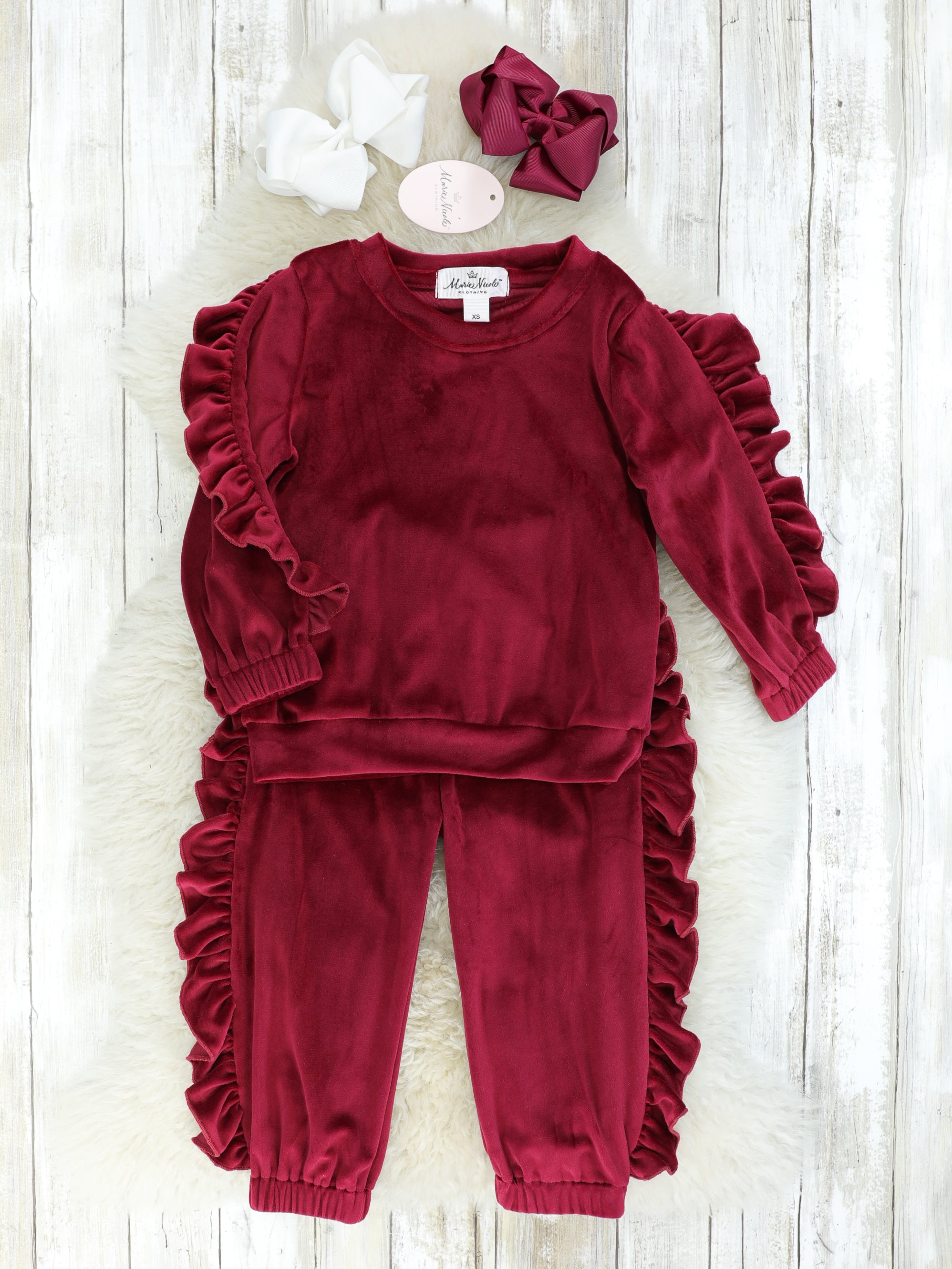Burgundy Velvet Ruffle Pullover & Jogger Outfit