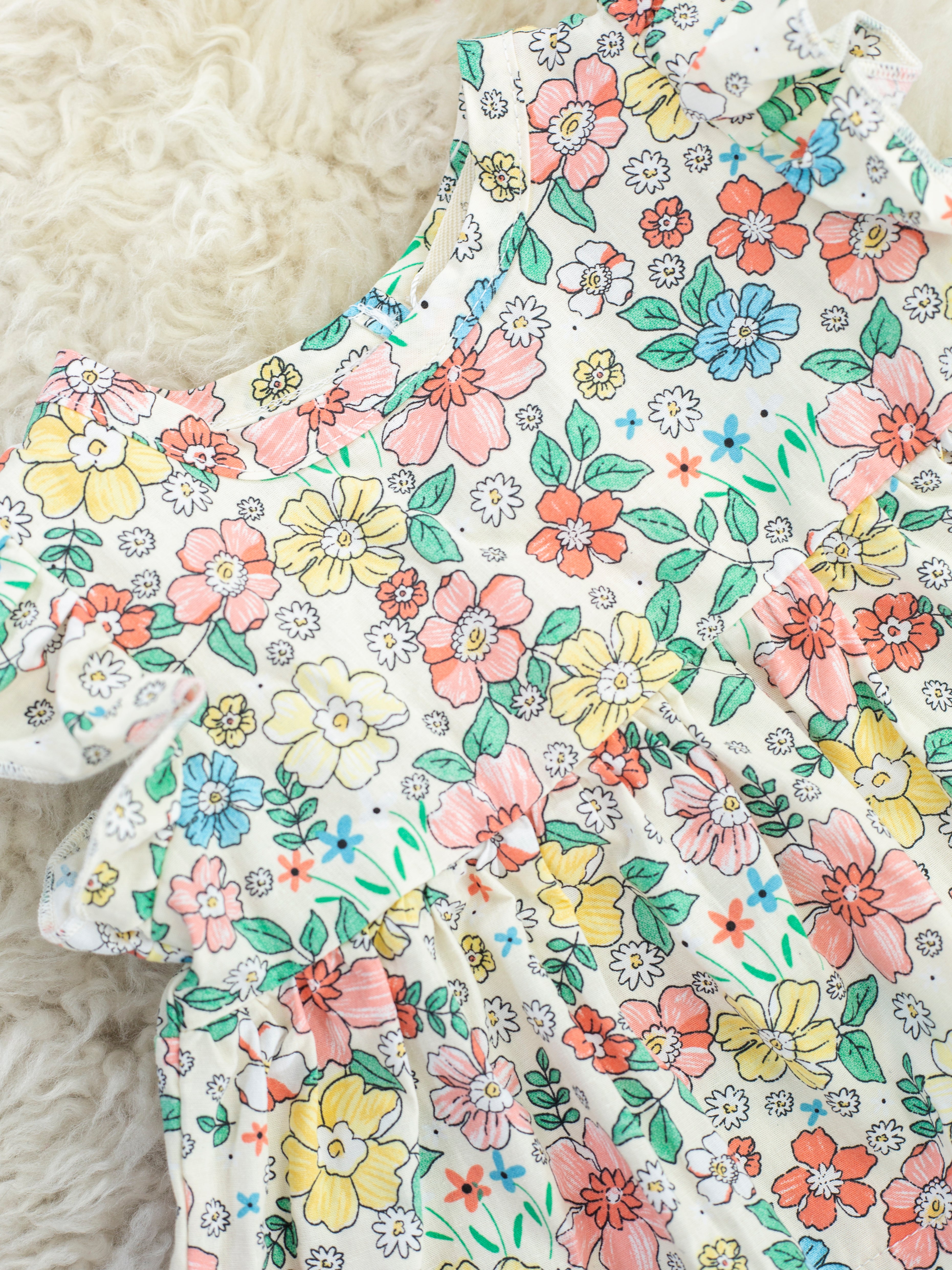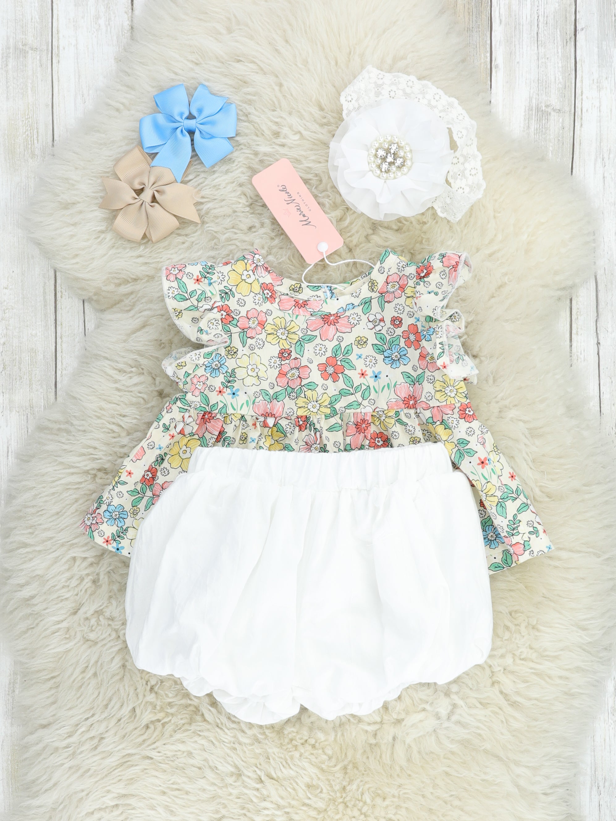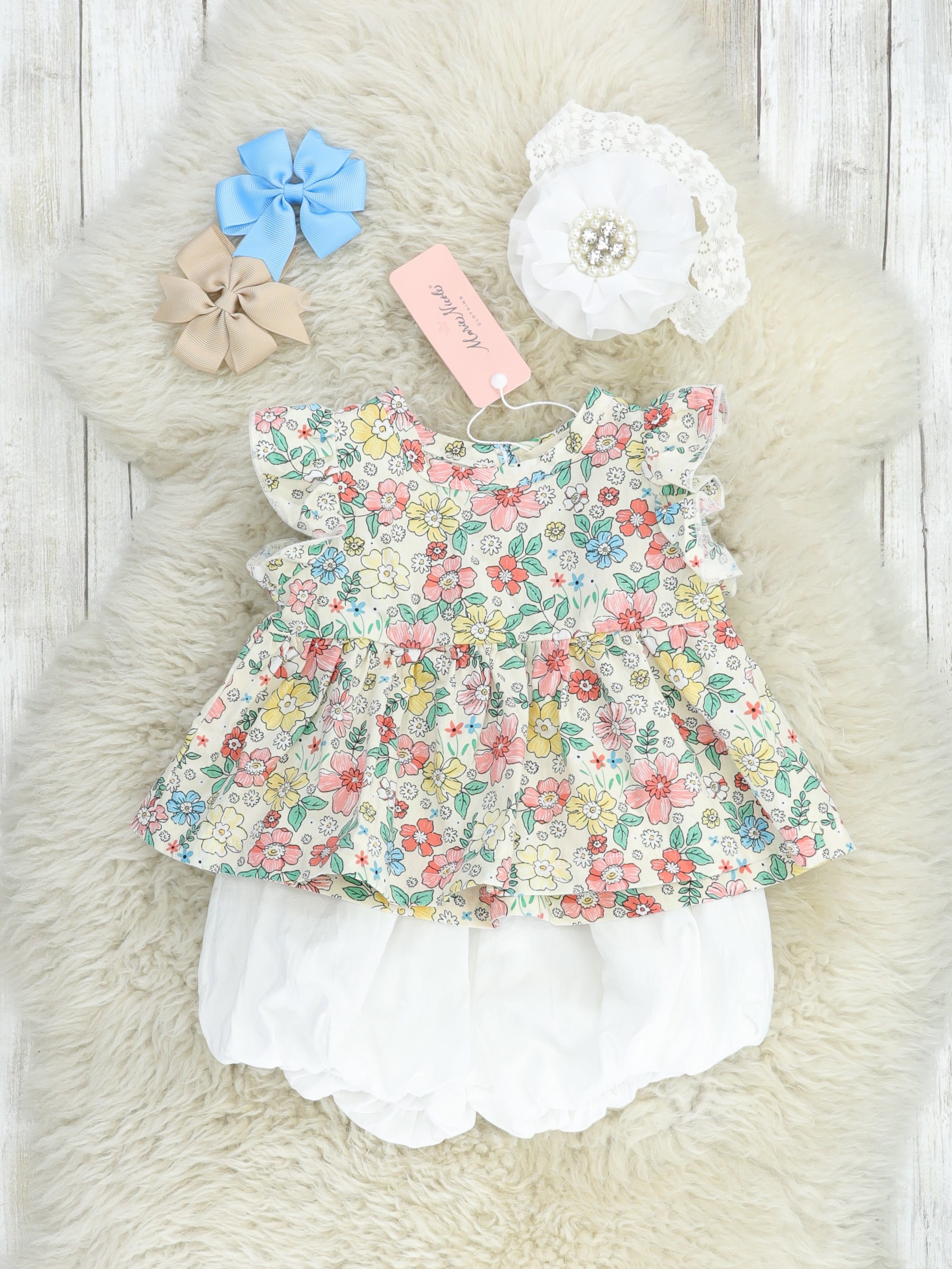 This outfit is perfect for your trendy babes! This outfit features a tunic with a vintage buttercup design, flutter trim, buttons at the nape of the neck, & white bloomers with an elastic waistband.
