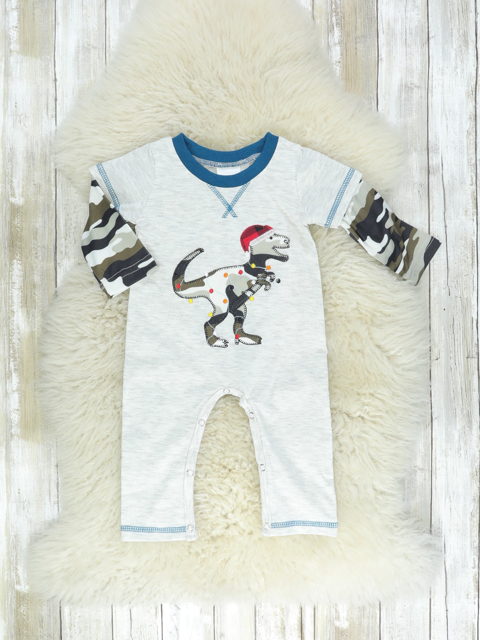 Roar out loud in this too cute brother camo dinosaur brother set! We love this big t-rex wrapped up with Christmas lights wearing a little Santa hat! Shop the brother set here!