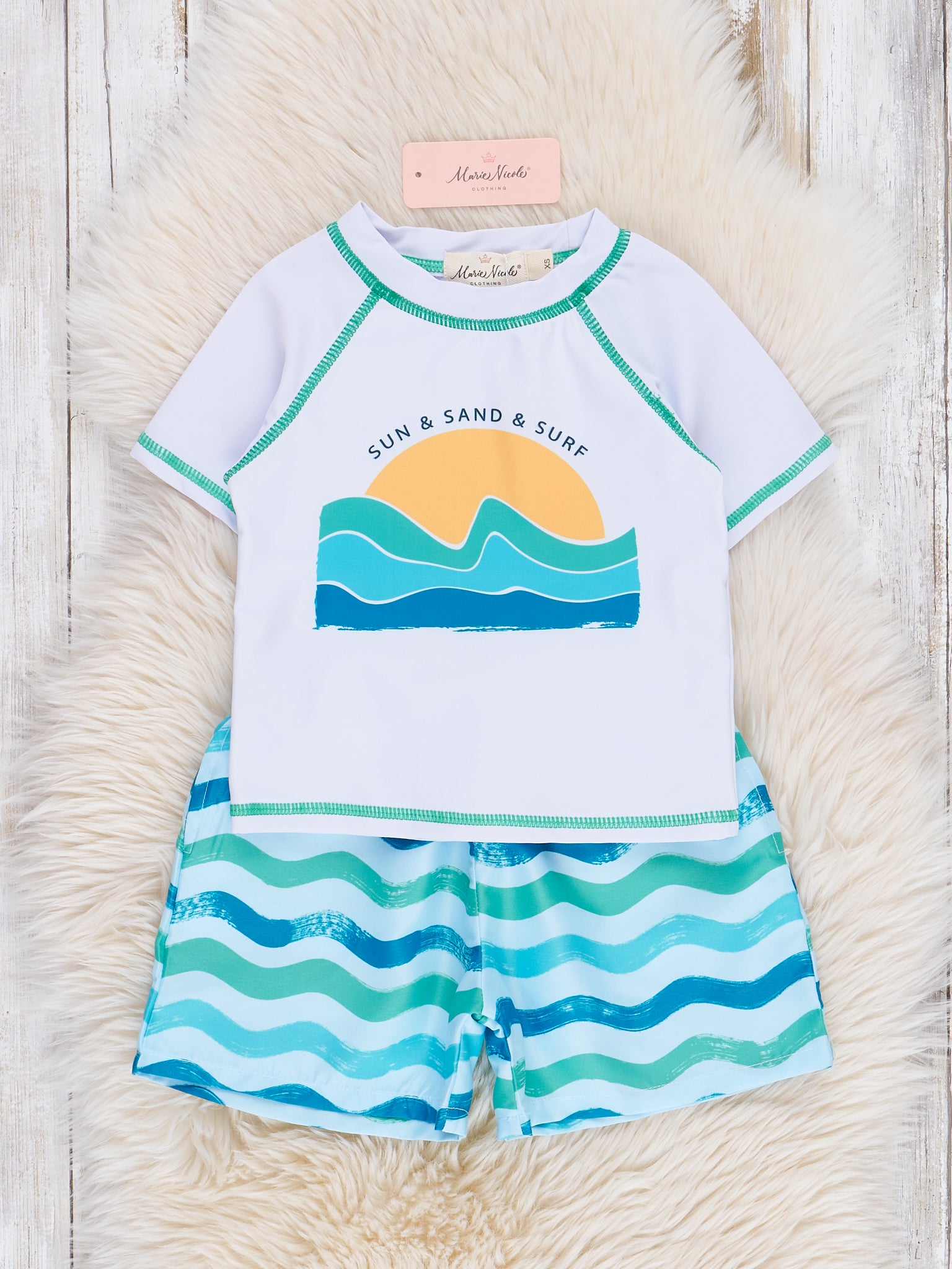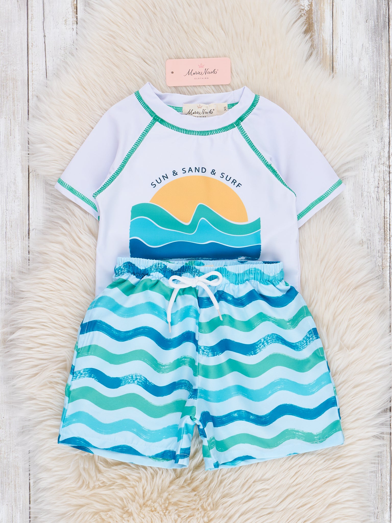 Ride the wave of style with our Catching Waves Rashguard Swim Set! This boys' set includes a beachy white rash guard top featuring a playful beach scene design, and coordinating blue wave print swim shorts. From Marie Nicole Clothing, get ready for a summer full of fun at the beach! 🌊