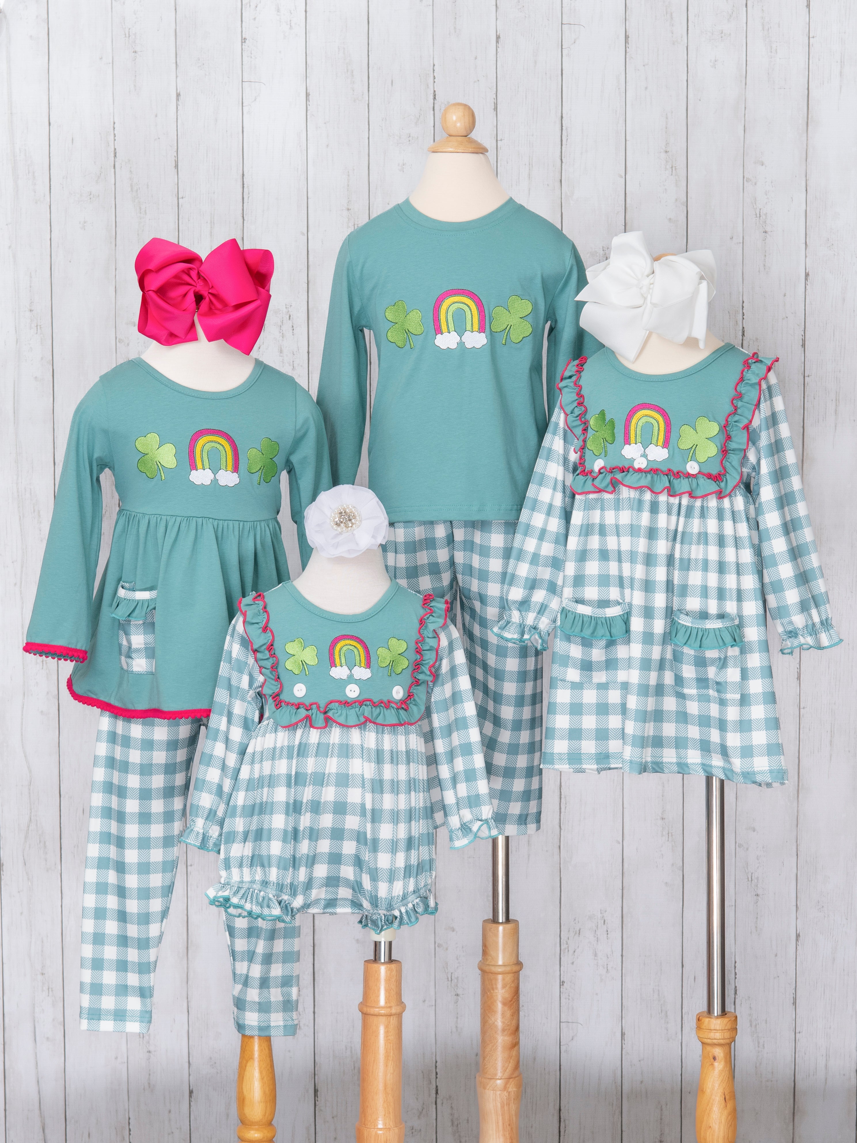 This Rainbow Clover Field Gingham Romper is the gold at the end of the rainbow! This turquoise blue romper by Marie Nicole Clothing features gingham fabric & embroidered clovers and a rainbow, perfect for spring and St. Patrick's Day.