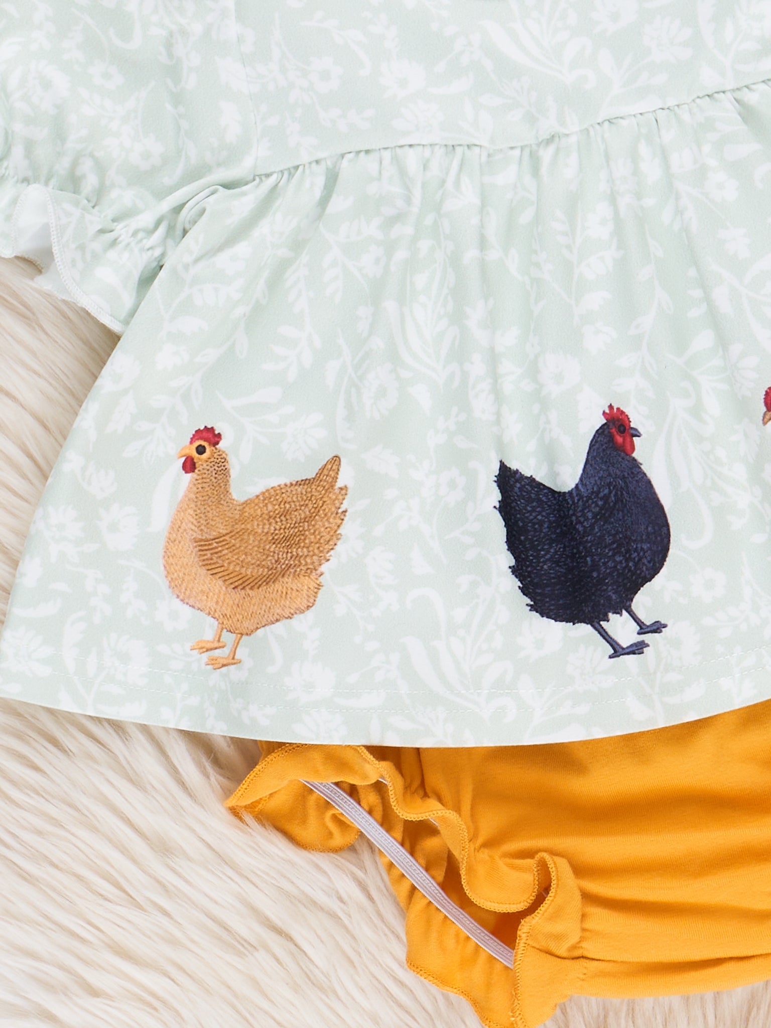 Dress your little gal in this Golden Chicken Party Bloomers Outfit! She'll be the talk of the coop with the playful mint ruffle top featuring a print of three adorable chickens. And the matching bloomers complete the look that's part of an adorable sibling set by Marie Nicole Clothing.
