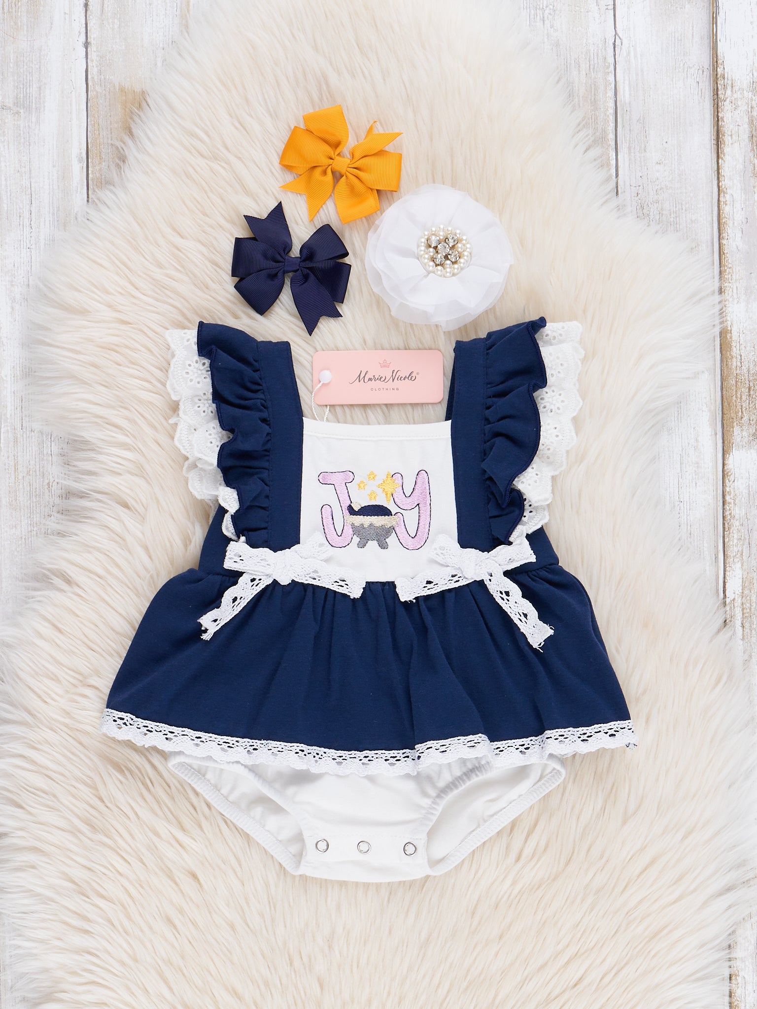 Spread "joy" throughout the holiday season with our adorable sister set. This bubble features a charming blue bodice with delicate lace ruffle trim and an embroidered "Joy" Nativity design.