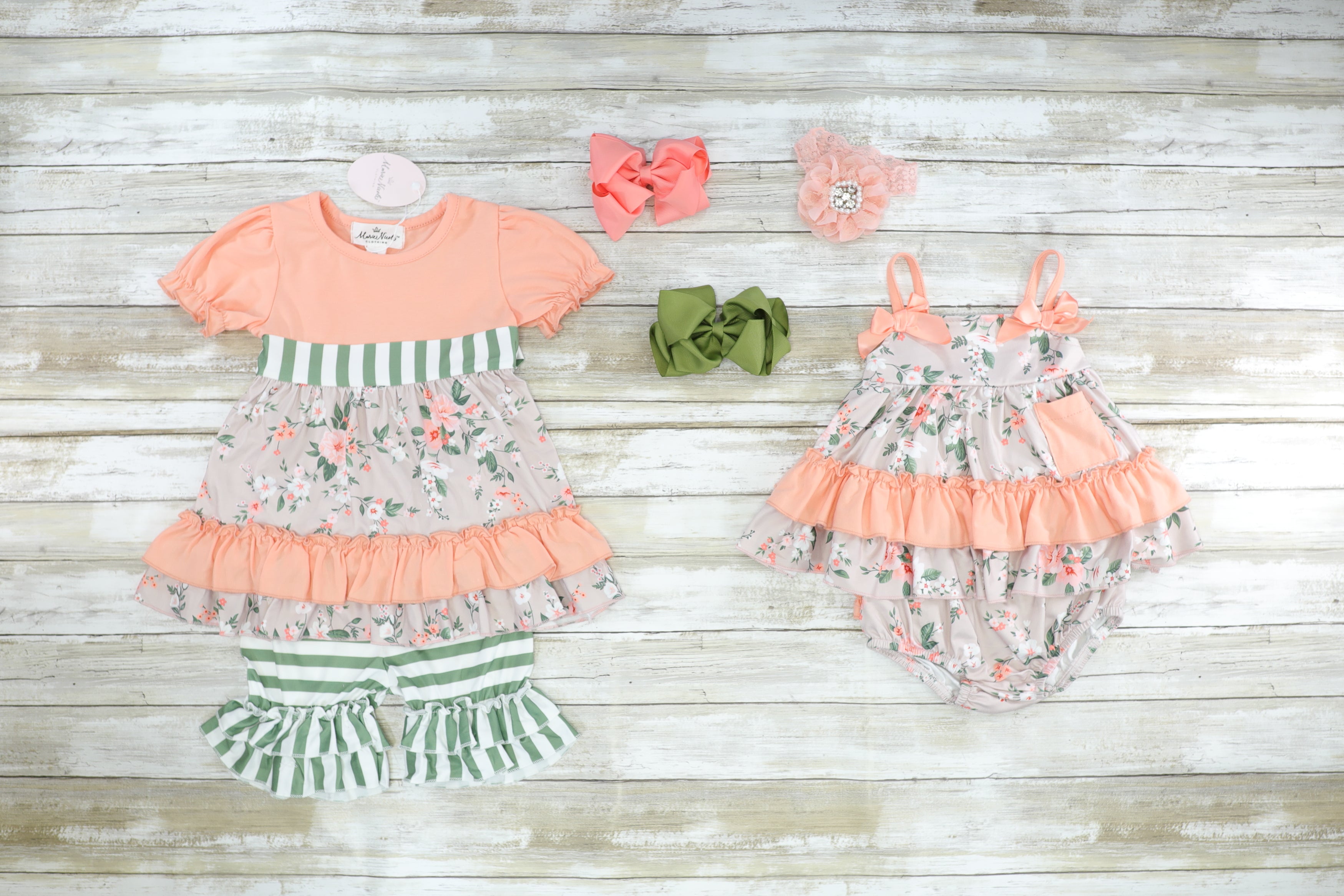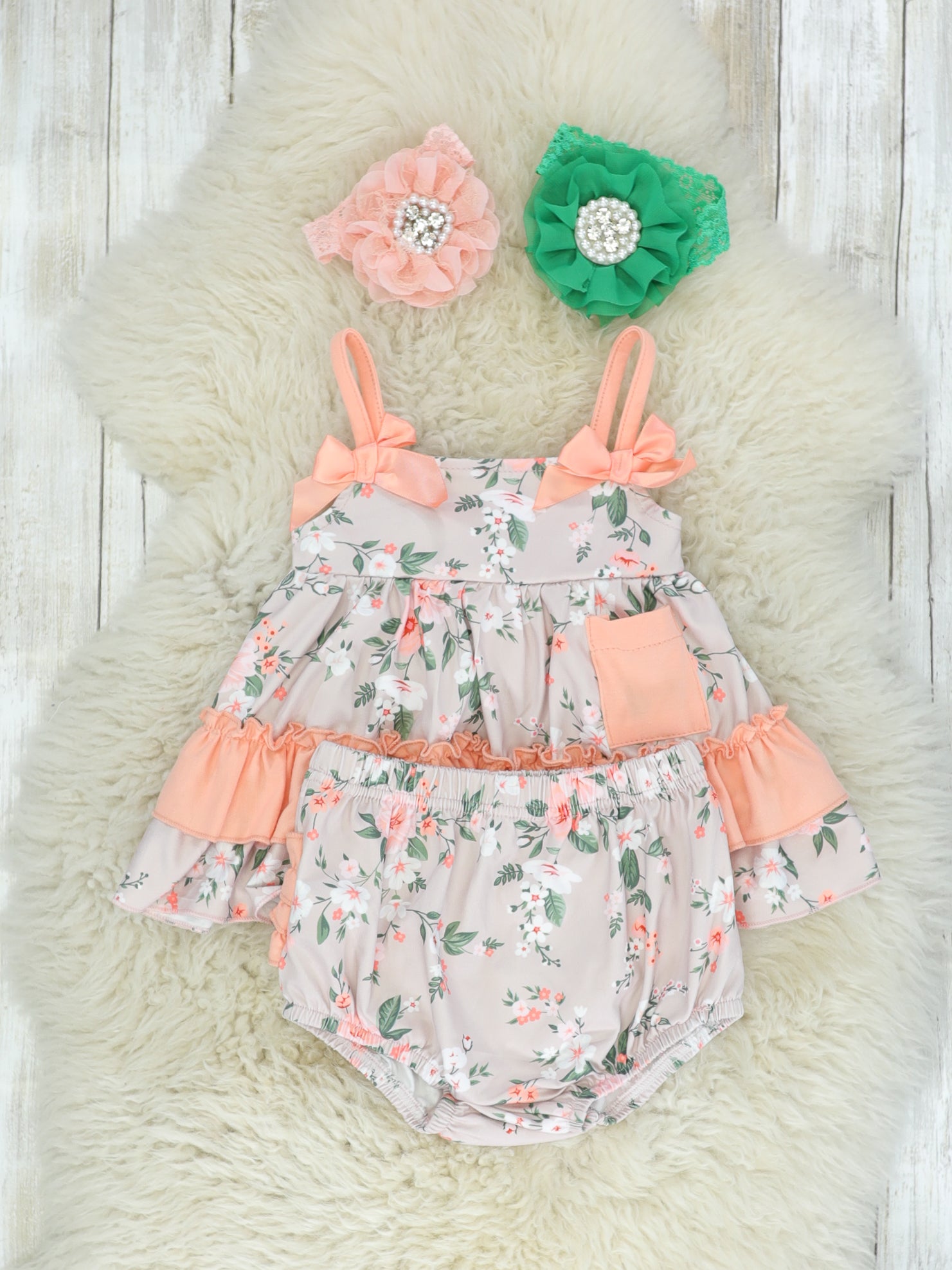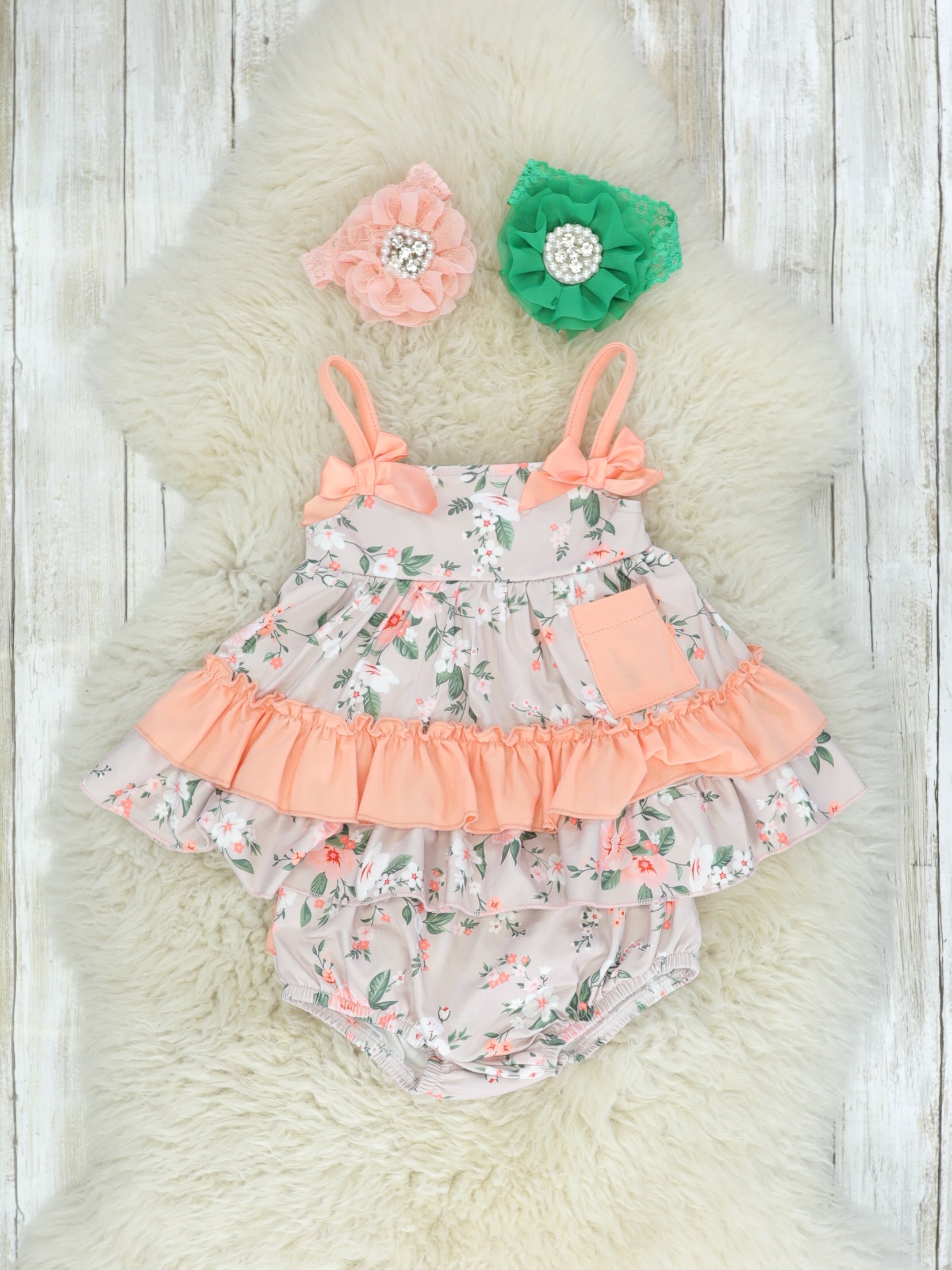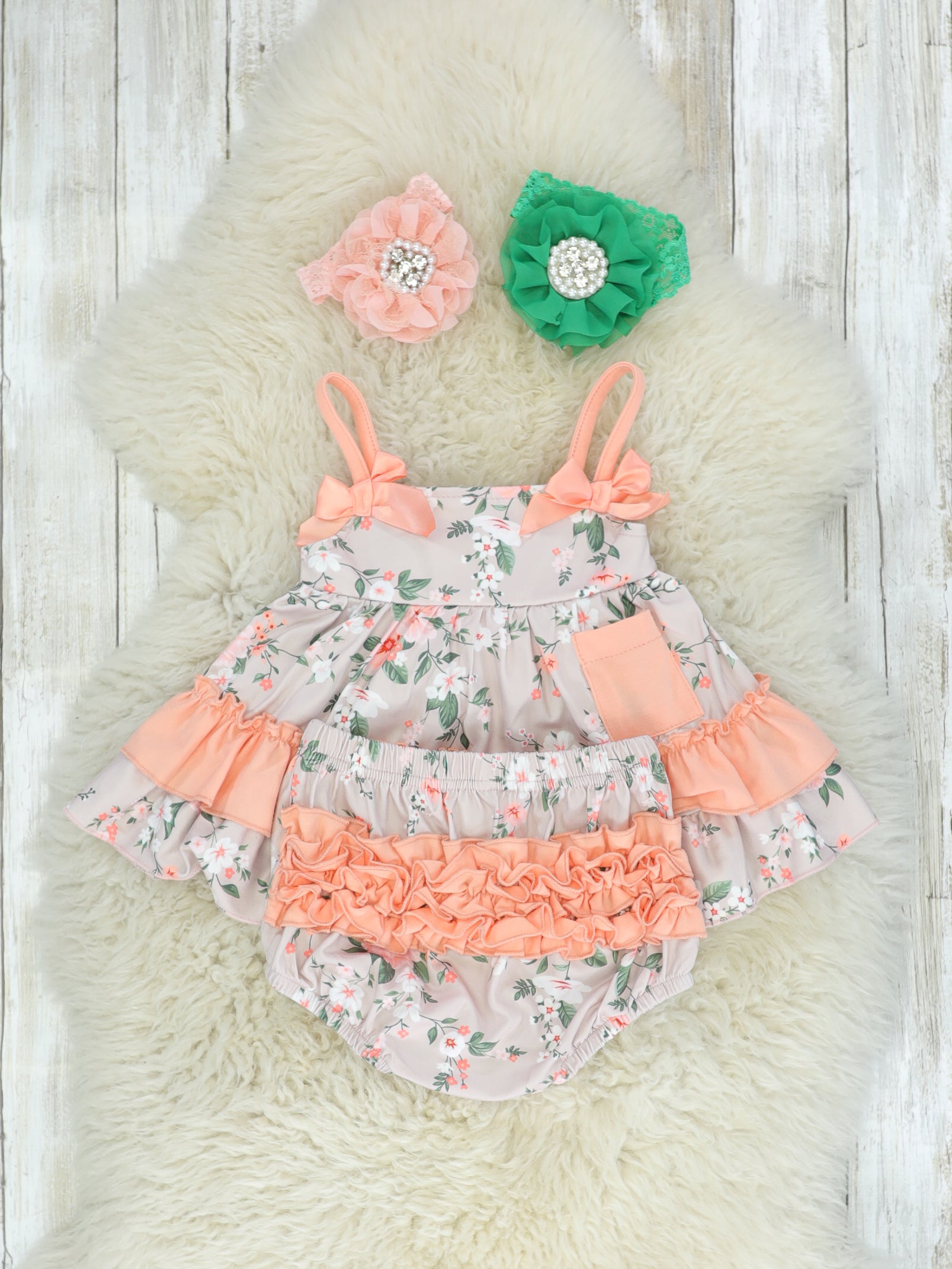 Always make time to stop and smell the flowers! This sister set is so stinkin' cute, it features a ruffle hem, front pocket, bows on the straps, and matching ruffle bloomers.