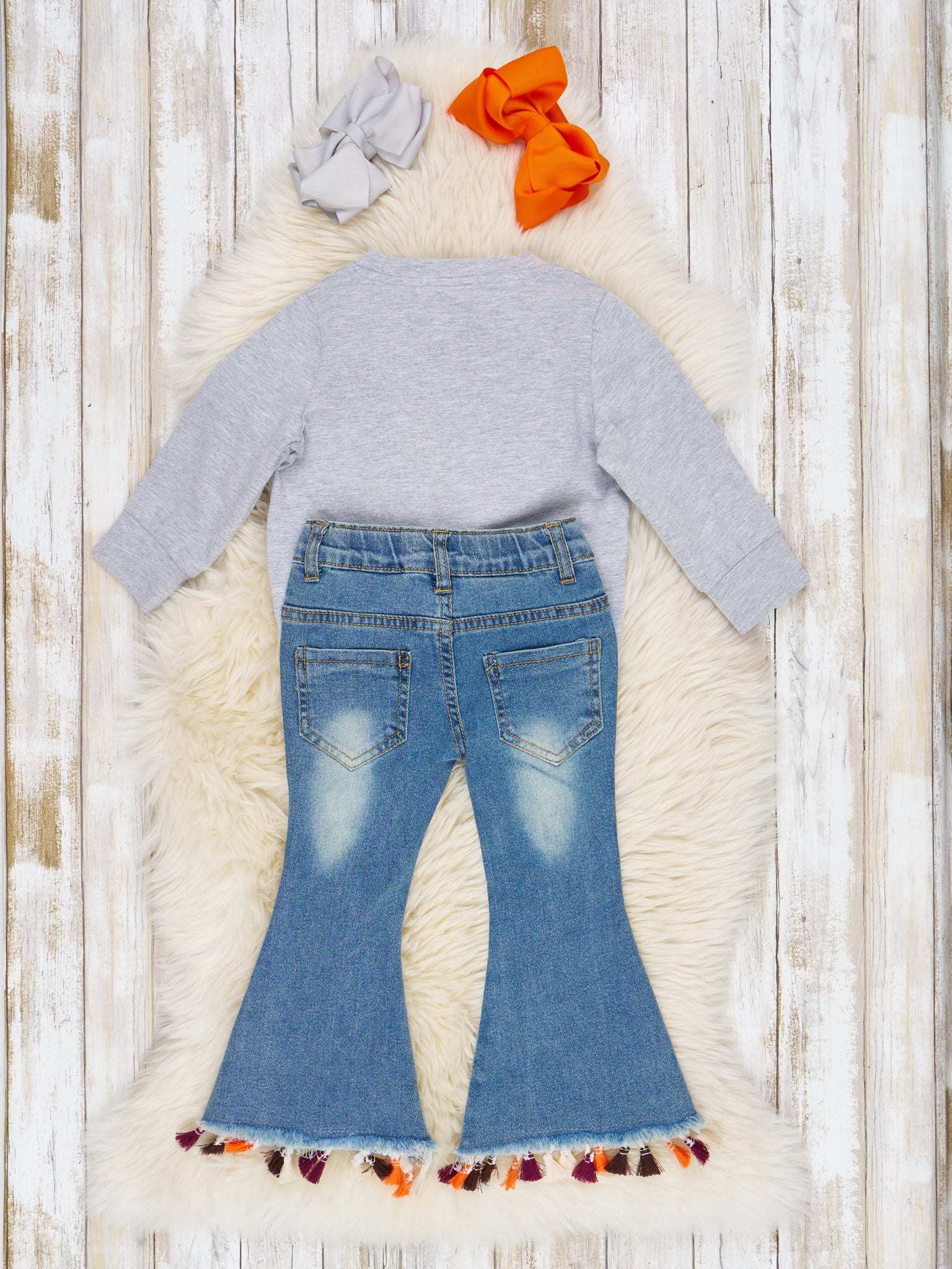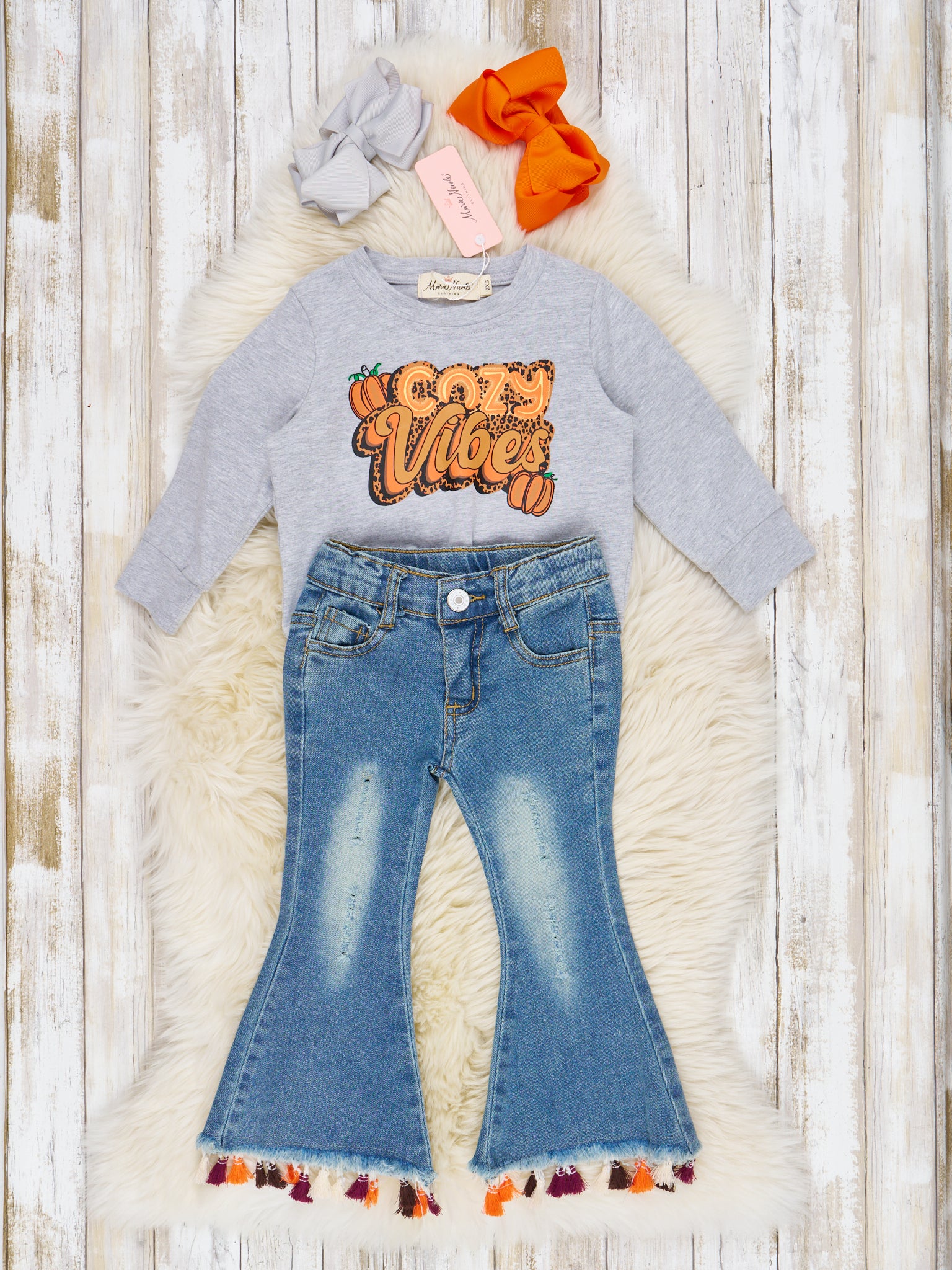 Cozy up to fall with the Cozy Vibes outfit! Featuring a long sleeve heather grey top with a festive fall sublimation design and bell-bottom denim pants with tassels at the hem, this outfit is for the autumn enthusiast!