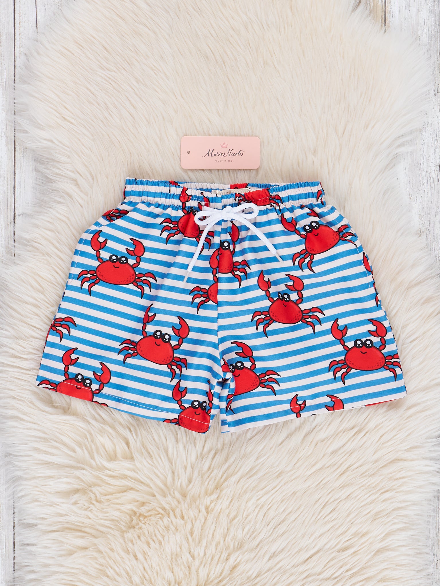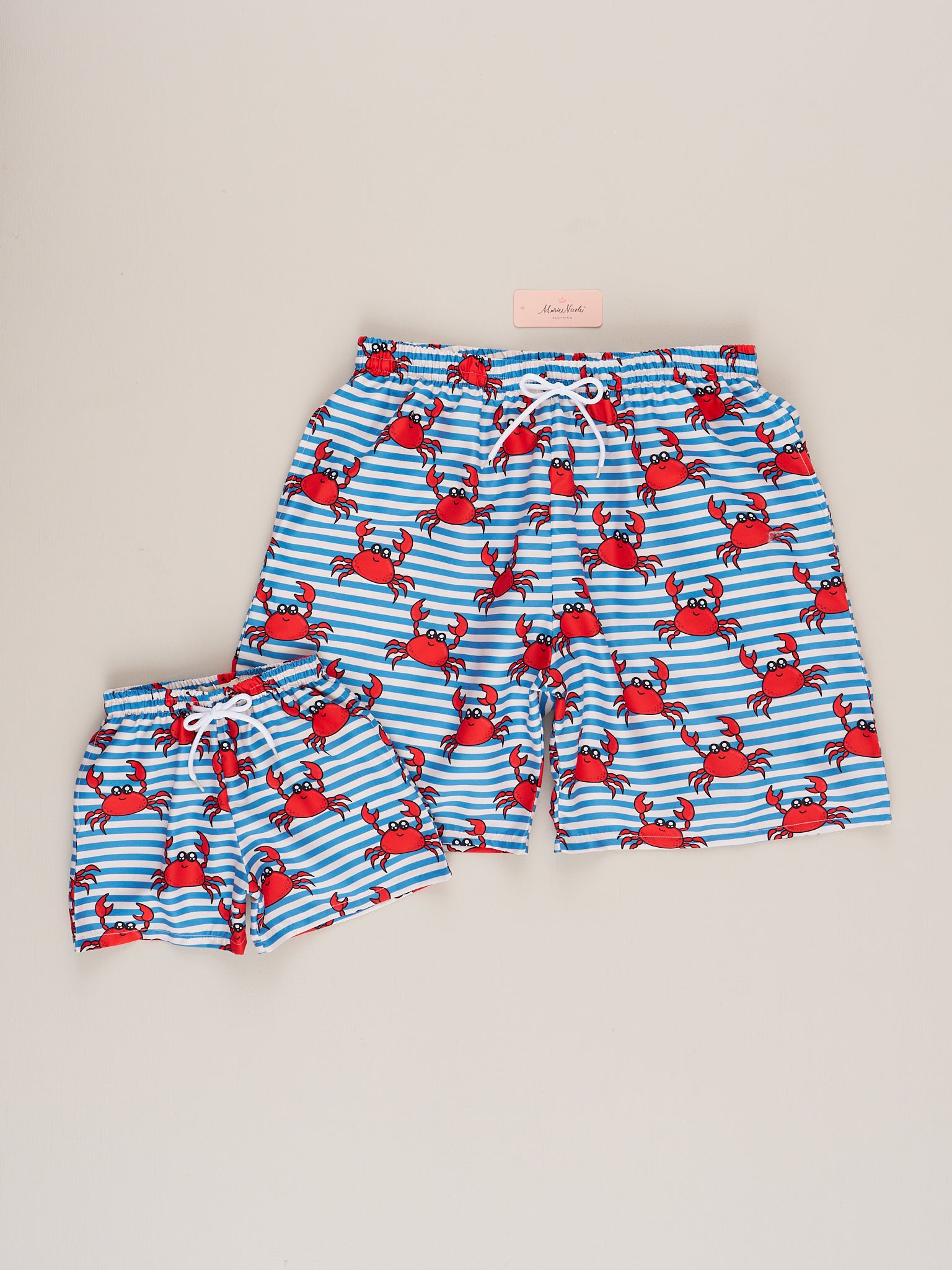 These Crabby Striped Swim Trunks are perfect for a day at the beach! The Dad & Me set allows for some fun matching with your little one. The blue stripes and playful crab print give off a fun, playful vibe. The elastic waistband and drawstring provide a comfortable and secure fit. From Marie Nicole Clothing.