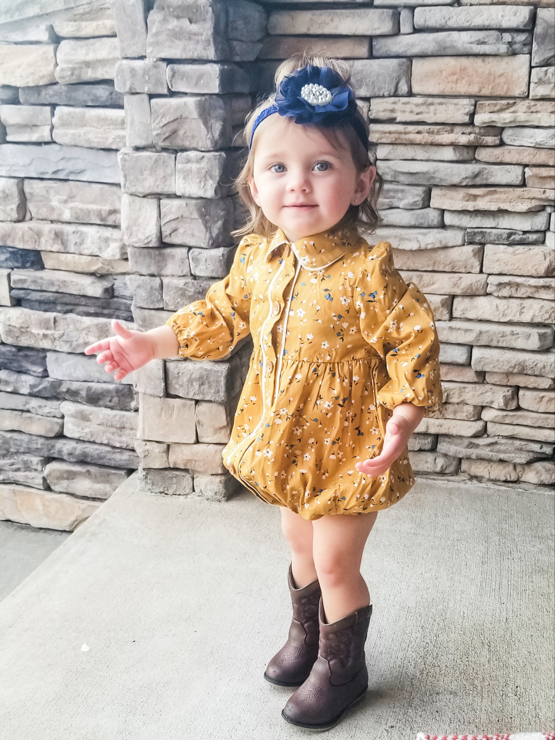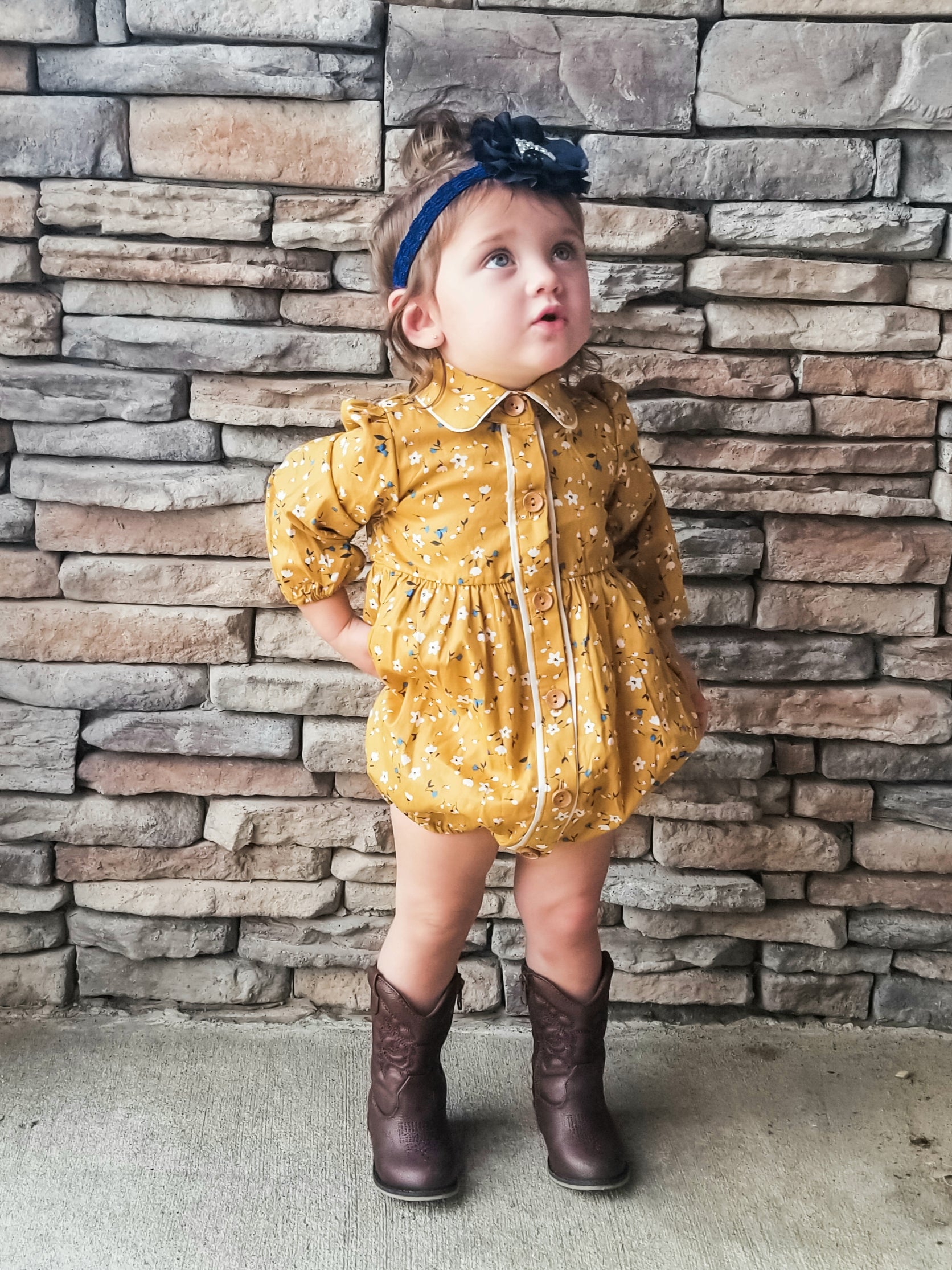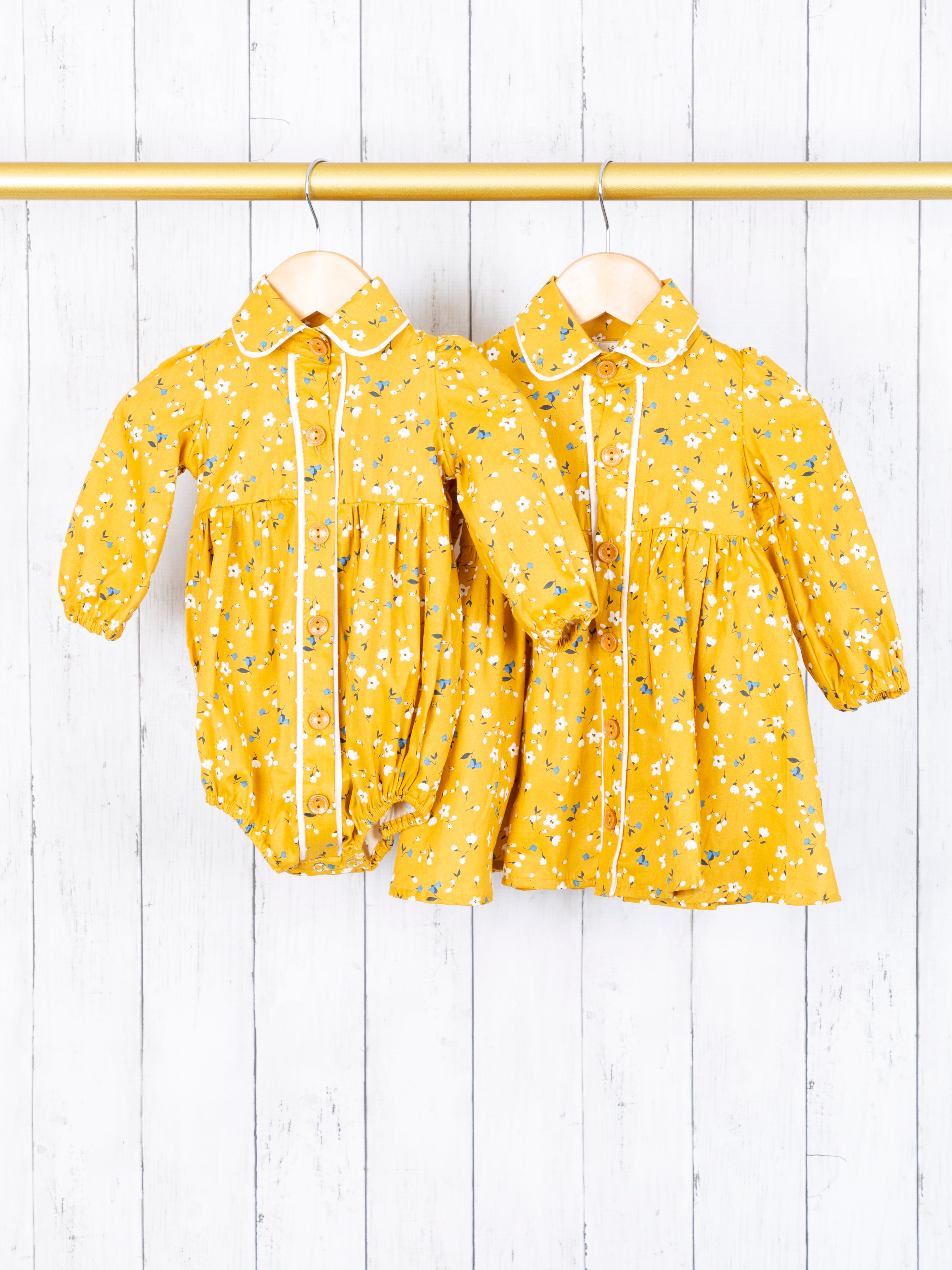 Mustard is the color of the season & this sister set is too cute! This romper features a peter pan collar, cinched sleeves, functional buttons, a pretty dainty floral print, & snap buttons for easy diaper changes.