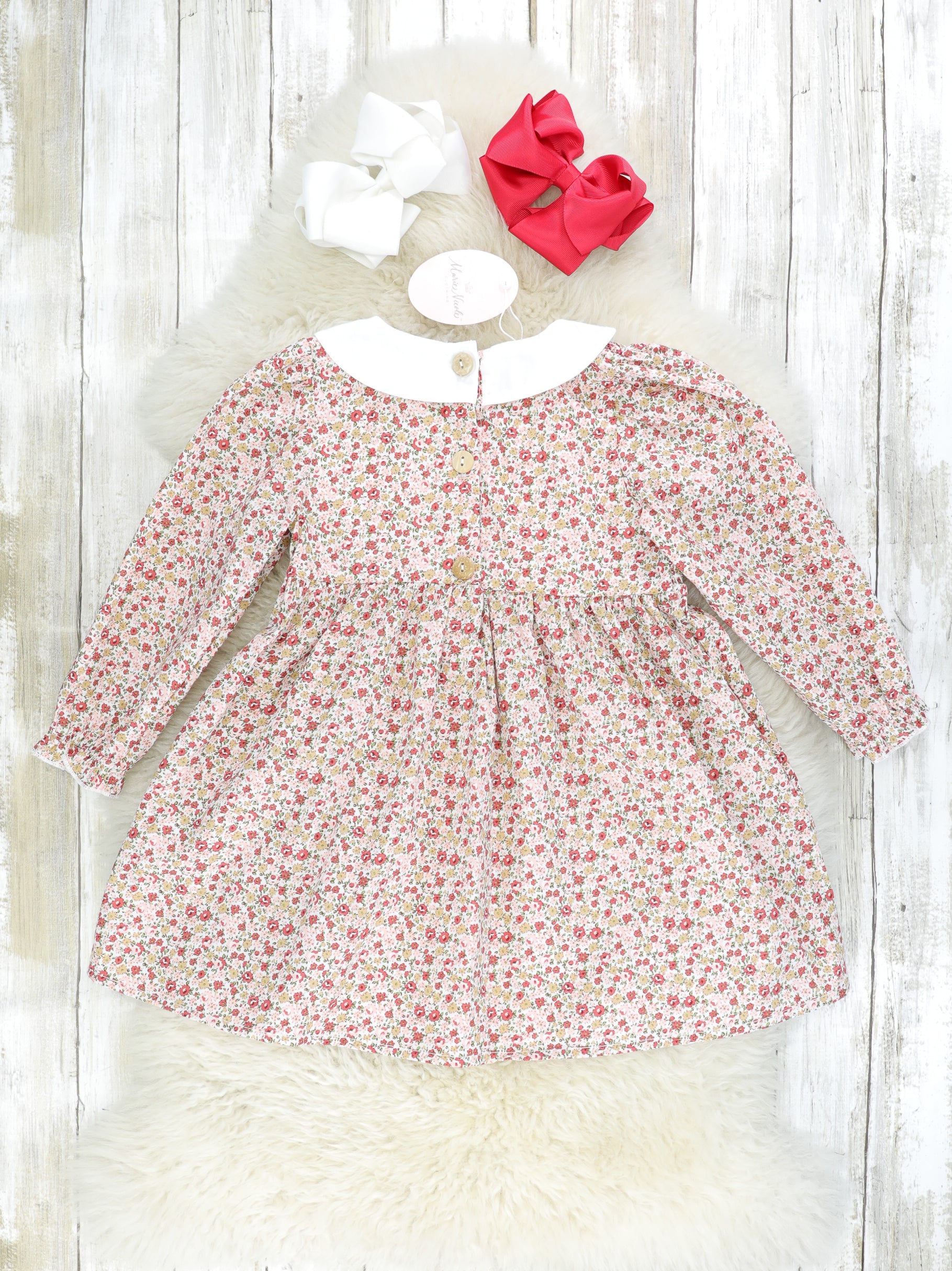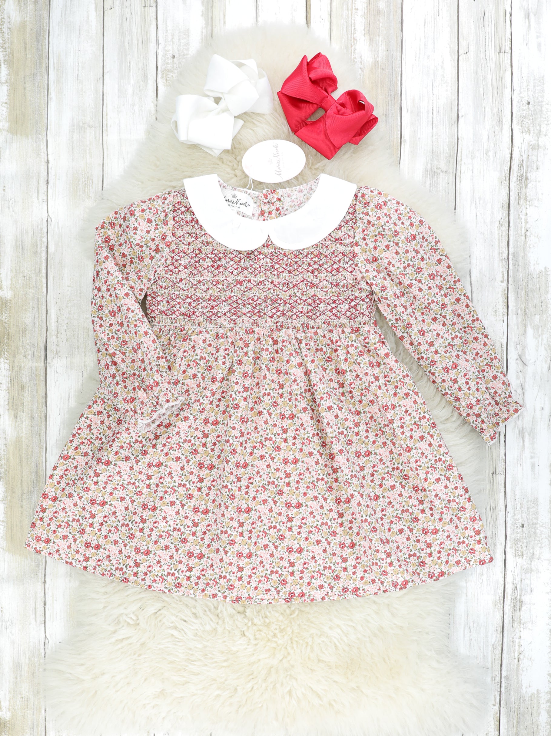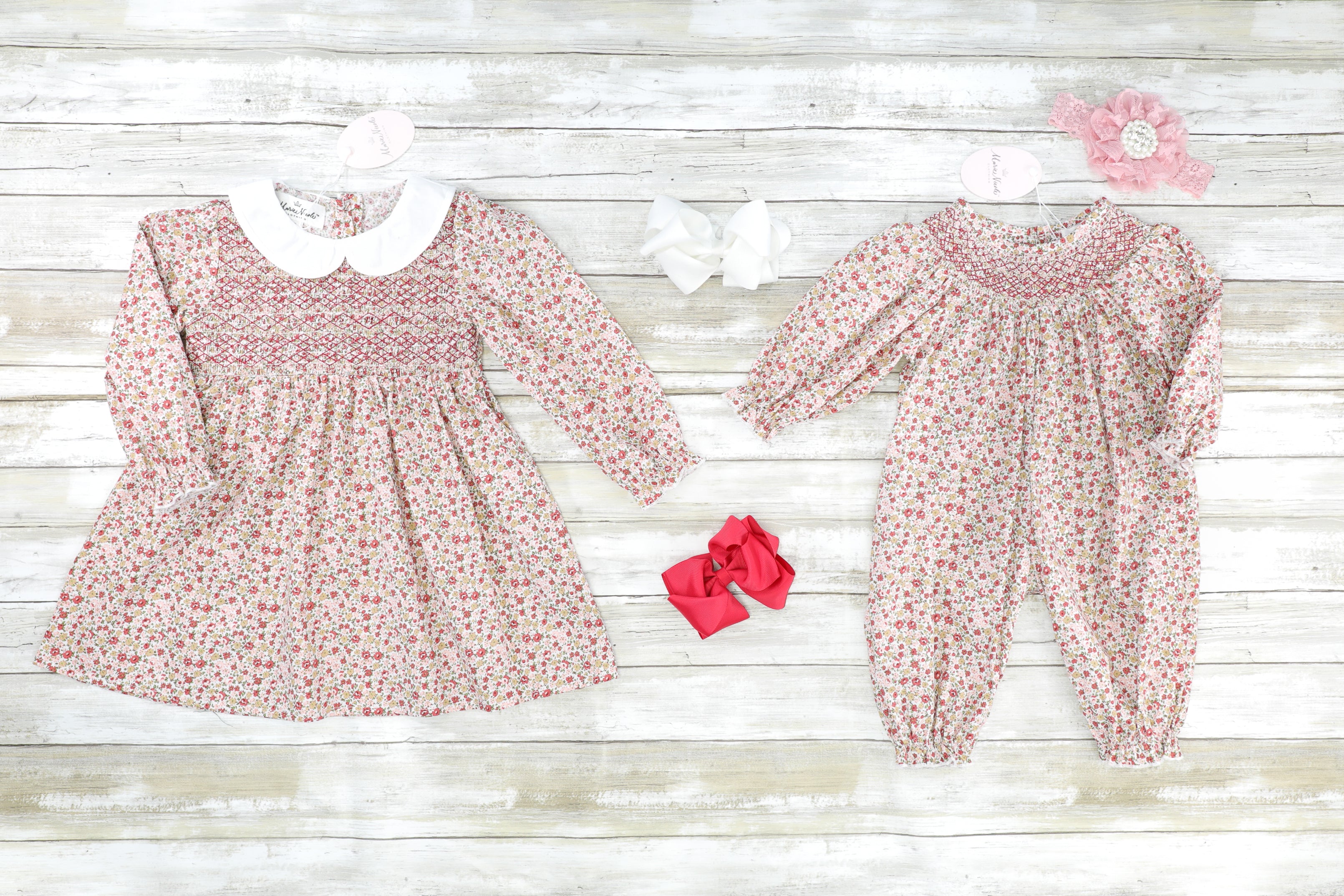 This sweet vintage set has something for all your girls! This dress features dainty florals, smocking, a peter pan collar, & cinches at the wrist.