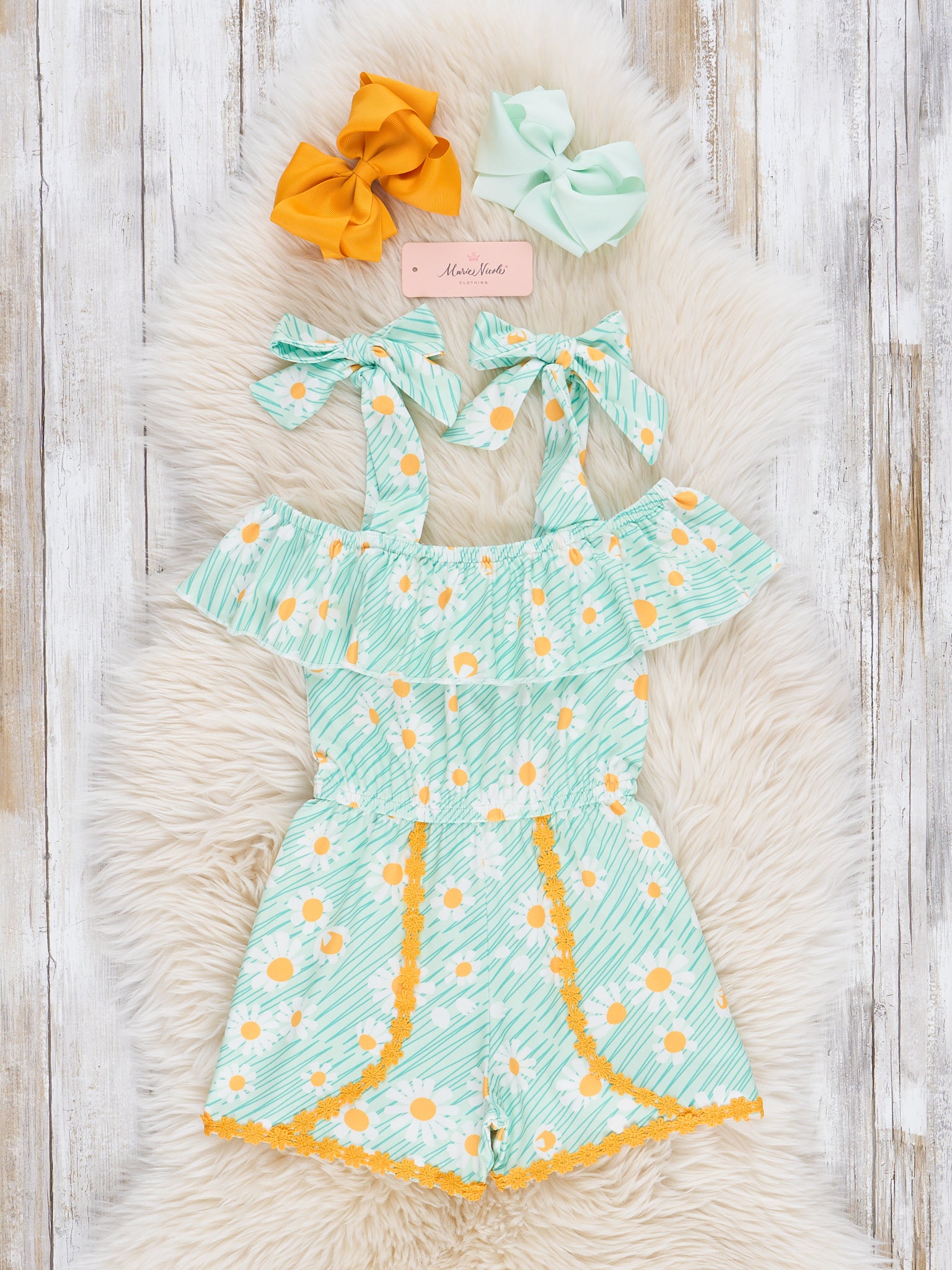 Get your little one ready for summer with our Daisies & Doodles Ruffle Romper! This green doodle and daisy print romper features a golden yellow trim and tie strap detail for a playful touch. Perfect for all their summer adventures by the beach or playing in the park. From Marie Nicole Clothing.