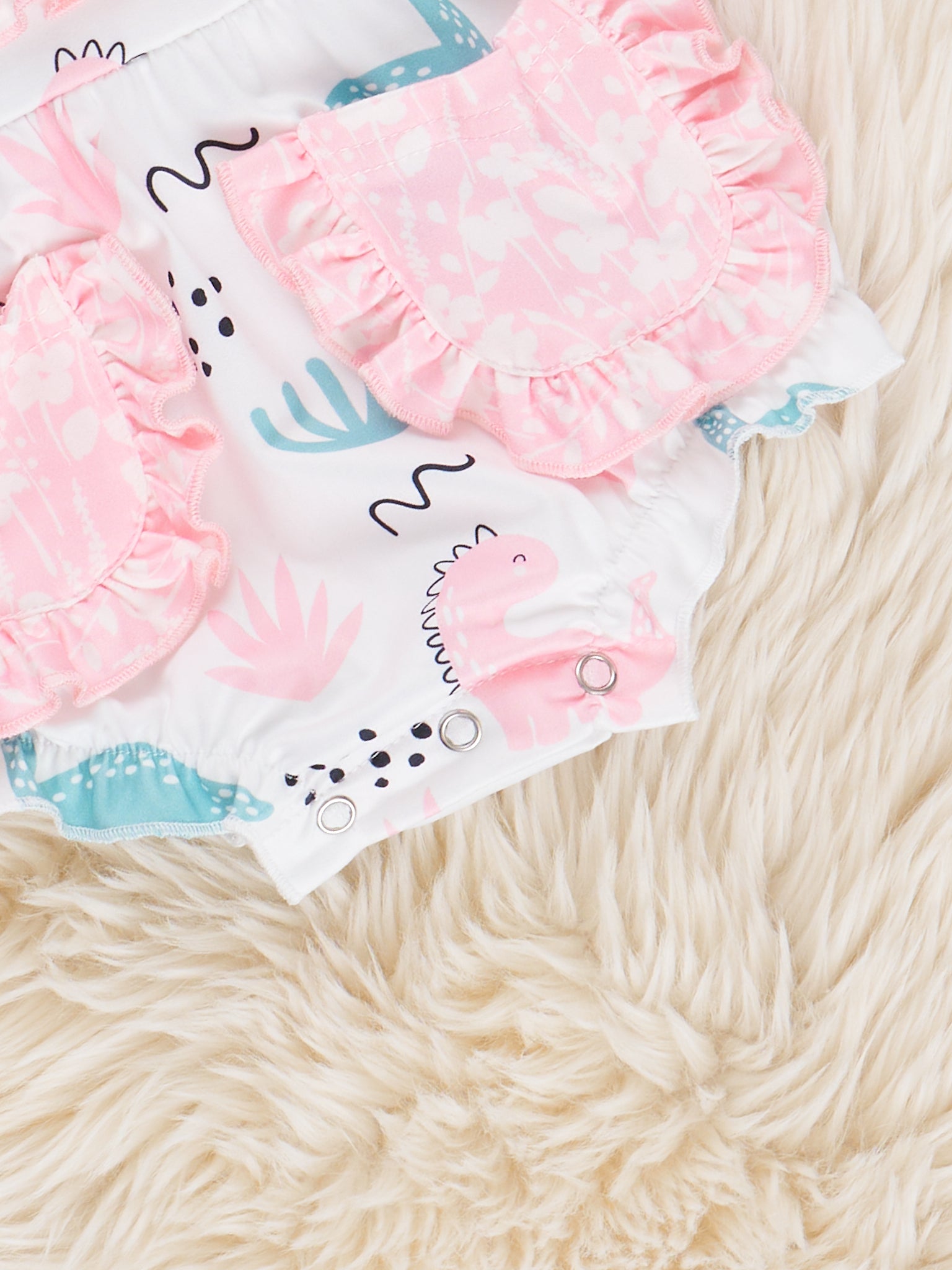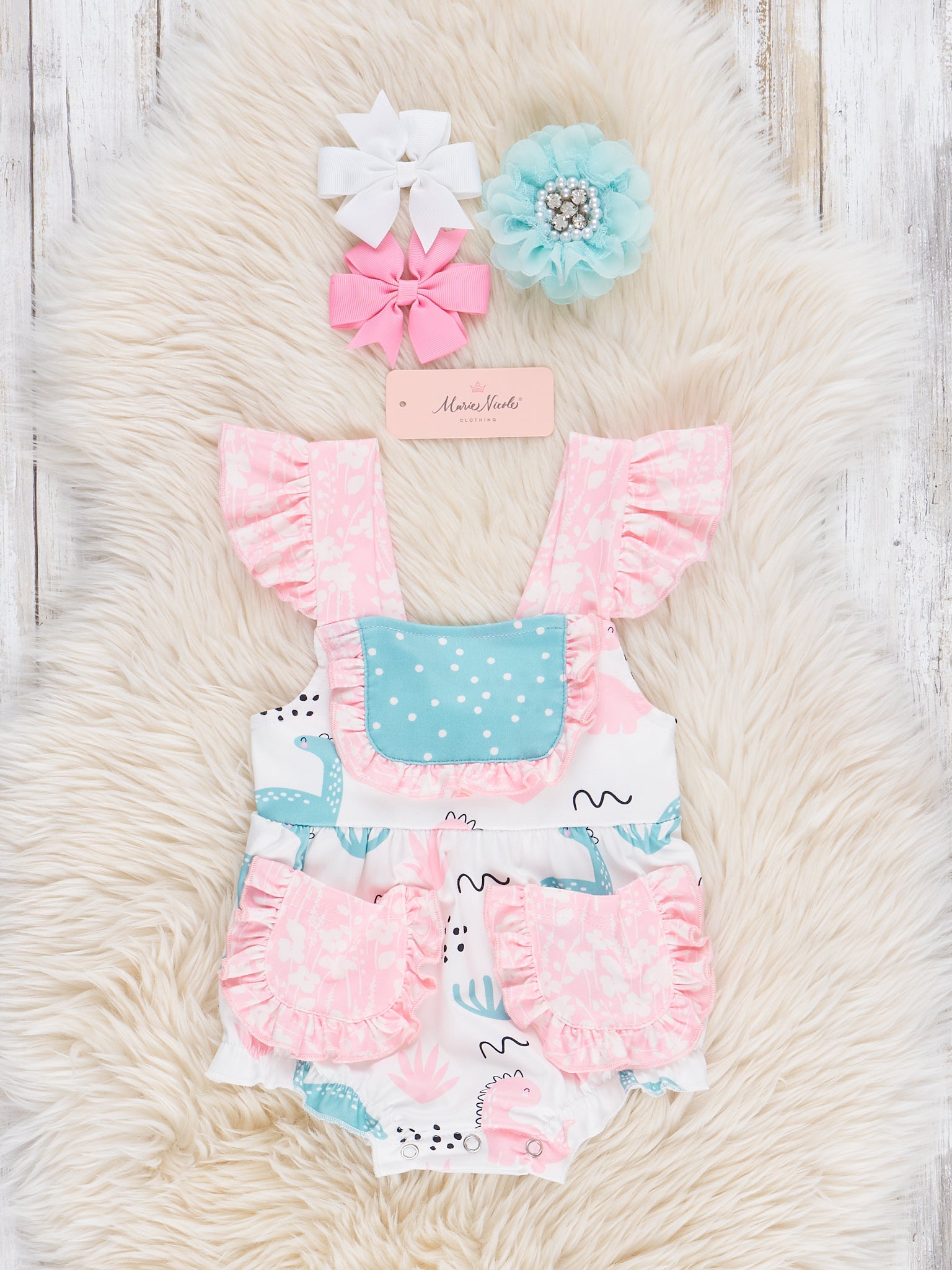 Unleash your little one's wild side with this Marie Nicole Clothing summer bubble! Featuring a playful mix of dinosaurs and polka dots, with a charming gingham ruffle trim and polka dot bib detail. Perfect for a sister set, this bubble will make your little girl stand out in style. Rawr-some!