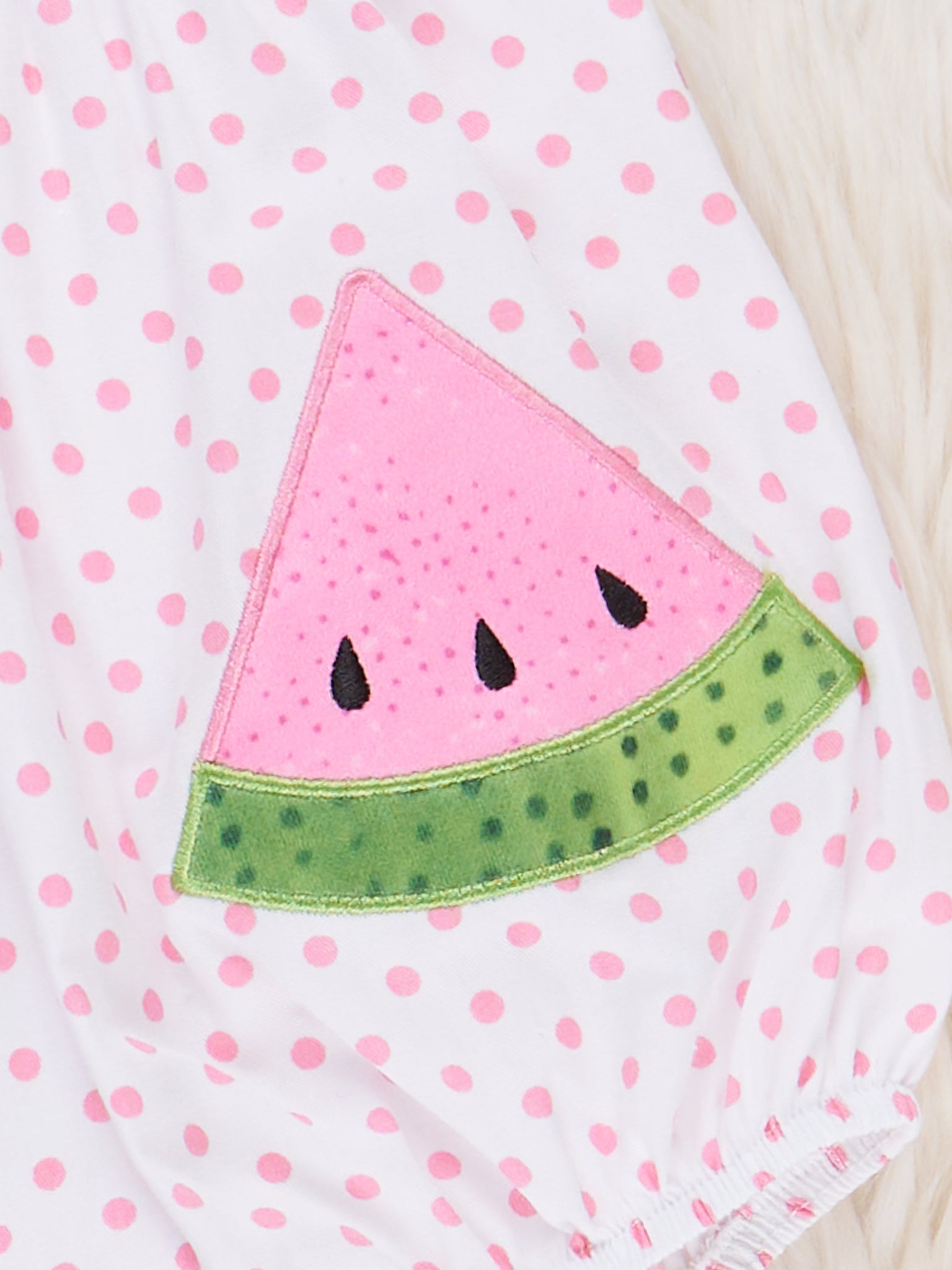 Sweeten up her summer wardrobe with the Dotty Watermelon Embroidered Flutter Bubble from Marie Nicole Clothing! This charming bubble features a playful polka dot pattern and vibrant watermelon embroidery that captures the essence of warm-weather fun. The ruffle-trimmed sleeves add a touch of whimsy and flair, perfect for picnics, playdates, or picture-perfect moments.