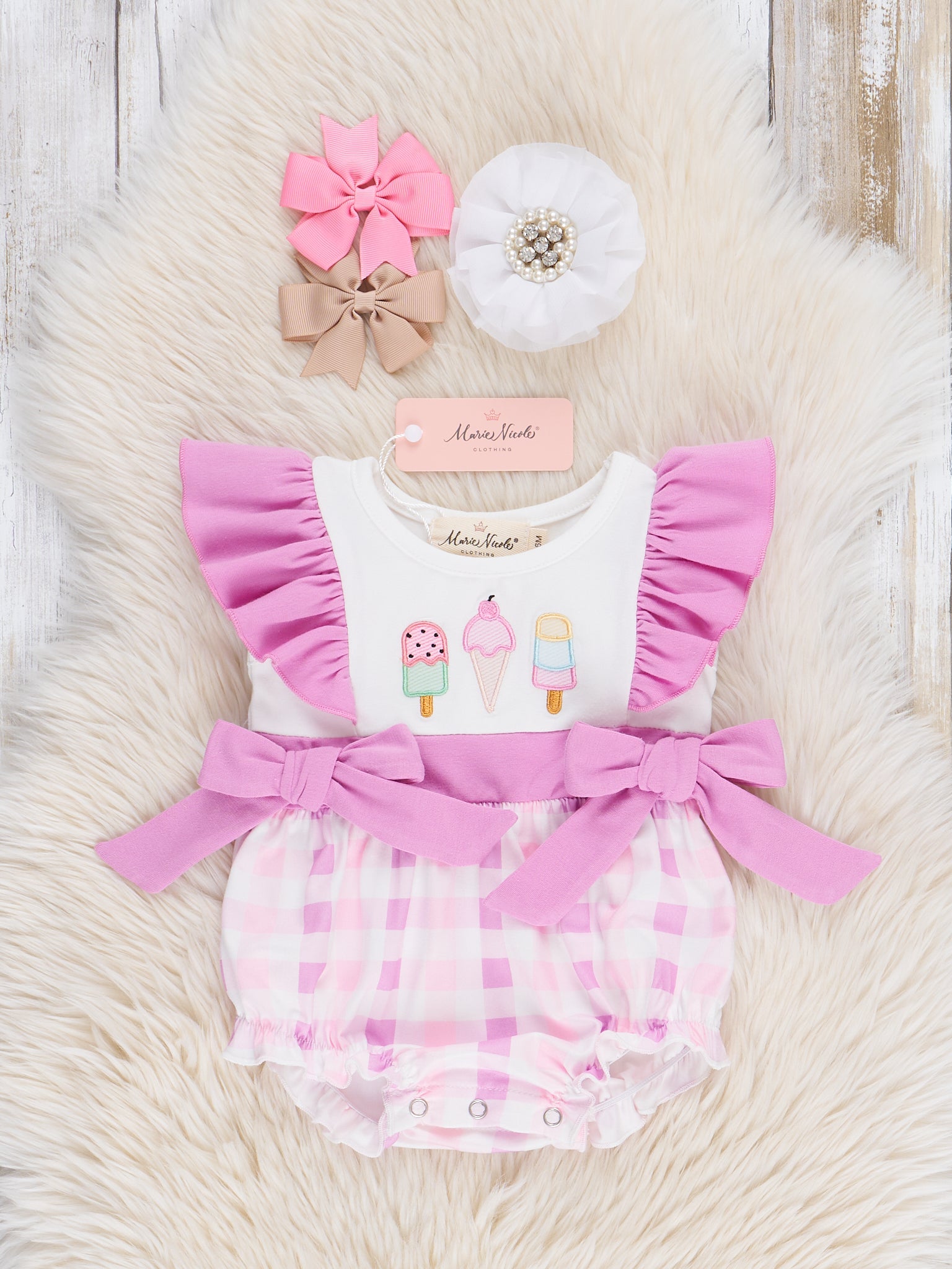 Get ready to scoop up some summer fun with our Embroidered Ice Cream Plaid Ruffle Bubble. Perfect for your little fashionista, this bubble features adorable ruffle and bows detail, embroidered ice cream treats, and a playful plaid ruffle bottom. Get the matching sister set from Marie Nicole Clothing for a double scoop of cuteness!